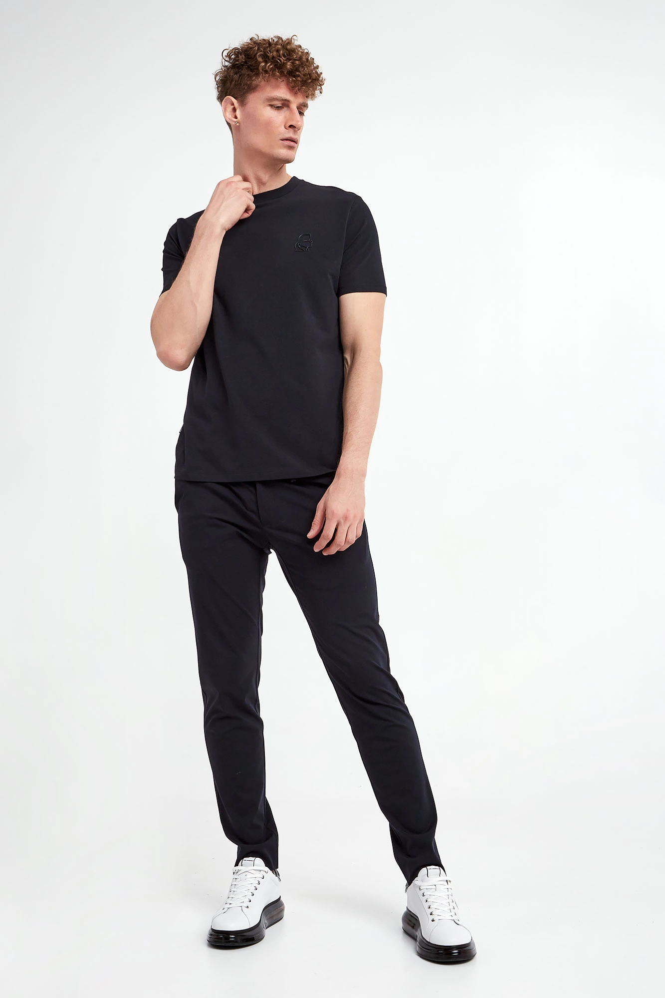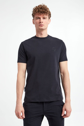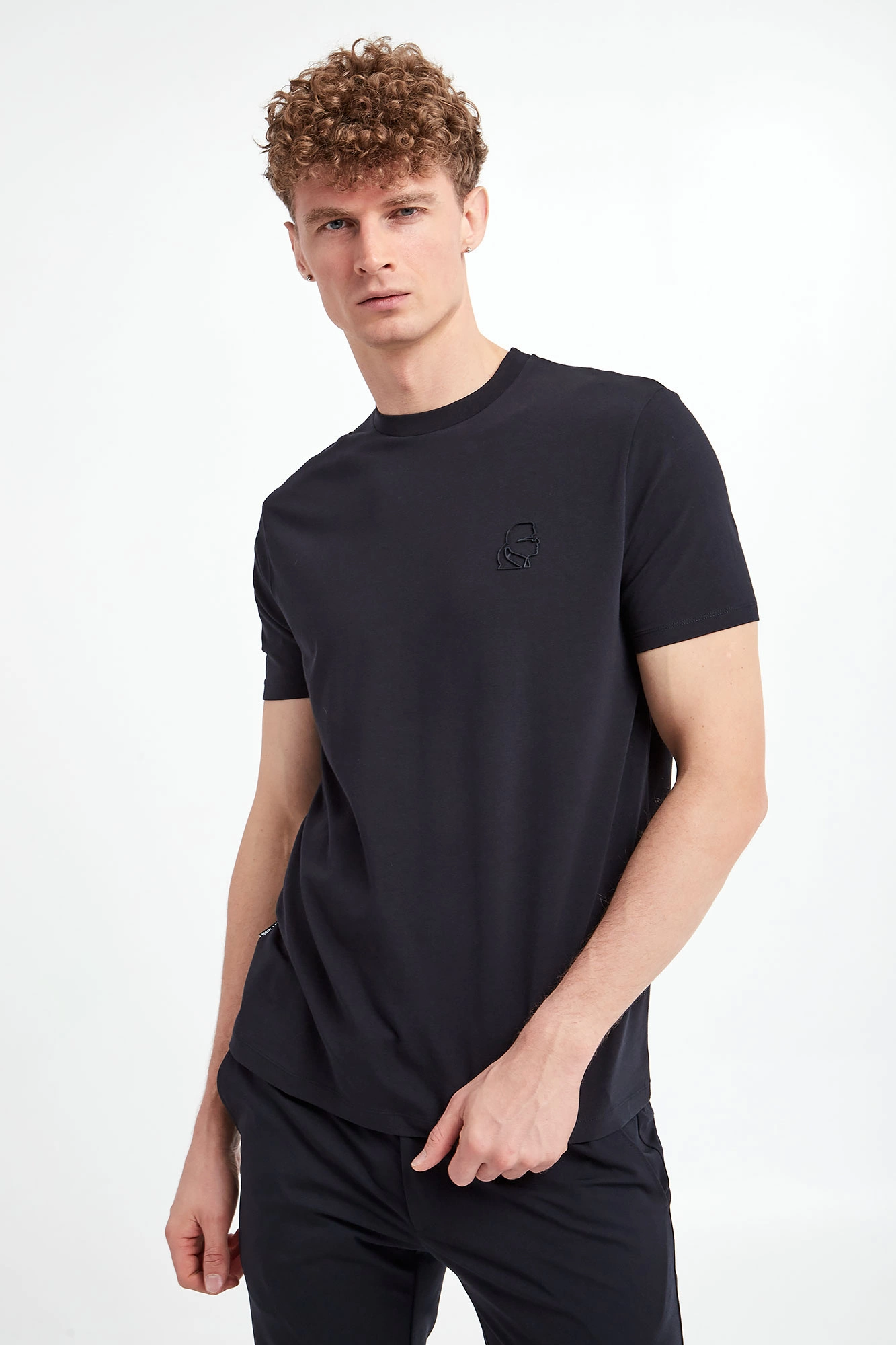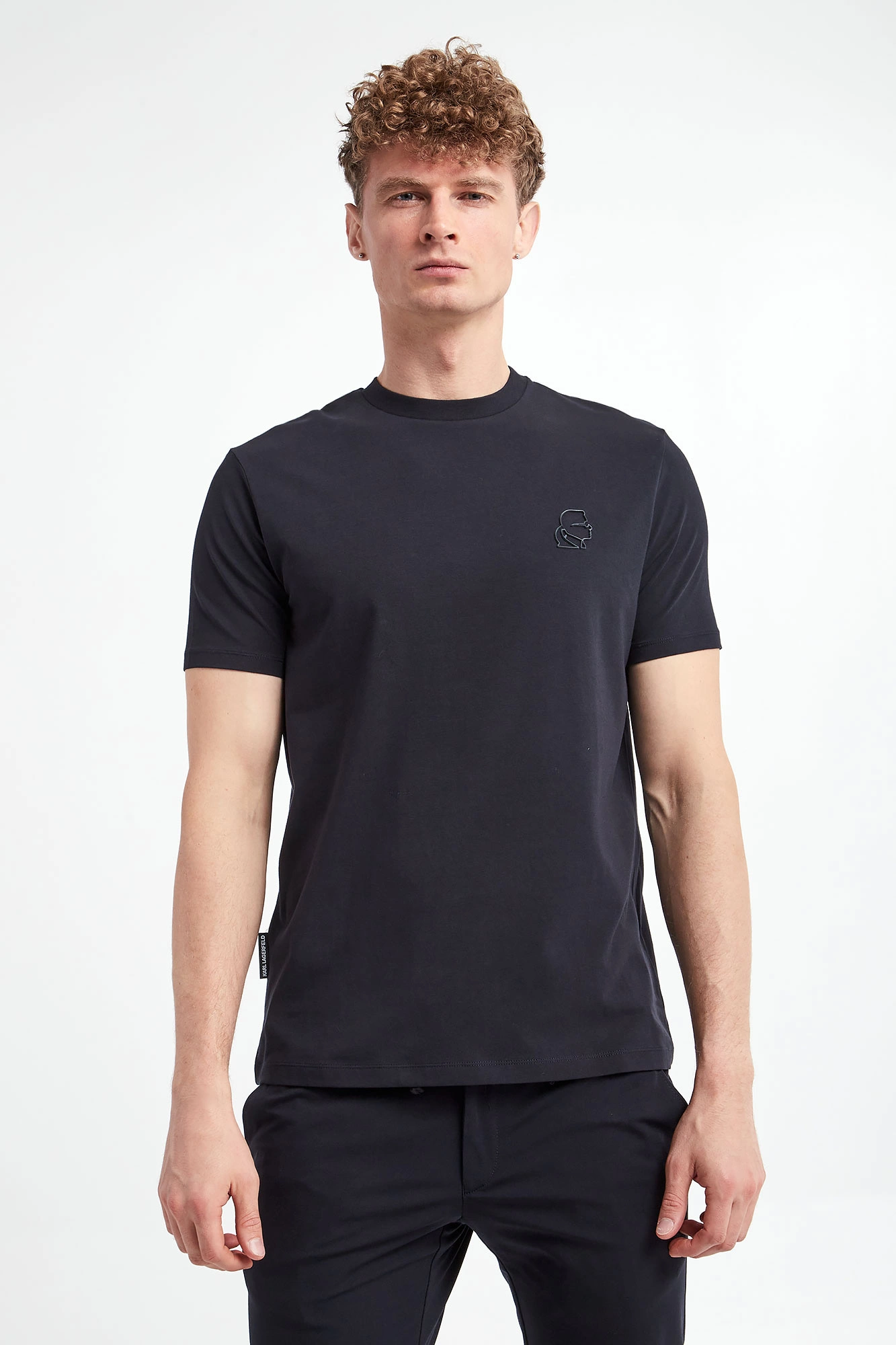 T-shirt marki Karl Lagerfeld w granatowym kolorze. Z przodu gumowa aplikacja z bocznym wizerunkiem założyciela marki. Z tyłu na linii karku nadruk w postaci nazwy marki. Dekolt wykończony gładkim ściągaczem. Krótkie rękawki i dół wykończone lamówką. Model z linii "Karl Cares", która wspiera zrównoważoną modę. Fason slim. Wykonany z tkaniny bawełnianej z domieszką elastanu.