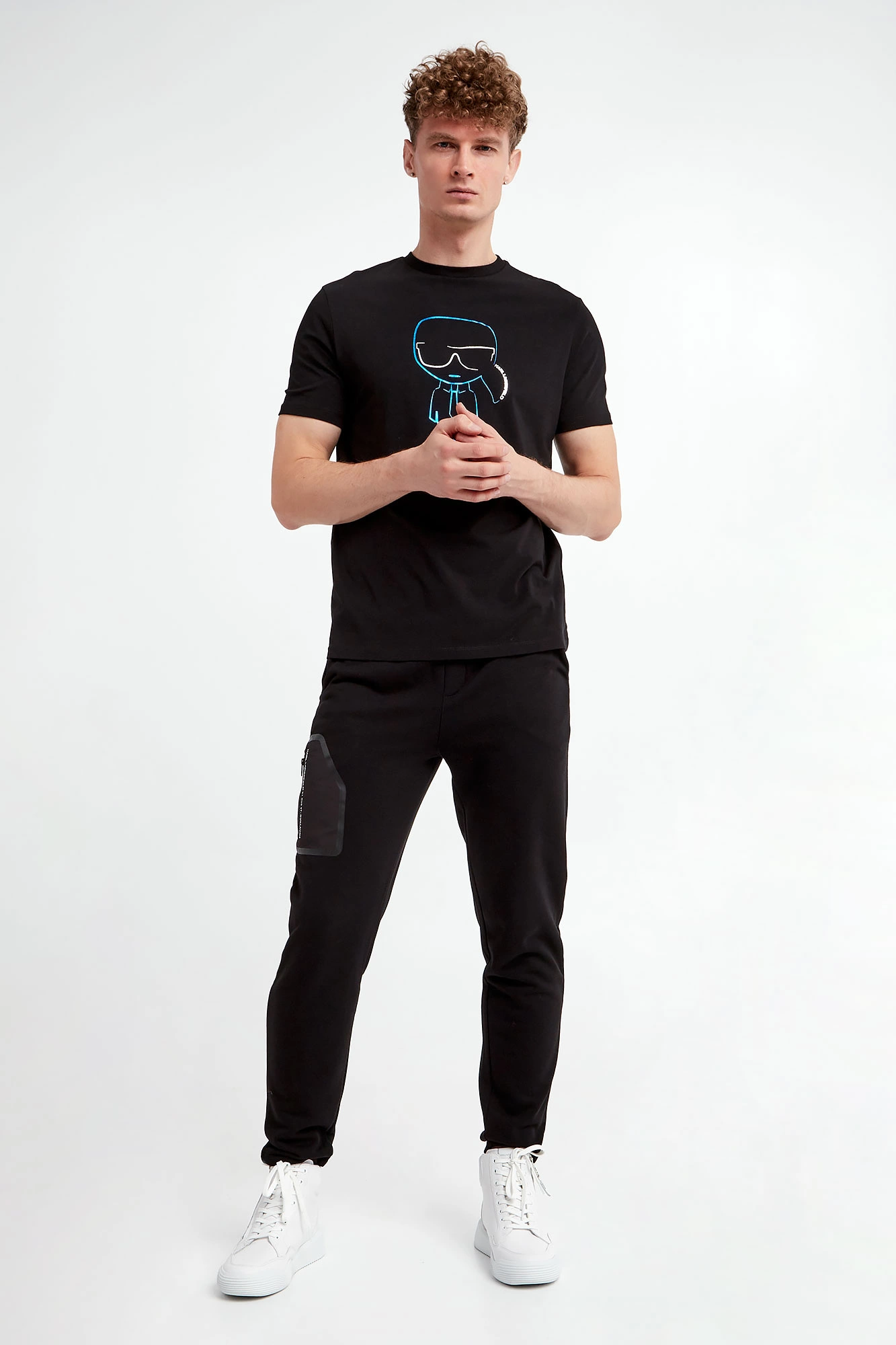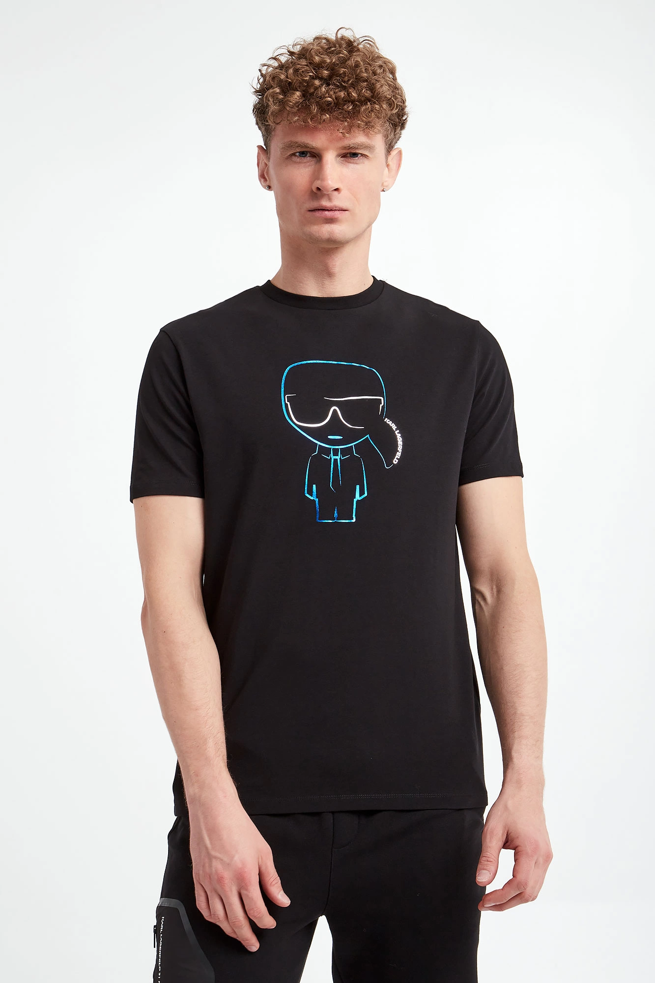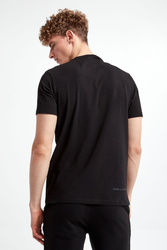 T-shirt marki Karl Lagerfeld w czarnym kolorze. Model z linii "Karl Cares", która wspiera zrównoważoną modę. Fason slim. Z przodu duży, gumowany nadruk w kolorze niebiesko-białym z logo marki. Dekolt wykończony gładkim ściągaczem. Krótkie rękawki i dół zakończone lamówką.