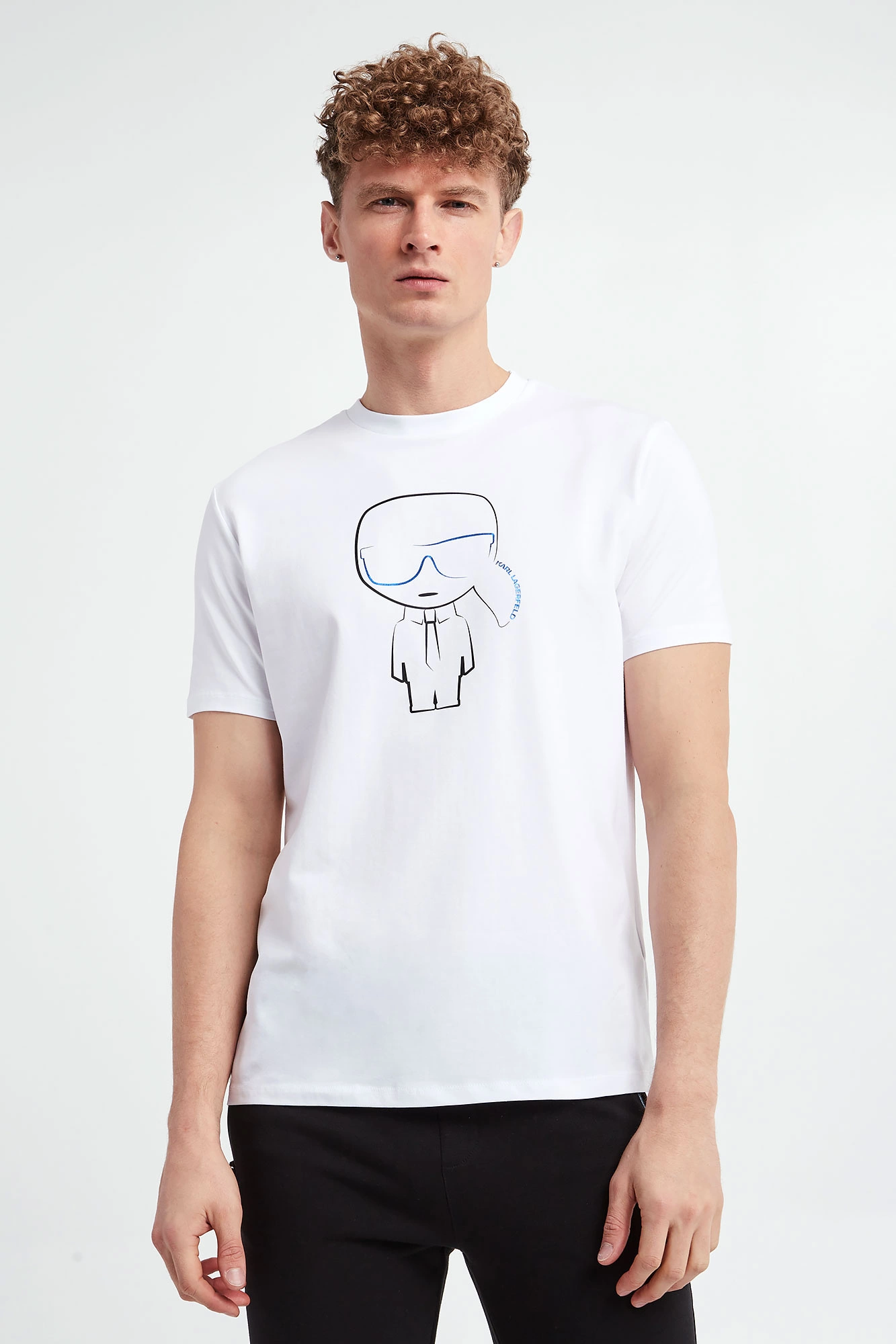 T-shirt marki Karl Lagerfeld w białym kolorze. Model z linii "Karl Cares", która wspiera zrównoważoną modę. Fason slim. Z przodu duży, gumowany nadruk w kolorze niebiesko-czarnym z logo marki. Dekolt wykończony gładkim ściągaczem. Krótkie rękawki i dół zakończone lamówką.