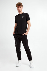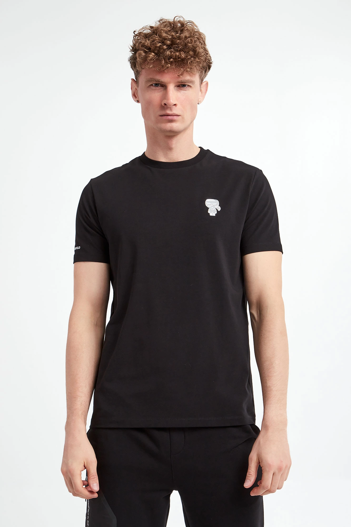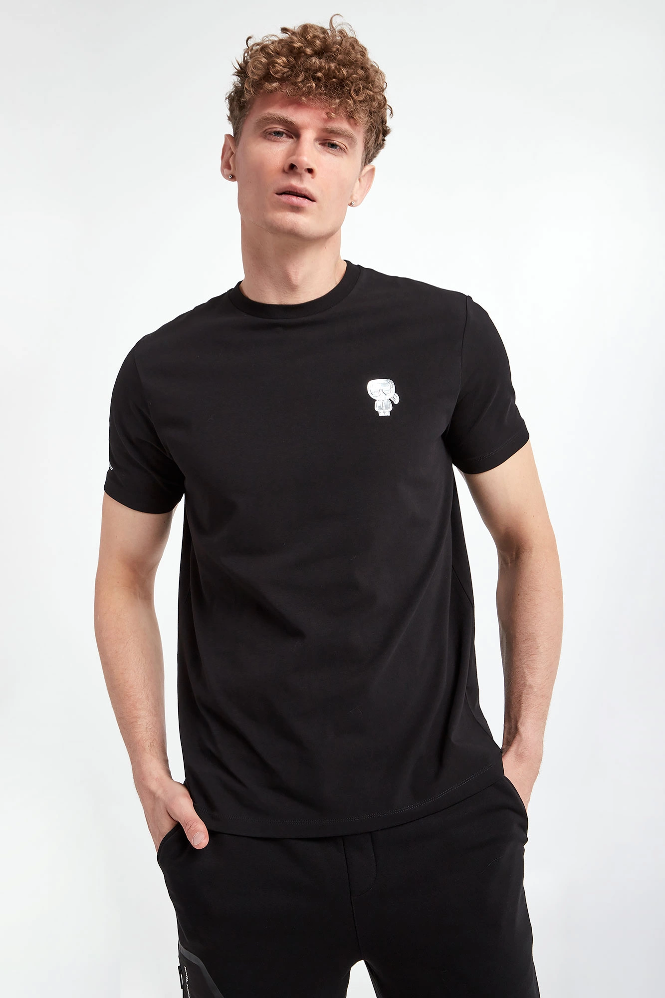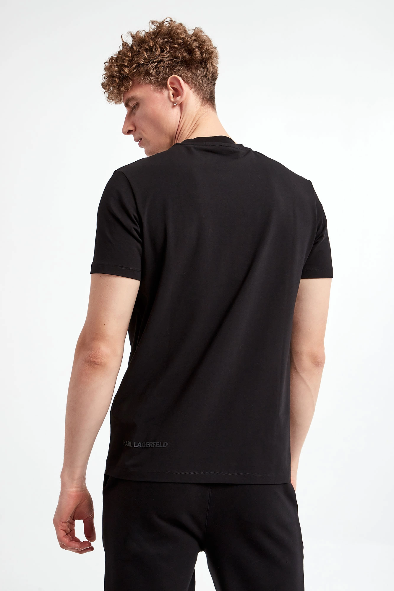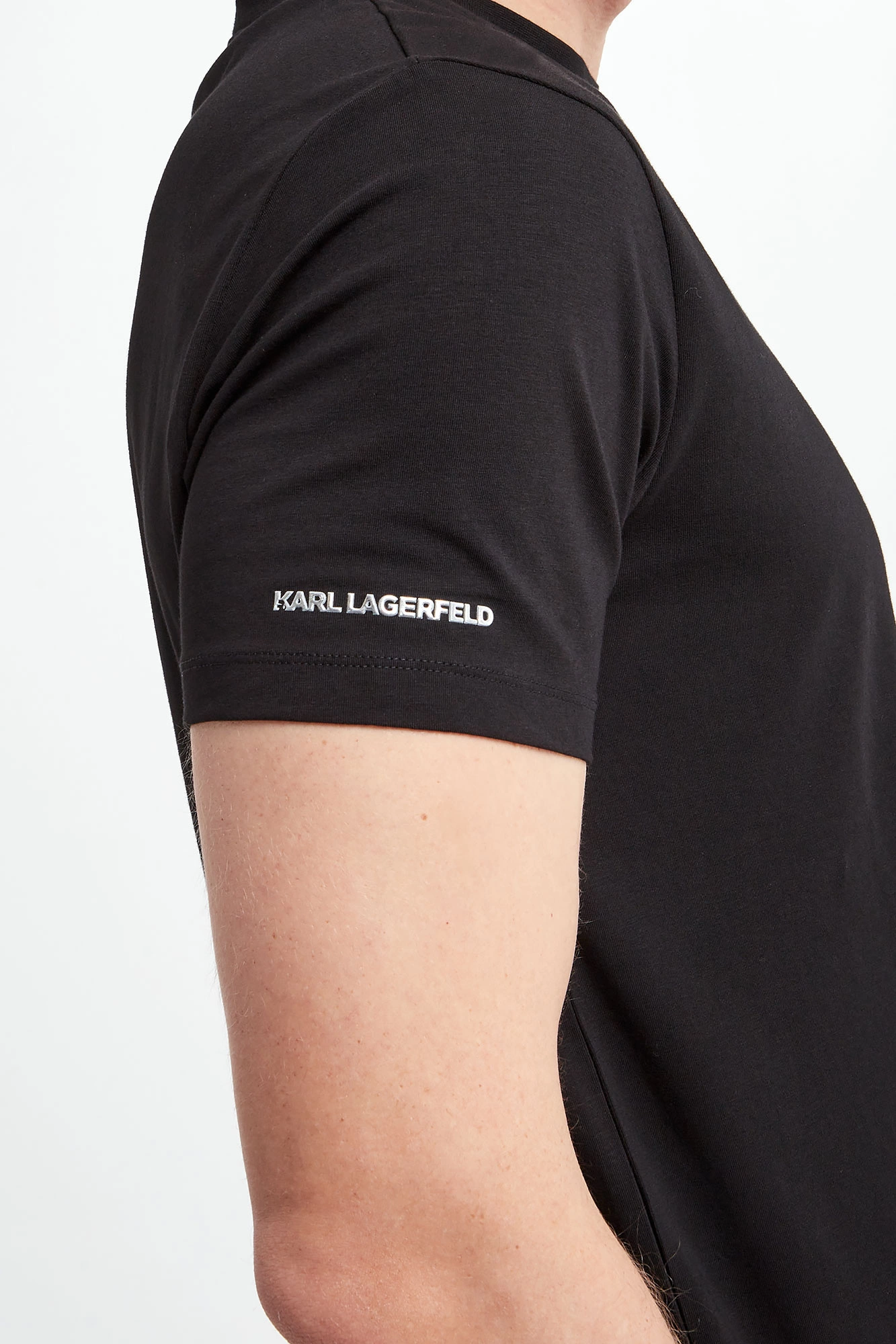 T-shirt marki Karl Lagerfeld w czarnym kolorze. Model z linii "Karl Cares", która wspiera zrównoważoną modę. Z przodu srebrna, gumowa aplikacja z wizerunkiem założyciela marki. Na prawym rękawie lekko mieniący się, srebrny gumowy napis w postaci nazwy marki. Dekolt wykończony gładkim ściągaczem. Krótkie rękawki i dół wykończone lamówką. Wykonany z tkaniny bawełnianej z domieszką elastanu. Fason slim.
