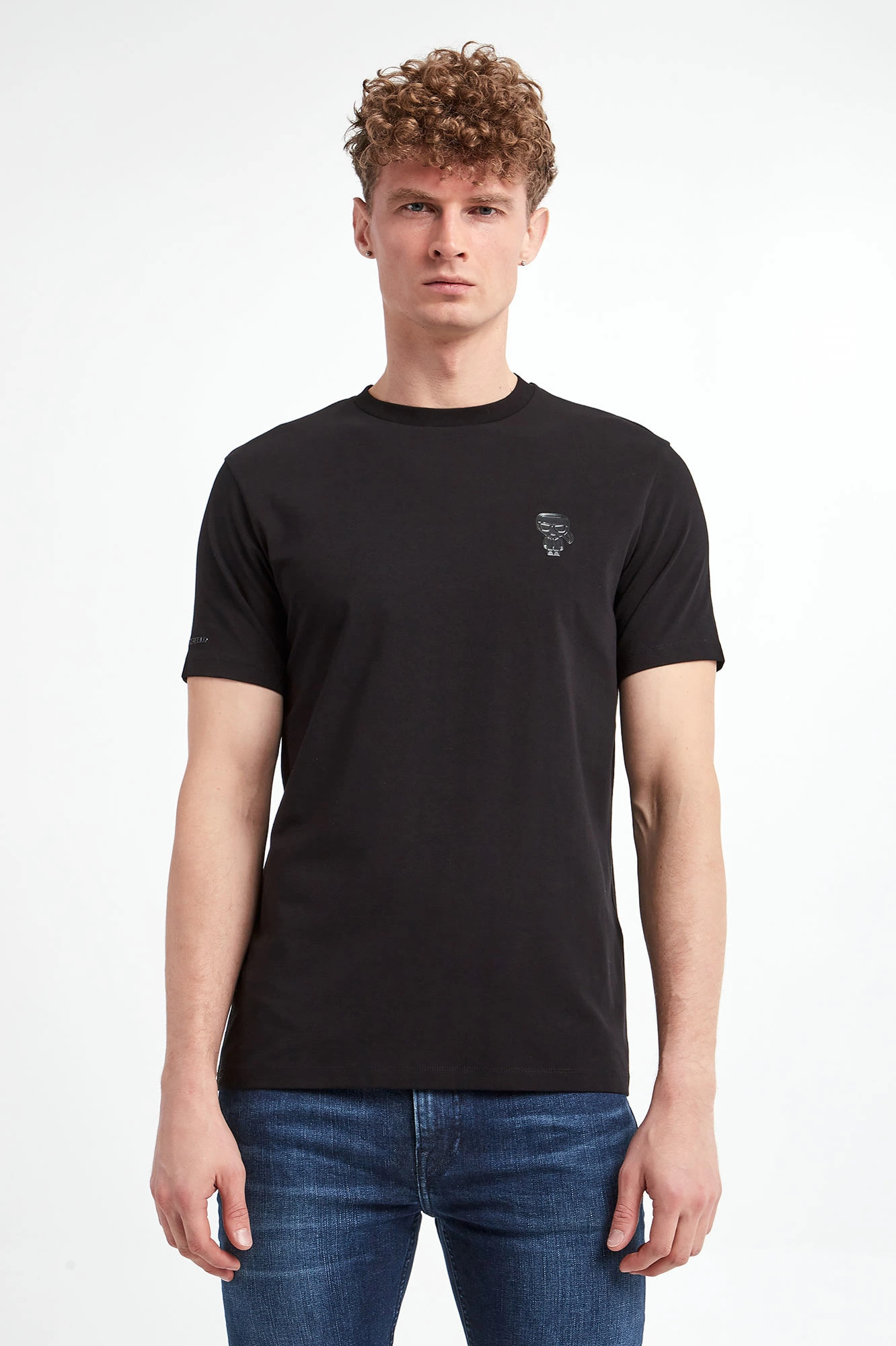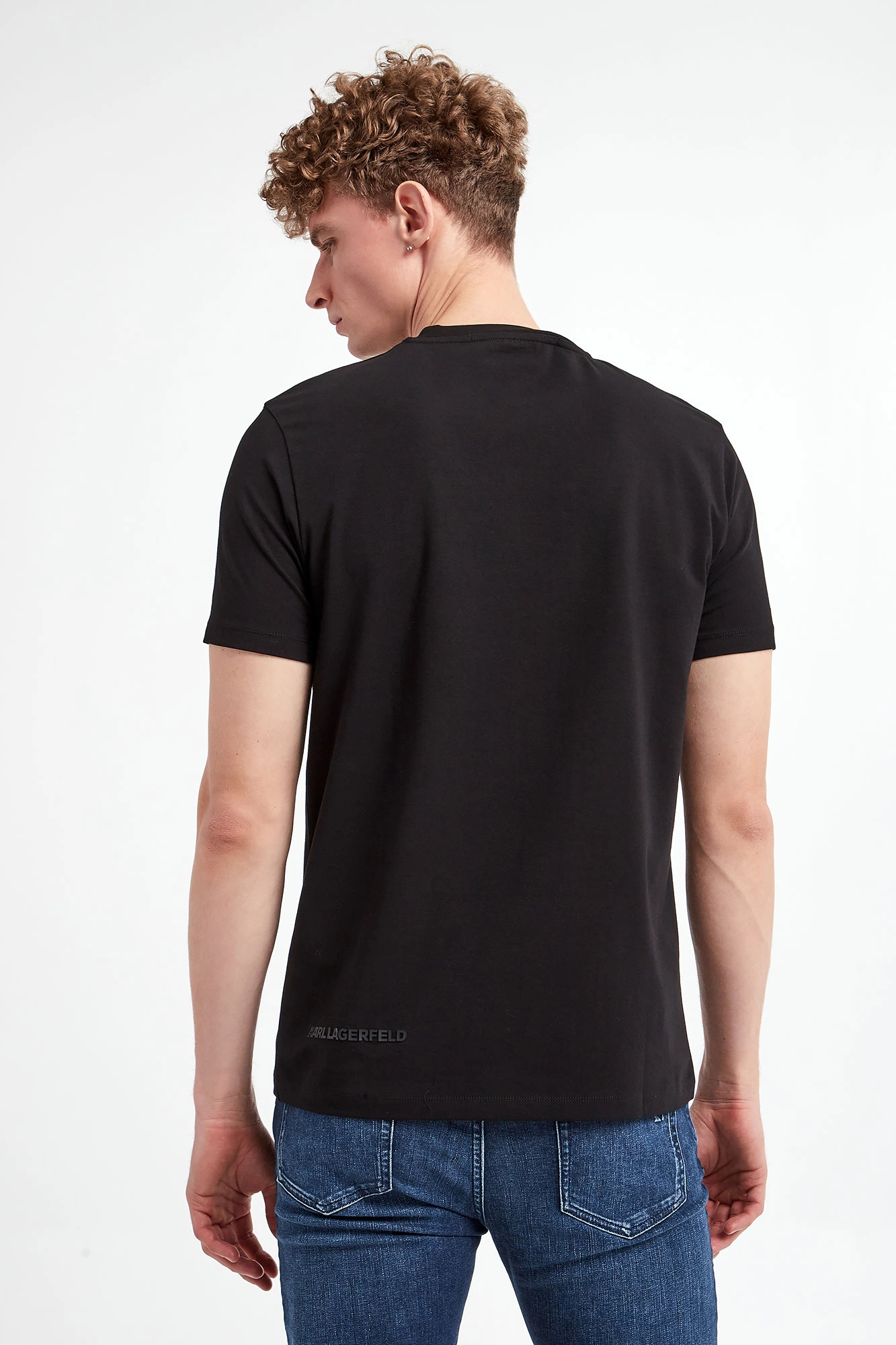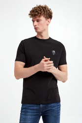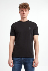 T-shirt marki Karl Lagerfeld w czarnym kolorze. Model z linii "Karl Cares", która wspiera zrównoważoną modę. Z przodu czarna, gumowa aplikacja z wizerunkiem założyciela marki. Na prawym rękawie lekko mieniący się, czarny, gumowy napis w postaci nazwy marki. Dekolt wykończony gładkim ściągaczem. Krótkie rękawki i dół wykończone lamówką. Wykonany z tkaniny bawełnianej z domieszką elastanu. Fason slim.
