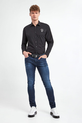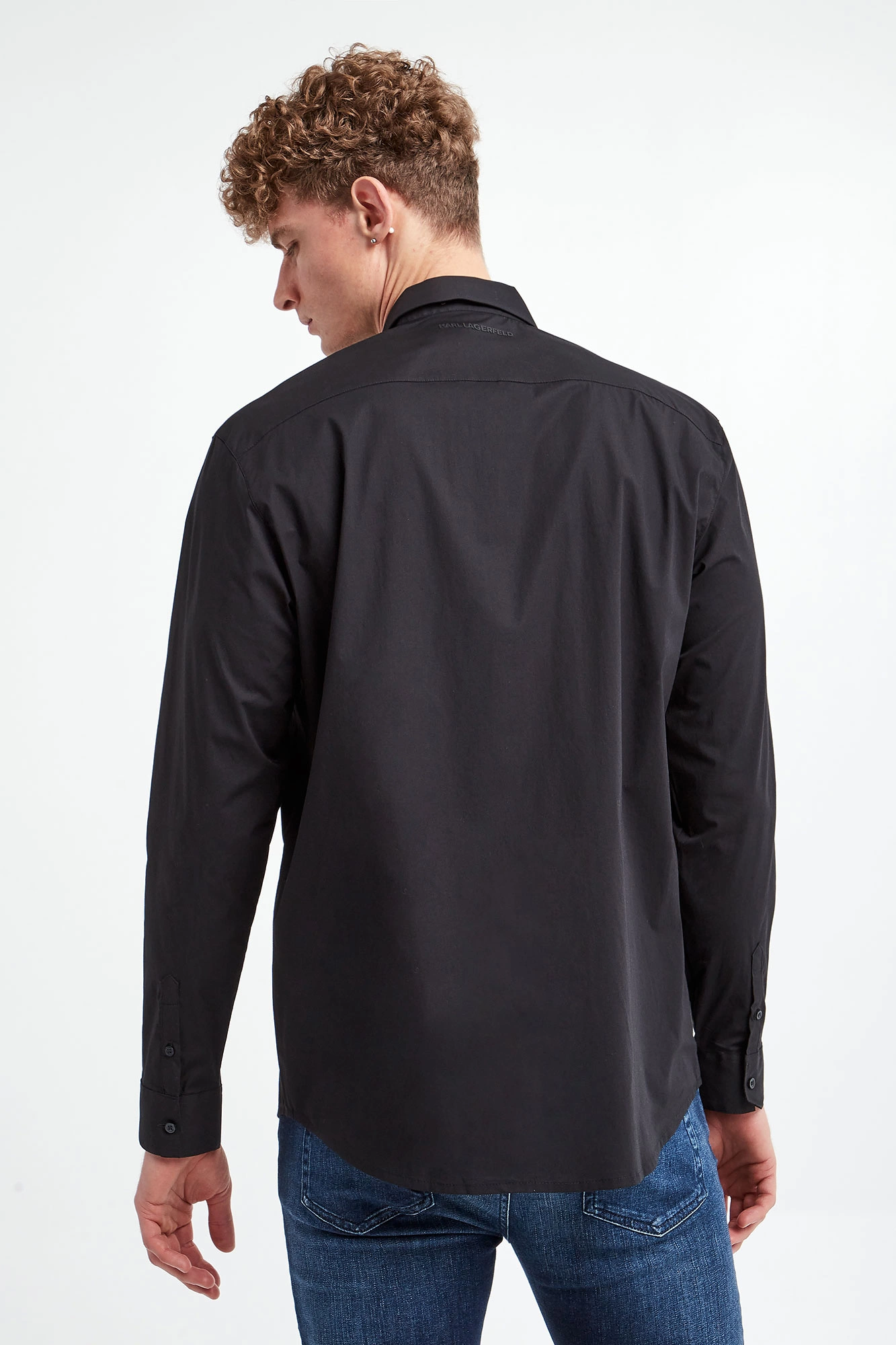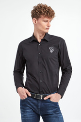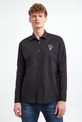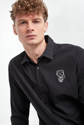 Koszula marki Karl Lagerfeld w czarnym kolorze. Wykonana z nieco elastycznej, popelinowej bawełny. Klasyczny kołnierz. Zapinana za pomocą perłowych, sygnowanych guzików. Z przodu gumowany nadruk w kształcie wizerunku założyciela marki w białym kolorze. Długie rękawy zakończone mankietami zapinanymi za pomocą guzików. Fason slim.
