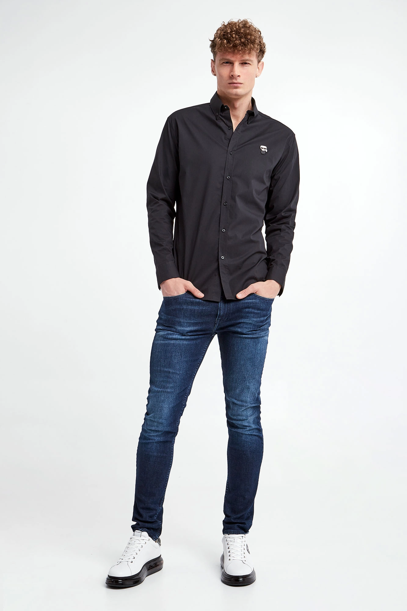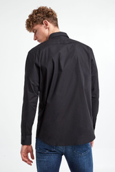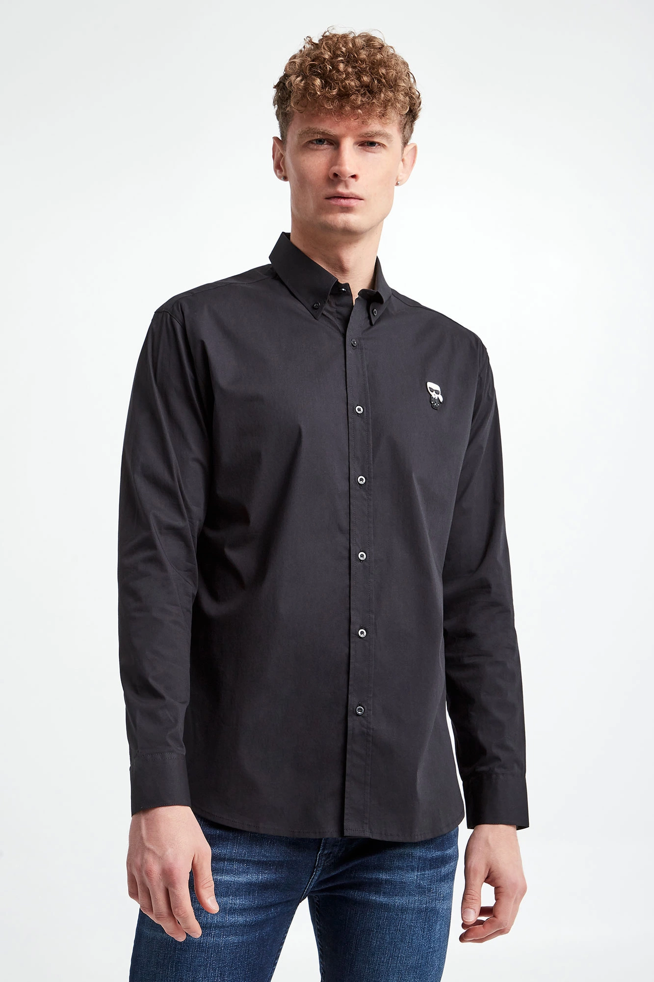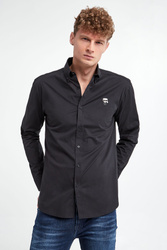 Koszula marki Karl Lagerfeld w czarnym kolorze. Wykonana z nieco elastycznej, popelinowej bawełny. Klasyczny kołnierz. Zapinana za pomocą sygnowanych guzików. Z przodu gumowana aplikacja w postaci wizerunku założyciela marki. Długie rękawy zakończone mankietami zapinanymi za pomocą guzików. Fason slim.