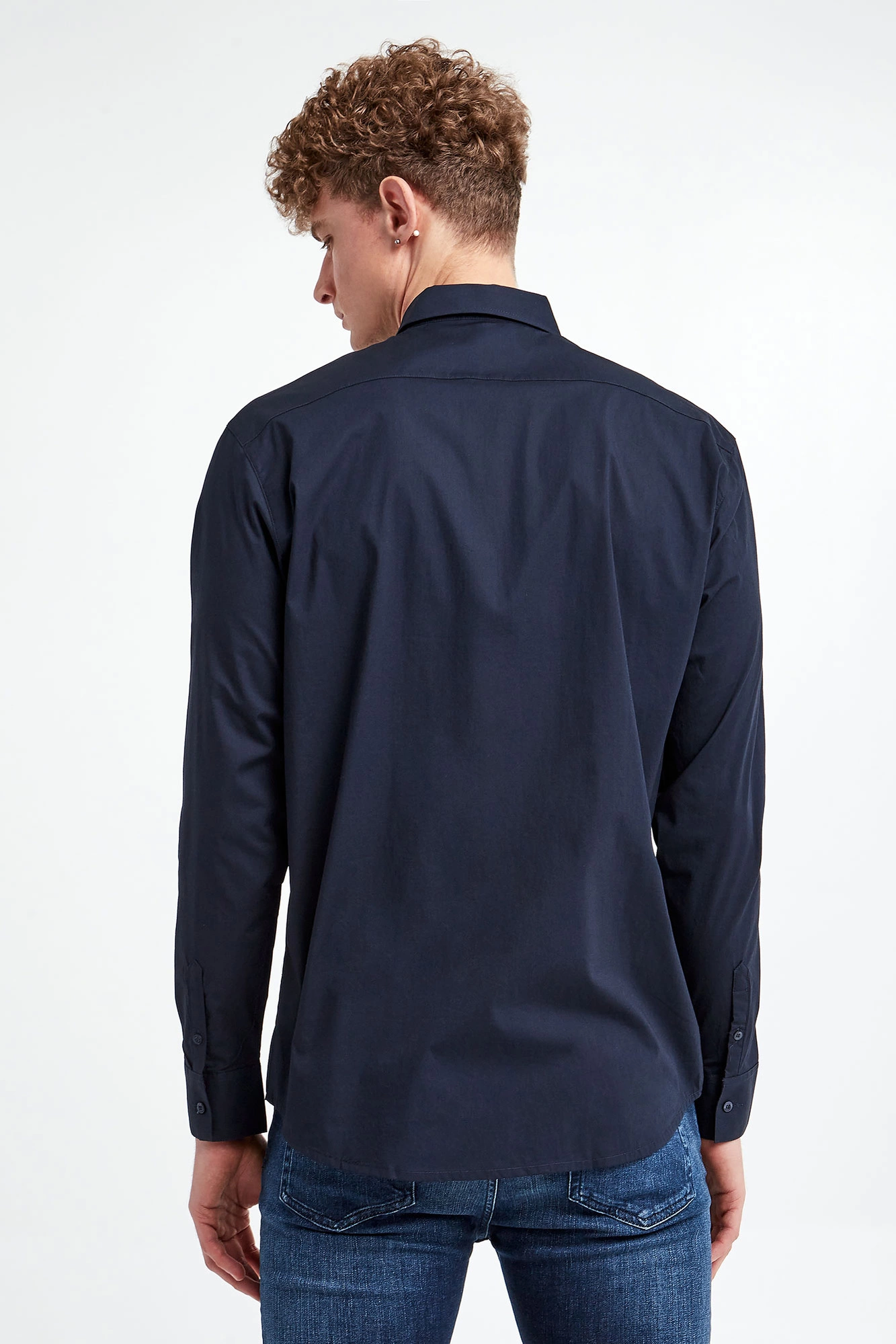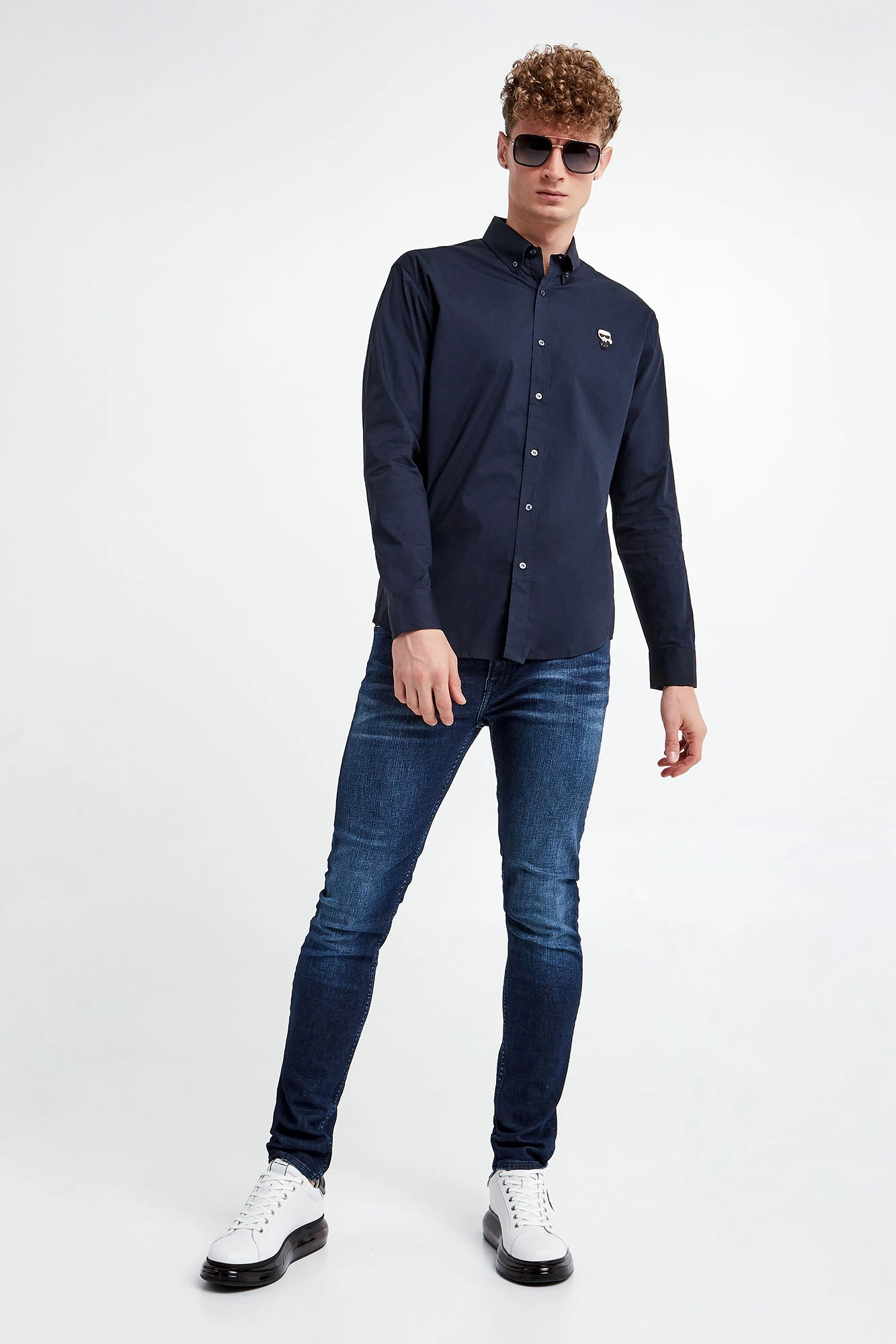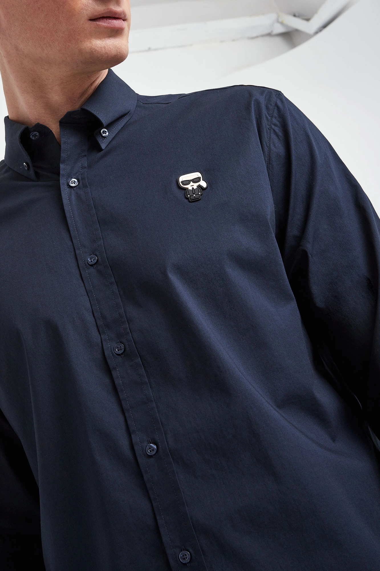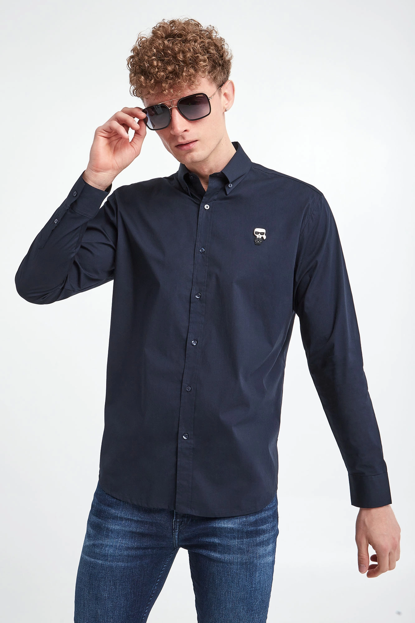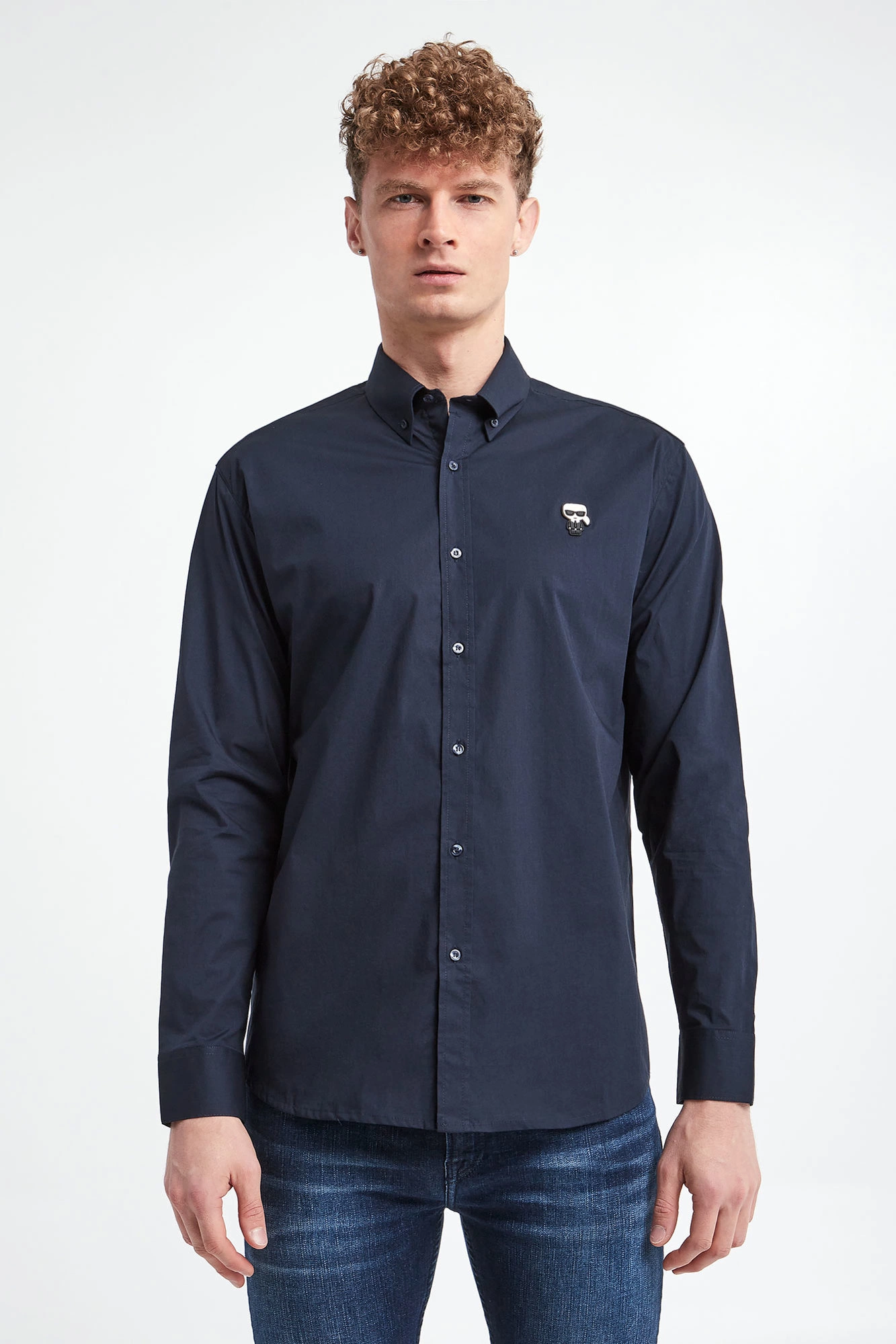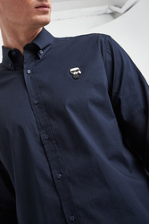 Koszula marki Karl Lagerfeld w grantowym kolorze. Wykonana z nieco elastycznej, popelinowej bawełny. Klasyczny kołnierz. Zapinana za pomocą sygnowanych guzików. Z przodu gumowana aplikacja w postaci wizerunku założyciela marki. Długie rękawy zakończone mankietami zapinanymi za pomocą guzików. Fason slim.