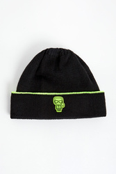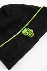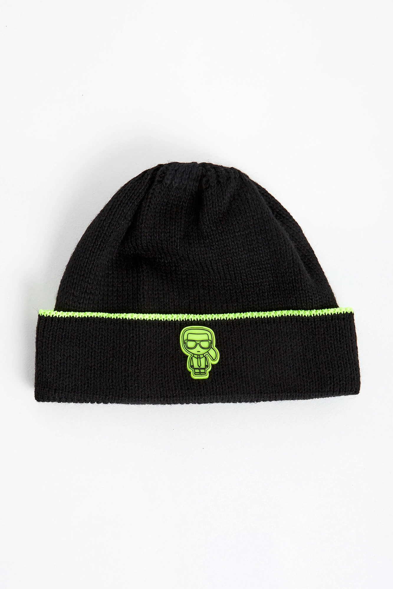 Czapka beanie marki Karl Lagerfeld w czarnym kolorze. Dzianinowa z widocznym splotem. Na przodzie gumowa aplikacja Ikonik Karl w limonkowo-czarnym kolorze. Zakończona wywinięciem z wąskim neonowym paskiem.