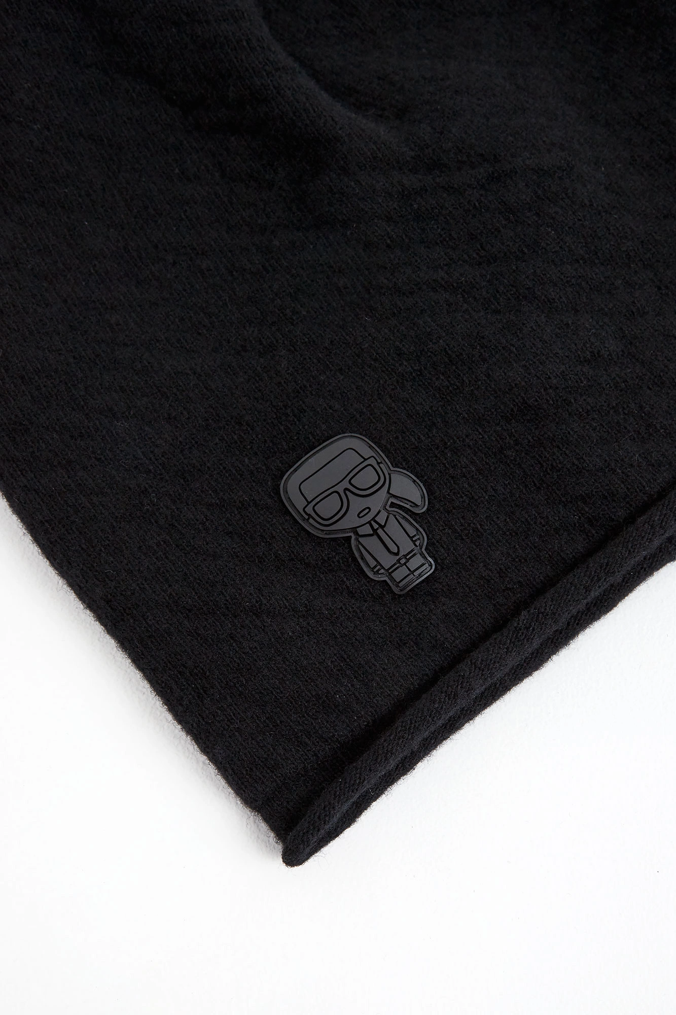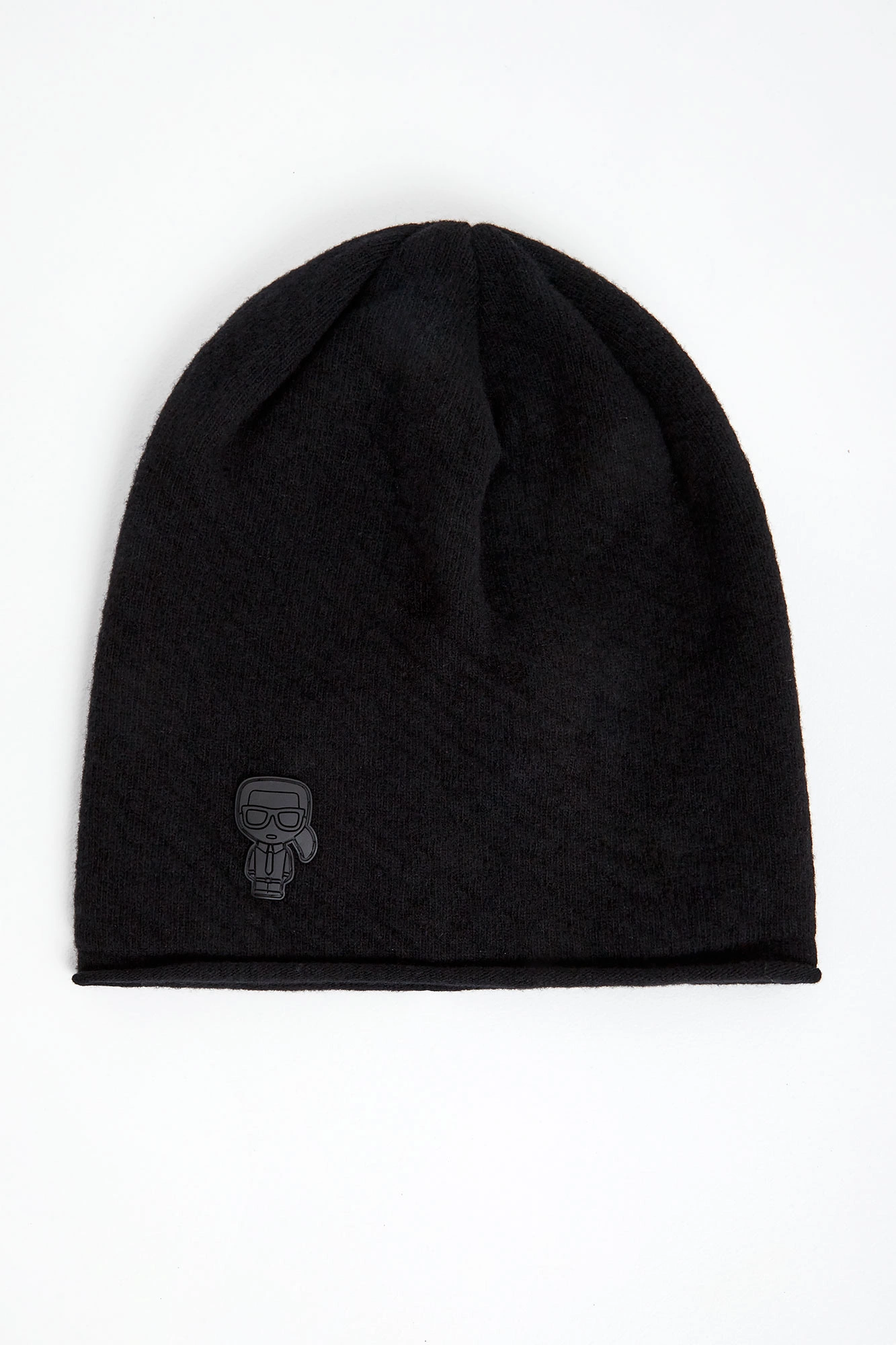 Czapka marki Karl Lagerfeld w czarnym kolorze. Wykonana z wełnianej dzianiny z domieszką kaszmiru. Na przodzie gumowa aplikacja Ikonik Karl. Klasyczny model w minimalistycznym wydaniu.