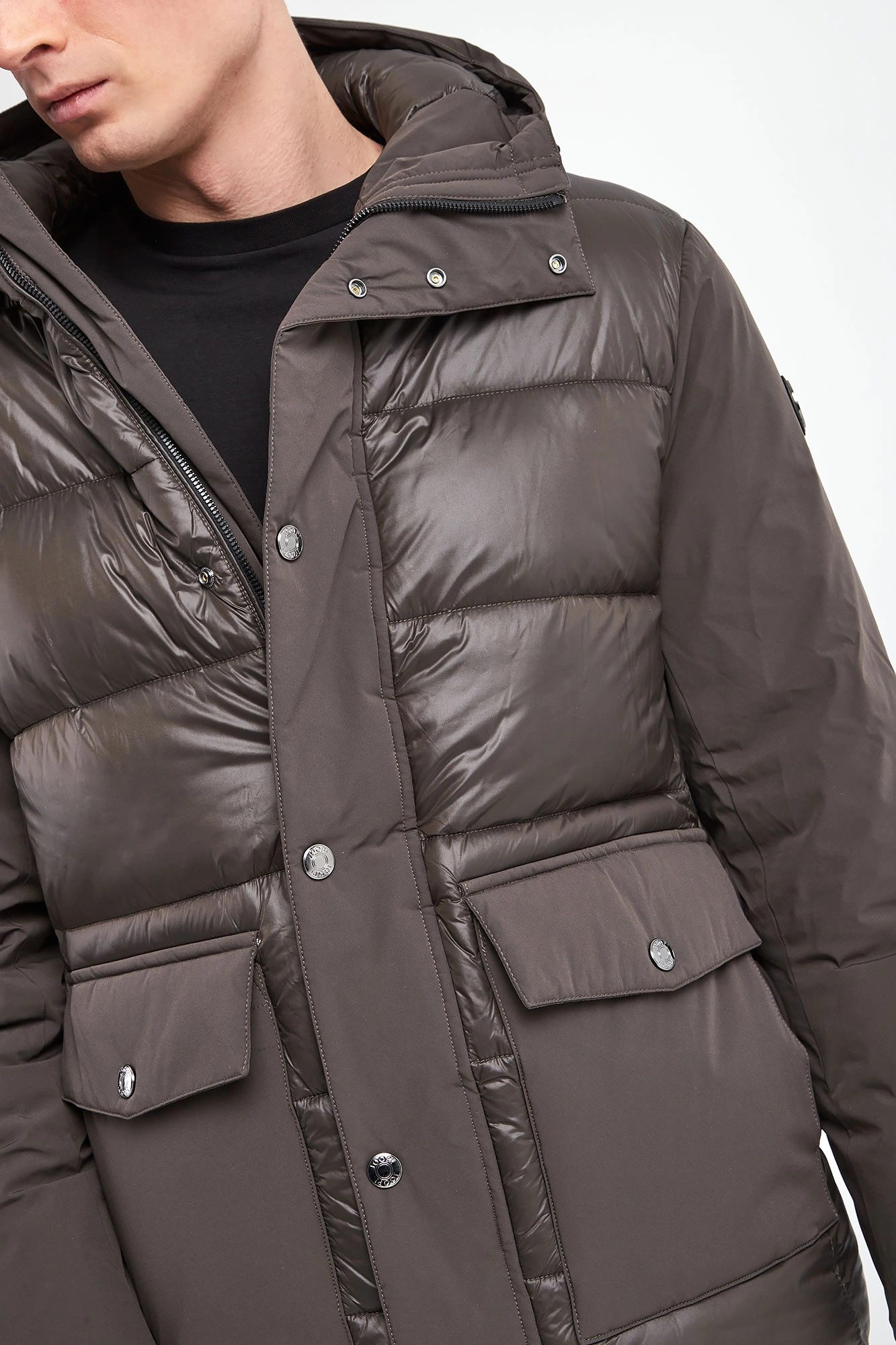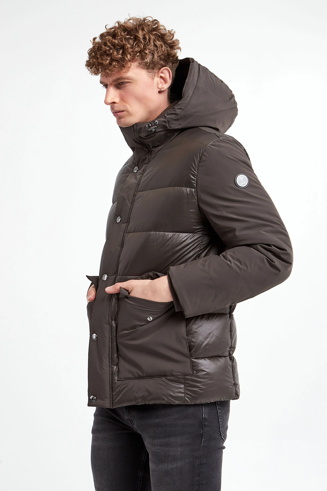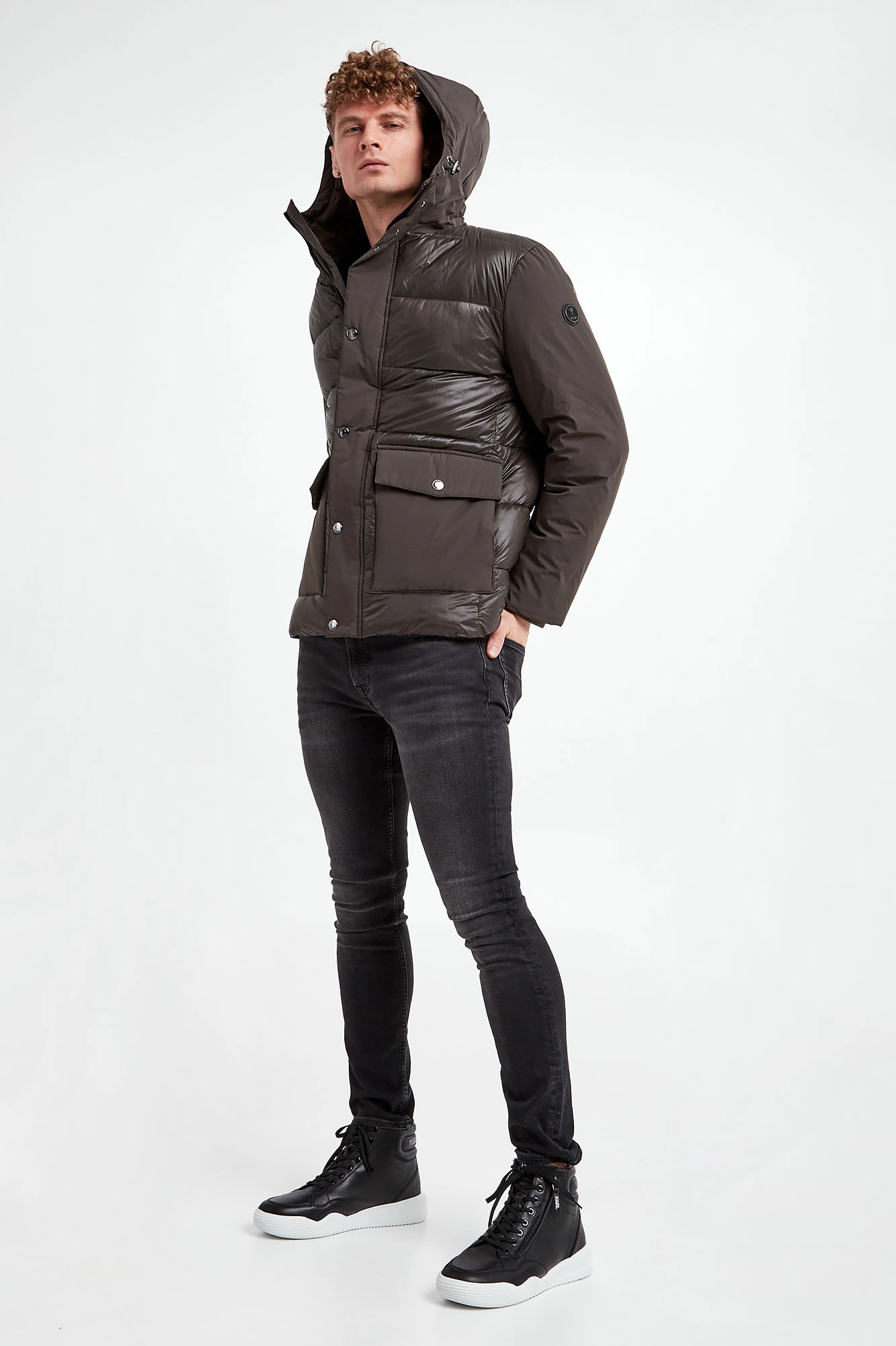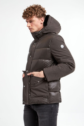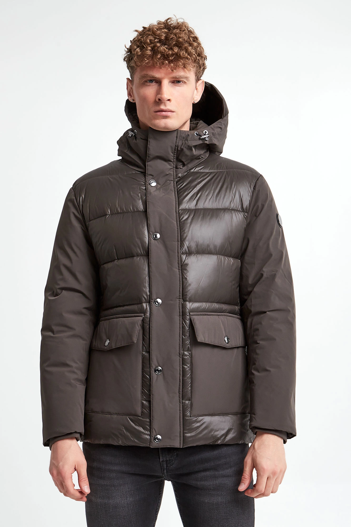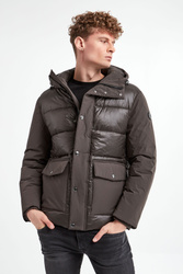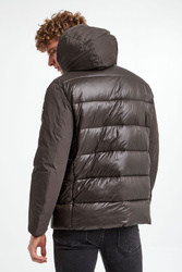 Kurtka z kapturem marki Joop! w ciemnobrązowym kolorze z delikatnym matowym połyskiem. Pikowana. Rękawy, kieszenie i kaptur wykonane z całkowicie matowego, gładkiego materiału. Wypełnienie syntetycznym puchem pochodzącym z recyklingu. Na ramieniu ozdobna aplikacja z logo marki. Model z czterema kieszeniami. Wewnątrz dodatkowa kieszeń. Zapinana za pomocą dwukierunkowego zamka pokrytego pasem na zatrzaski. Fason typu regular.
