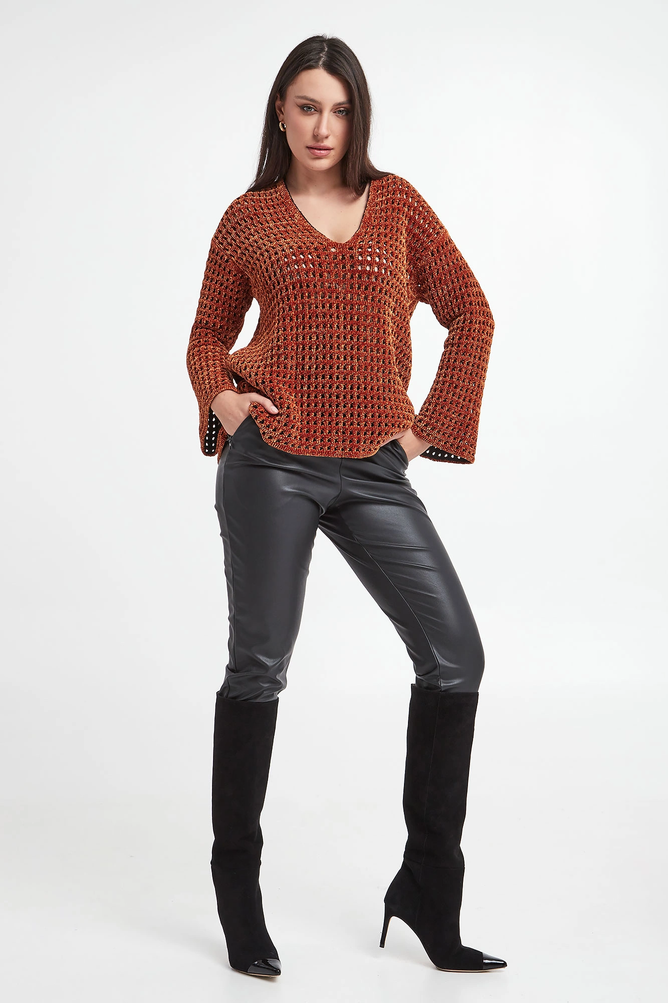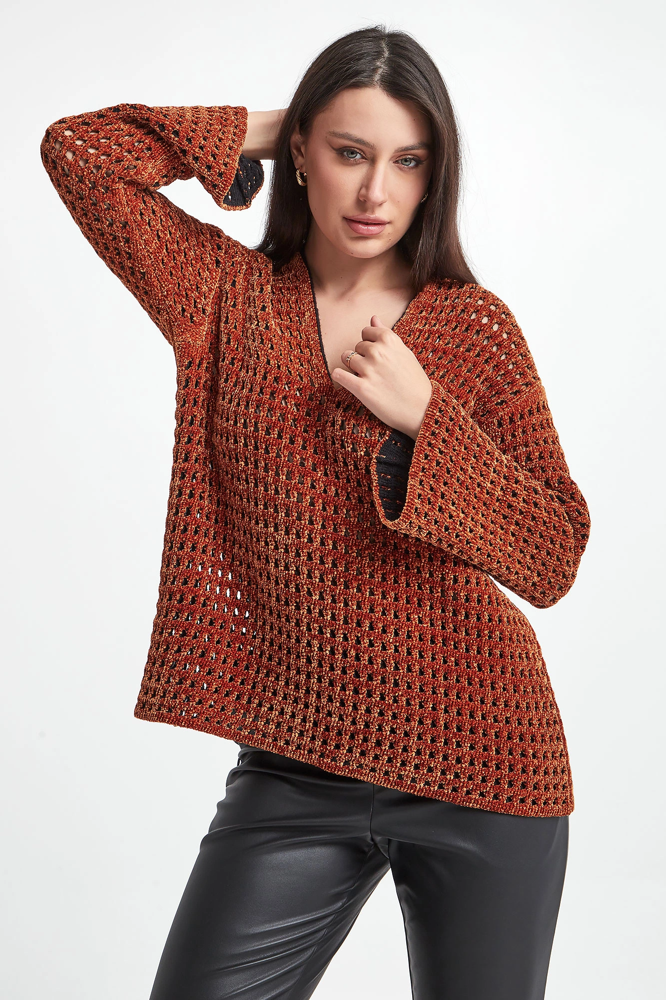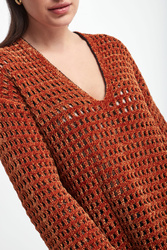 Sweter marki Wolford w brązowym kolorze. Wykonany z miłego w dotyku, wiskozowego materiału o welurowej strukturze. Całość pleciona w regularny, ażurowy wzór. Dekolt typu v-neck. Długie delikatnie rozkloszowane rękawy. Spód w czarnym kolorze. Fason typu oversize.