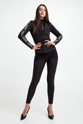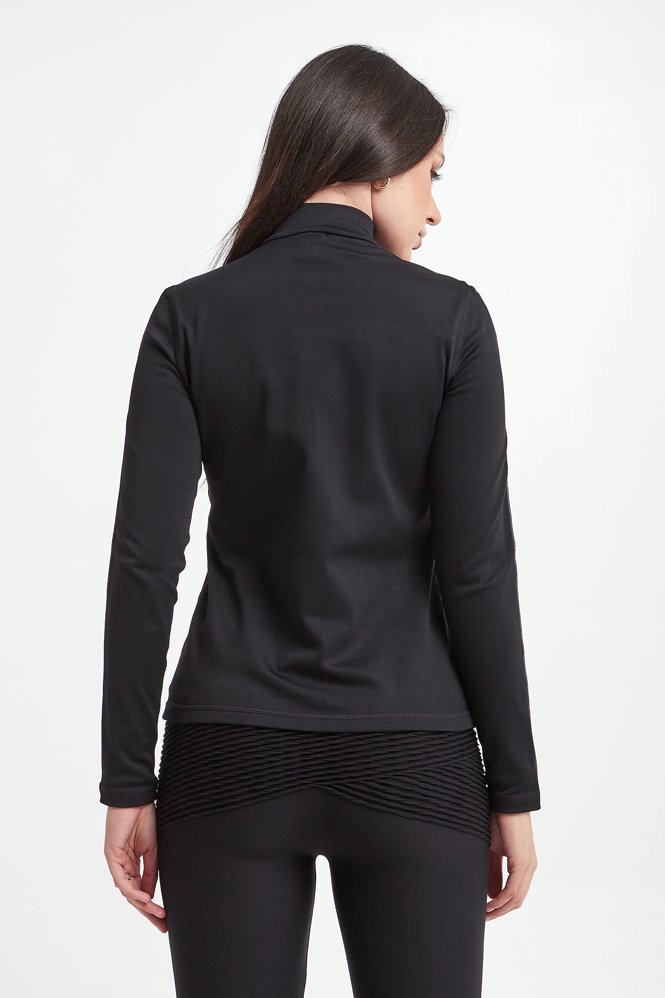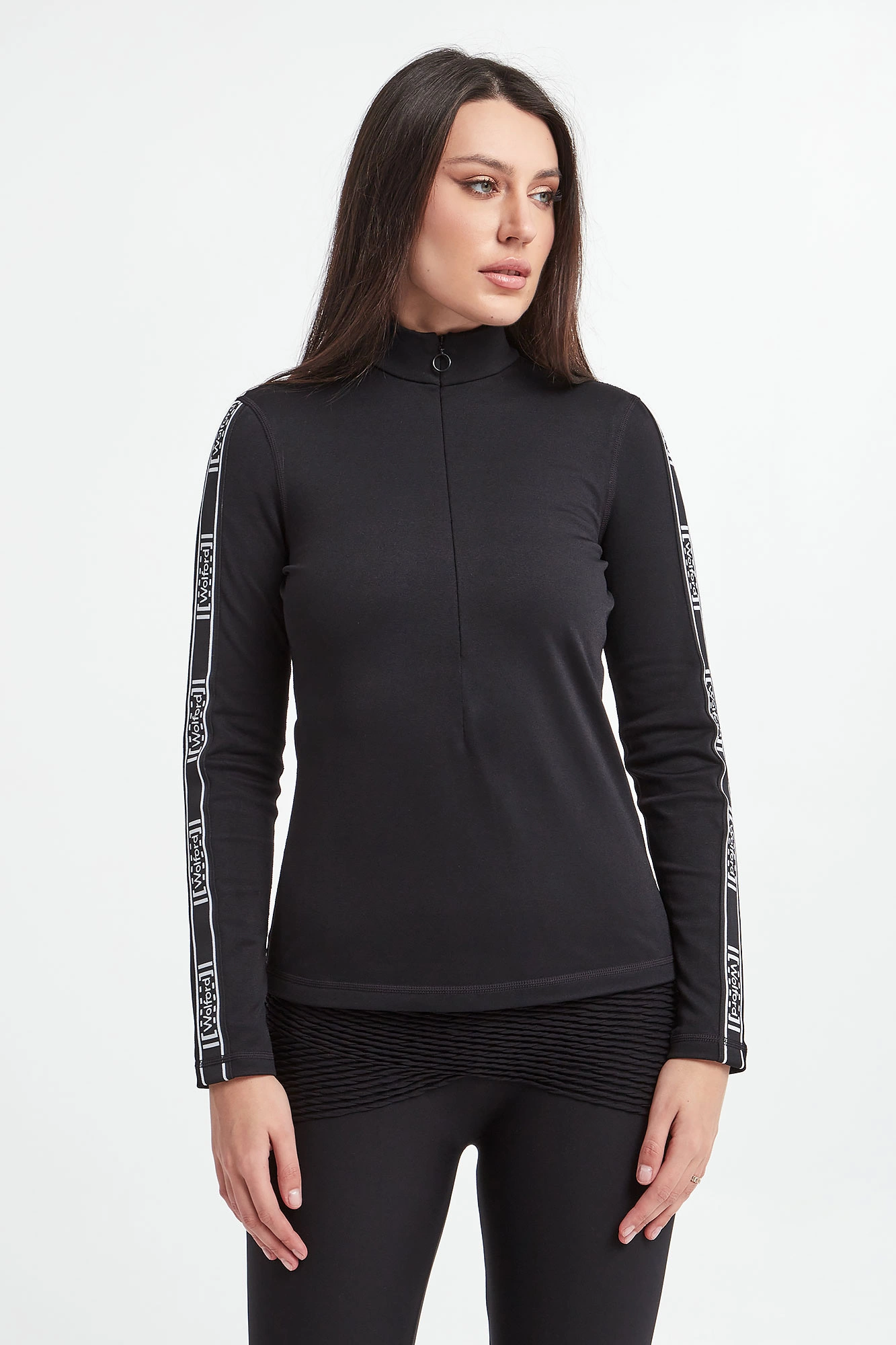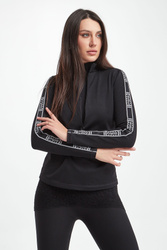 Bluza marki Wolford w czarnym kolorze. Polarowe wnętrze. Dekolt wykończony półgolfem, zapinany za pomocą zamka. Długie rękawy. Na rękawach logowany czarno-biały lampas. Wykończenie lamówką. Wykonana z elastycznego materiału. Fason typu slim.