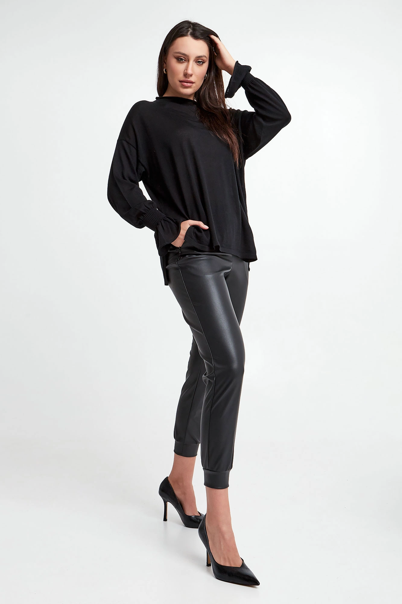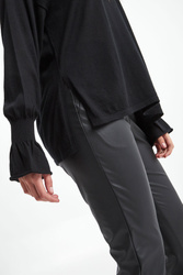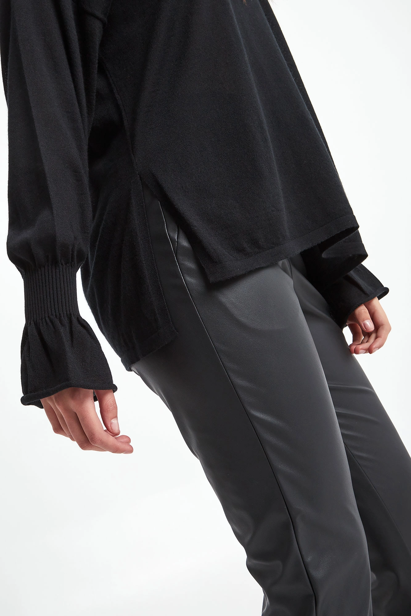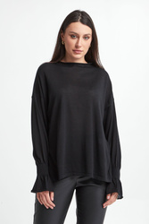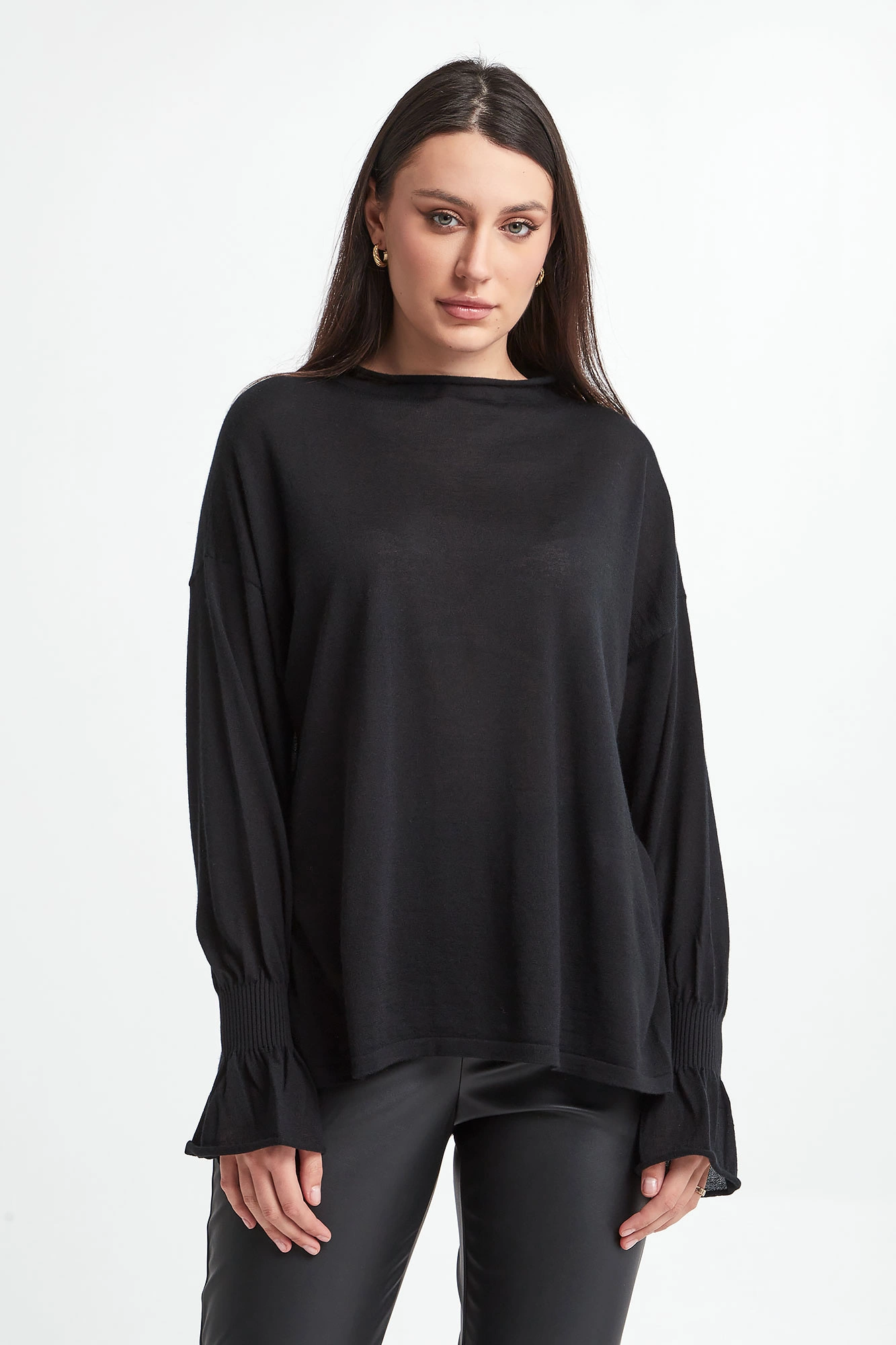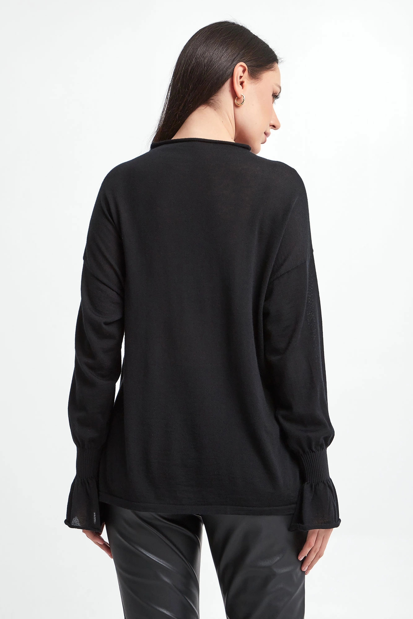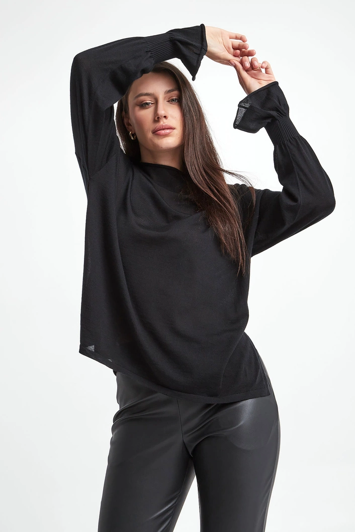 Sweter marki Wolford w czarnym kolorze. Wykonany z miękkiej kaszmirowej dzianiny, lekko transparetnej. Dekolt w łódkę. Długie rękawy z prążkowanym ściągaczem na nadgarstkach i rozkloszowanymi końcówkami. Dekolt i rękawy zakończone lekkim wywinięciem. Po bokach rozcięcia. Fason typu relaxed.