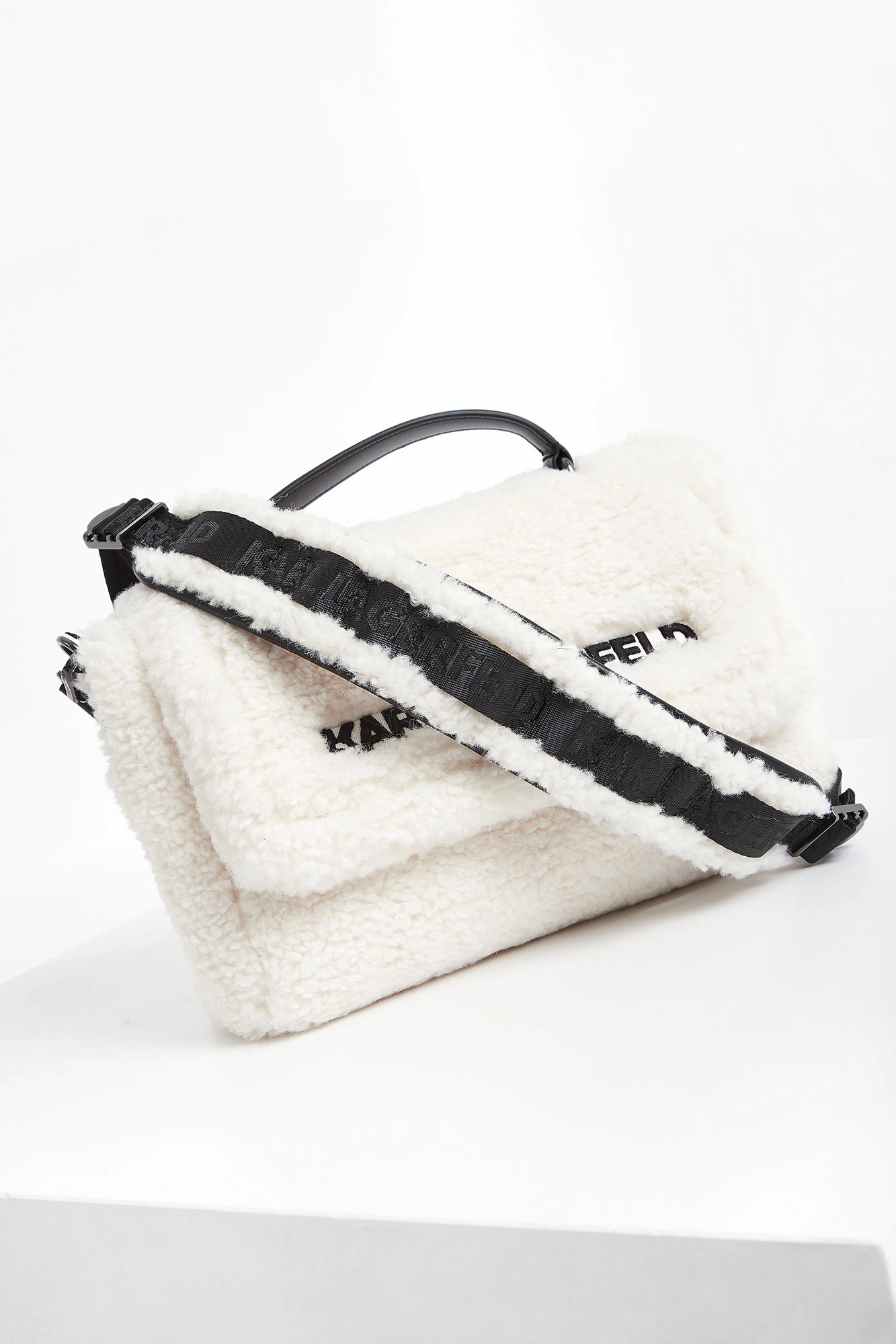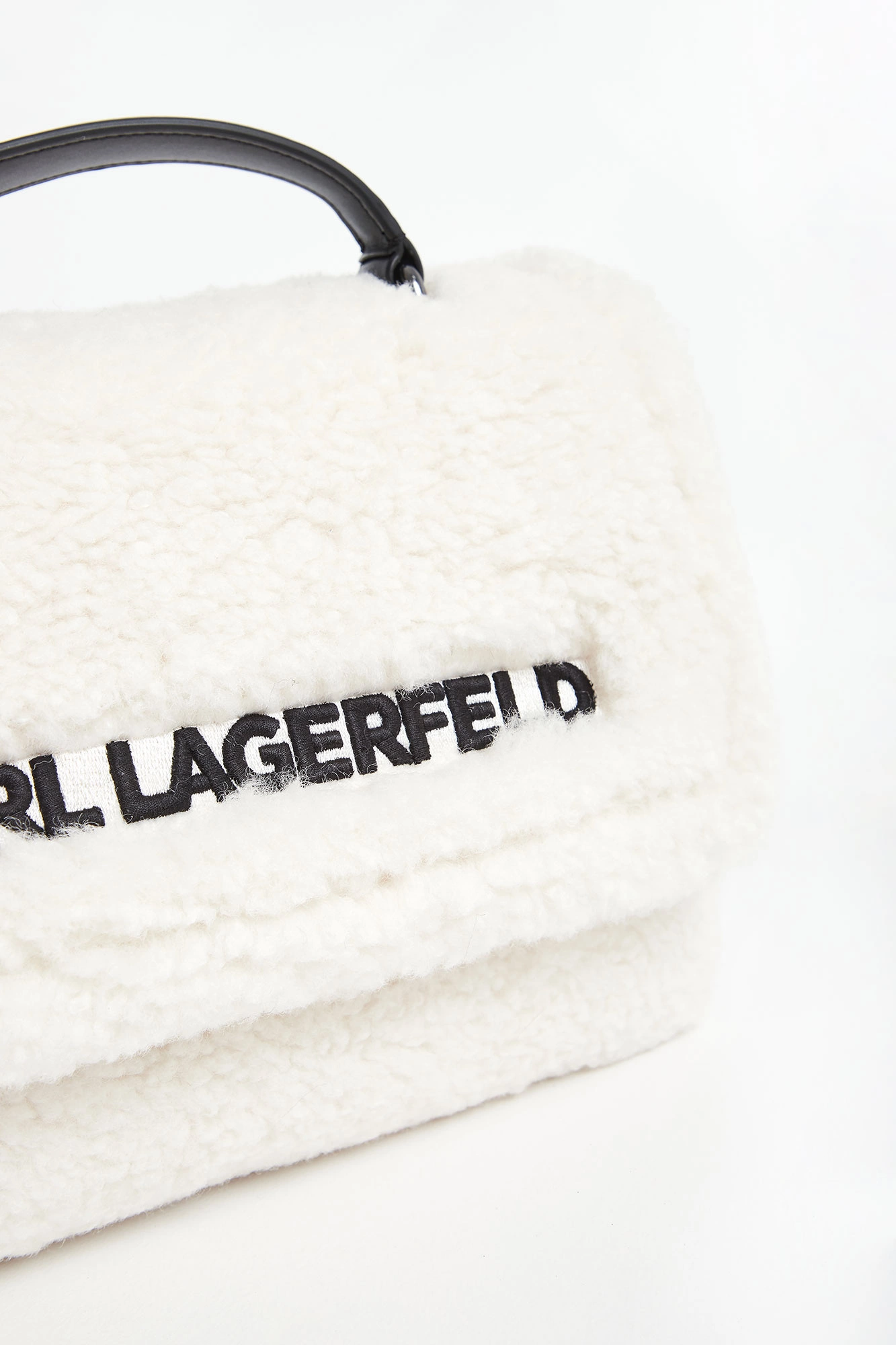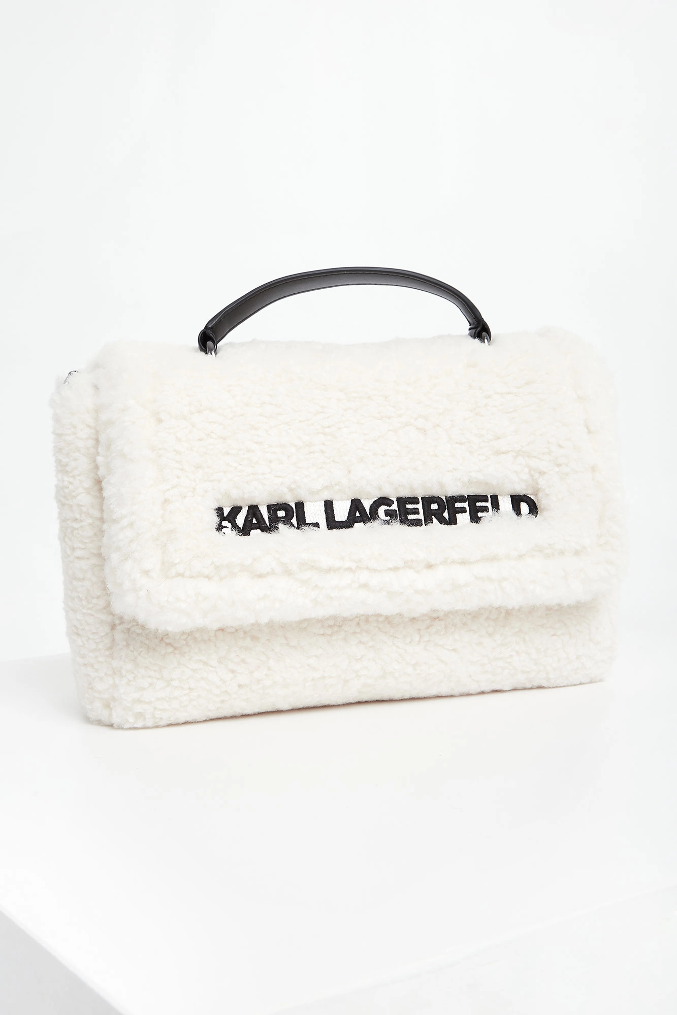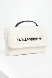 Torebka typu baguette marki Karl Lagerfeld w kolorze ecru, pochodząca z linii "Karl Cares", która wykorzystuje organiczne tkaniny. Wykonana z miękkiego sztucznego futra. Zapinana klapka z haftowanym, czarnym napisem z nazwą marki. Jednokomorowa z małą, dodatkową kieszenią zamykaną na zamek. Do noszenia w ręku lub na regulowanym, długim pasku. Produkt z kolekcji CARA ♥️ KARL, która skupia się na przekształcalnych elementach, oferujących szerszy zakres opcji noszenia za pomocą tylko jednego ubrania.