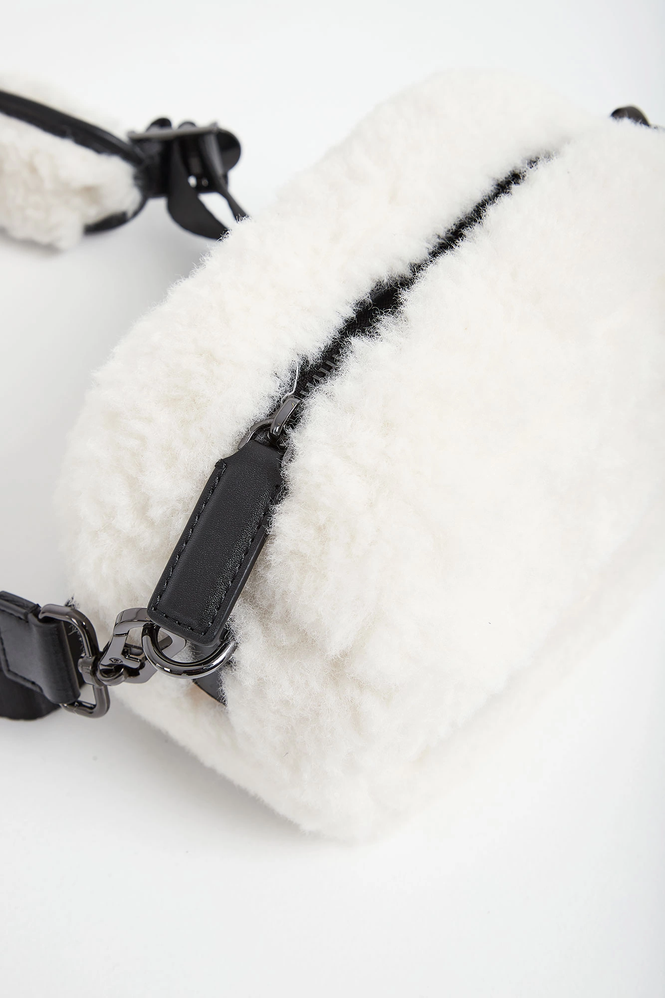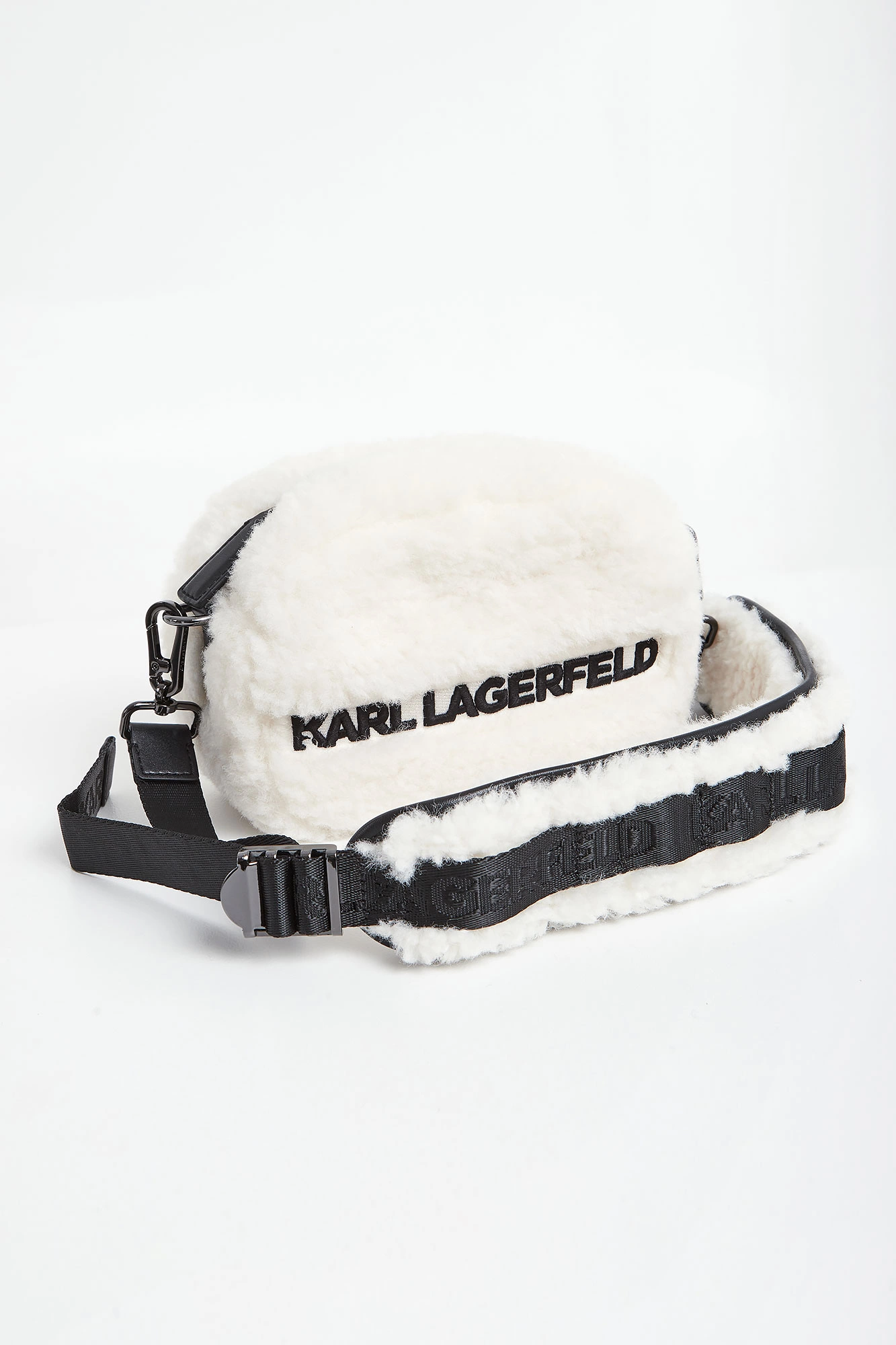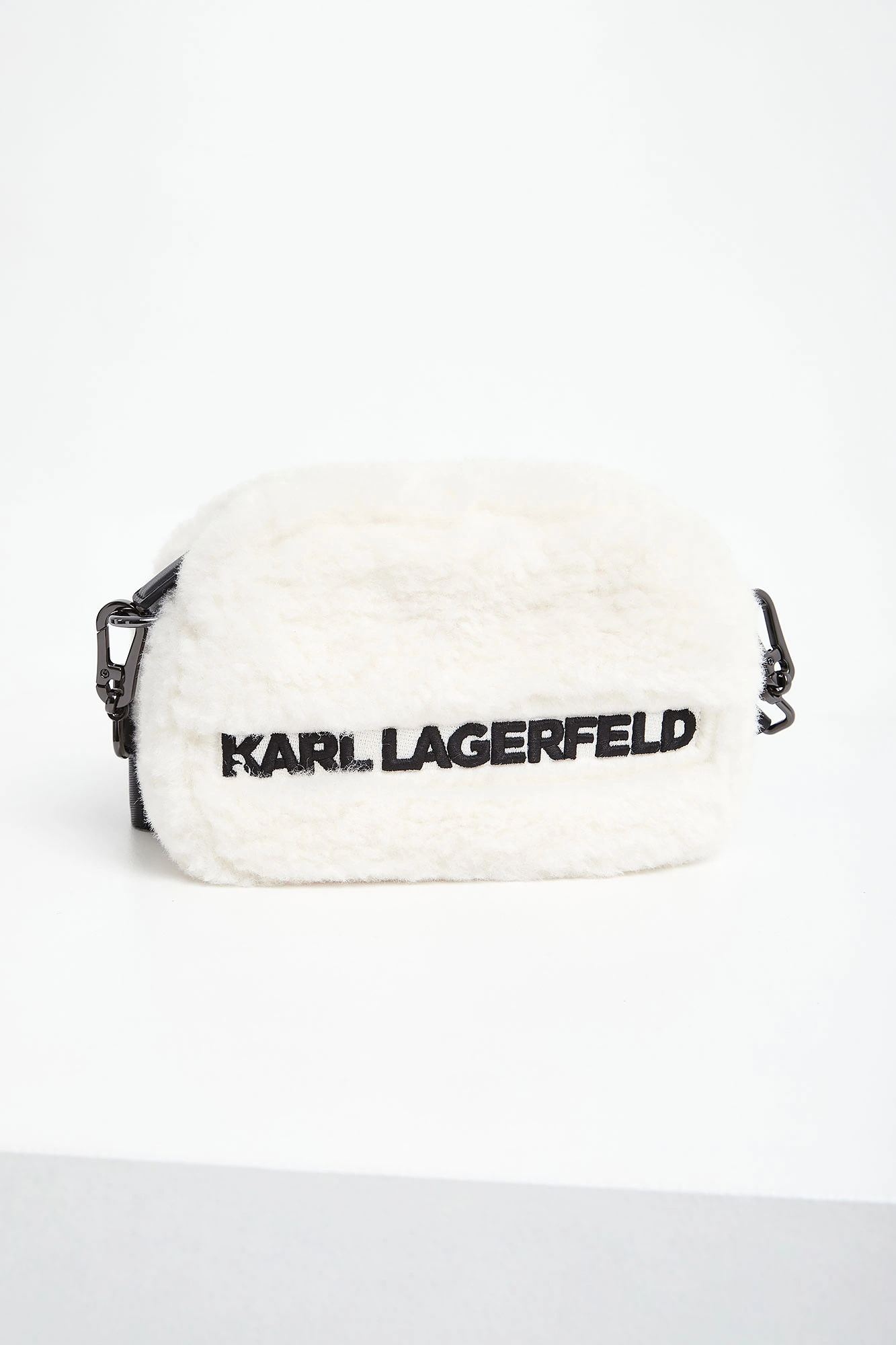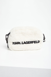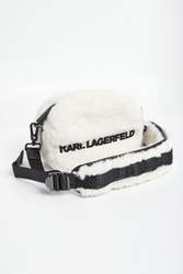 Torebka typu crossbody marki Karl Lagerfeld w kolorze białym, pochodząca z linii "Karl Cares", która wykorzystuje organiczne tkaniny. Wykonana z miękkiego sztucznego futra. Zapinana na zamek. Z przodu haftowany, czarny napis z nazwą marki. Jednokomorowa z małą, dodatkową, otwartą kieszenią Do noszenia na regulowanym, parcianym pasku na ramię z brandingiem. Produkt z kolekcji CARA ♥️ KARL, która skupia się na przekształcalnych elementach, oferujących szerszy zakres opcji noszenia za pomocą tylko jednego ubrania.