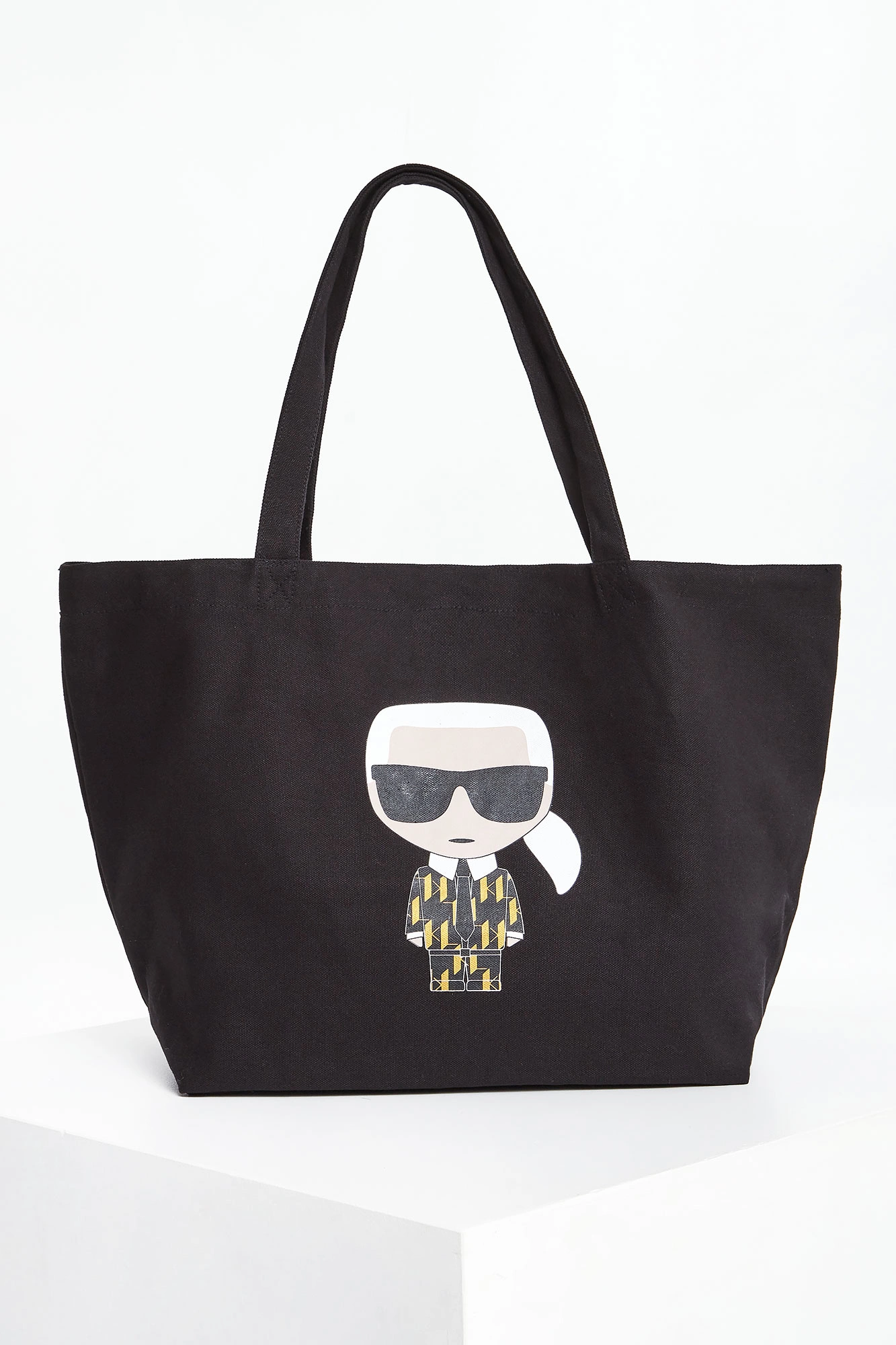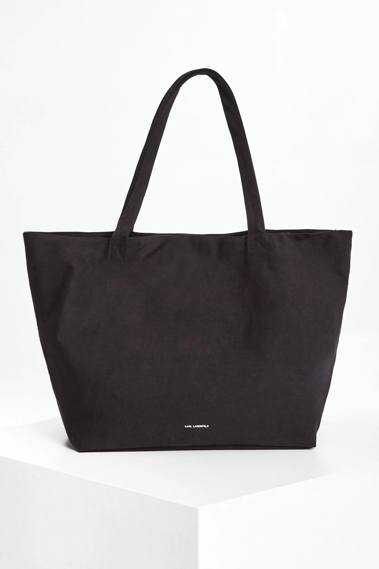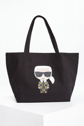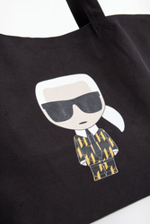 Torebka bawełniana typu shopper marki Karl Lagerfeld w kolorze czarnym. Z przodu duża, naklejana aplikacja z wizerunkiem założyciela marki. Jednokomorowa niezapinana, z dodatkową, małą kieszenią na suwak. Do noszenia na materiałowych rączkach. Model z linii Karl Cares wykonany z materiałów powstających w zrównoważonym procesie produkcji przyjaznym dla środowiska.