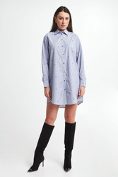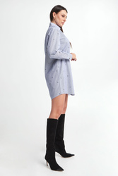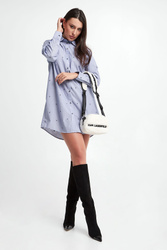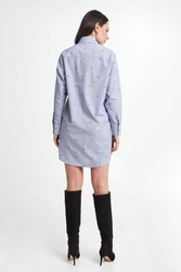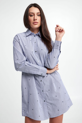 Koszula bawełniana marki Karl Lagerfeld w niebiesko-białe, pionowe paski. Wykonana z czystej bawełny. Na całości wzór w postaci multiplikacji logo marki w czarnym kolorze. Klasyczny kołnierz. Zapinana za pomocą kontrastowych, logowanych guzików. Długie rękawy zakończone mankietami na guzik. Fason typu relaxed.