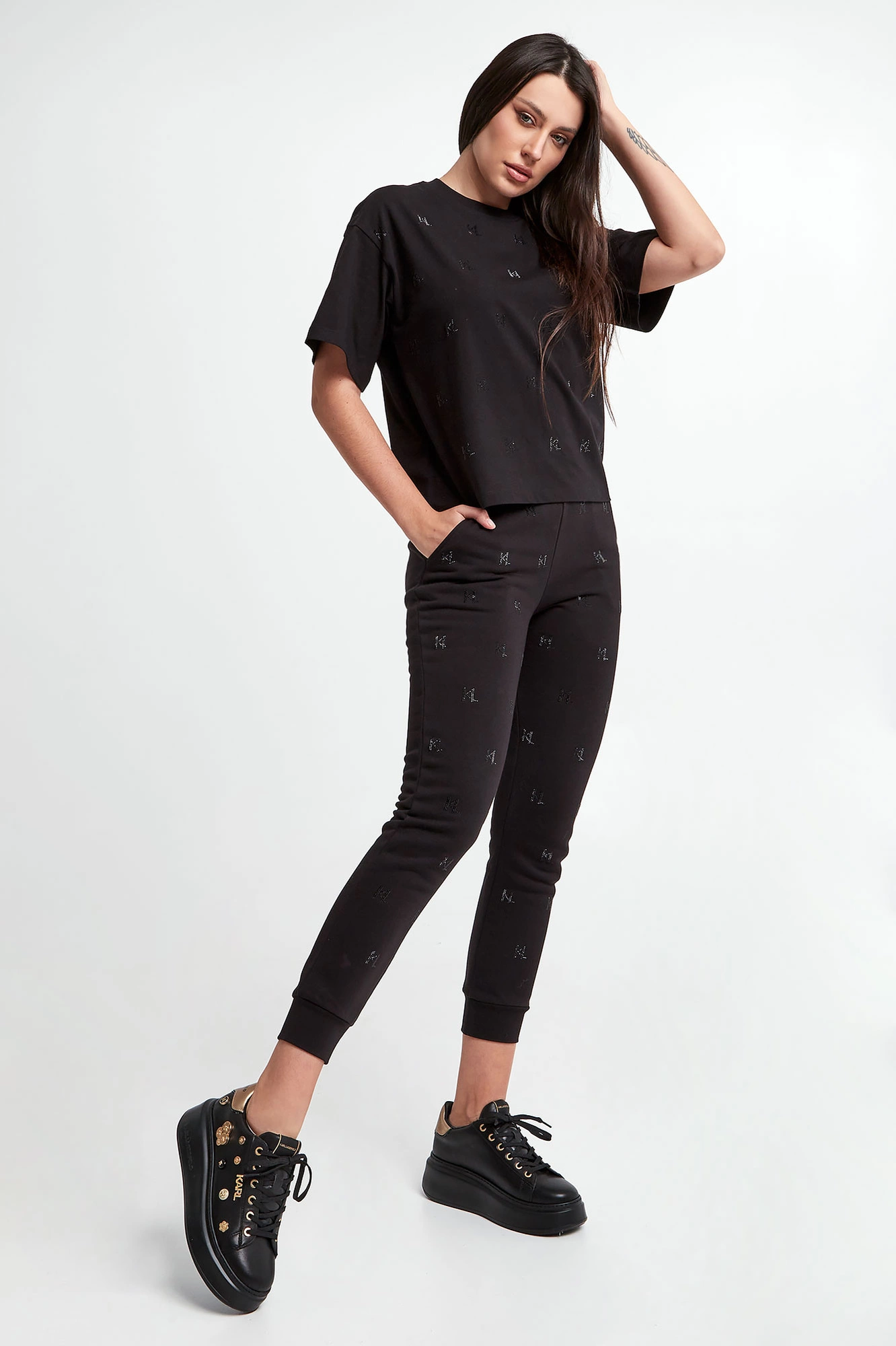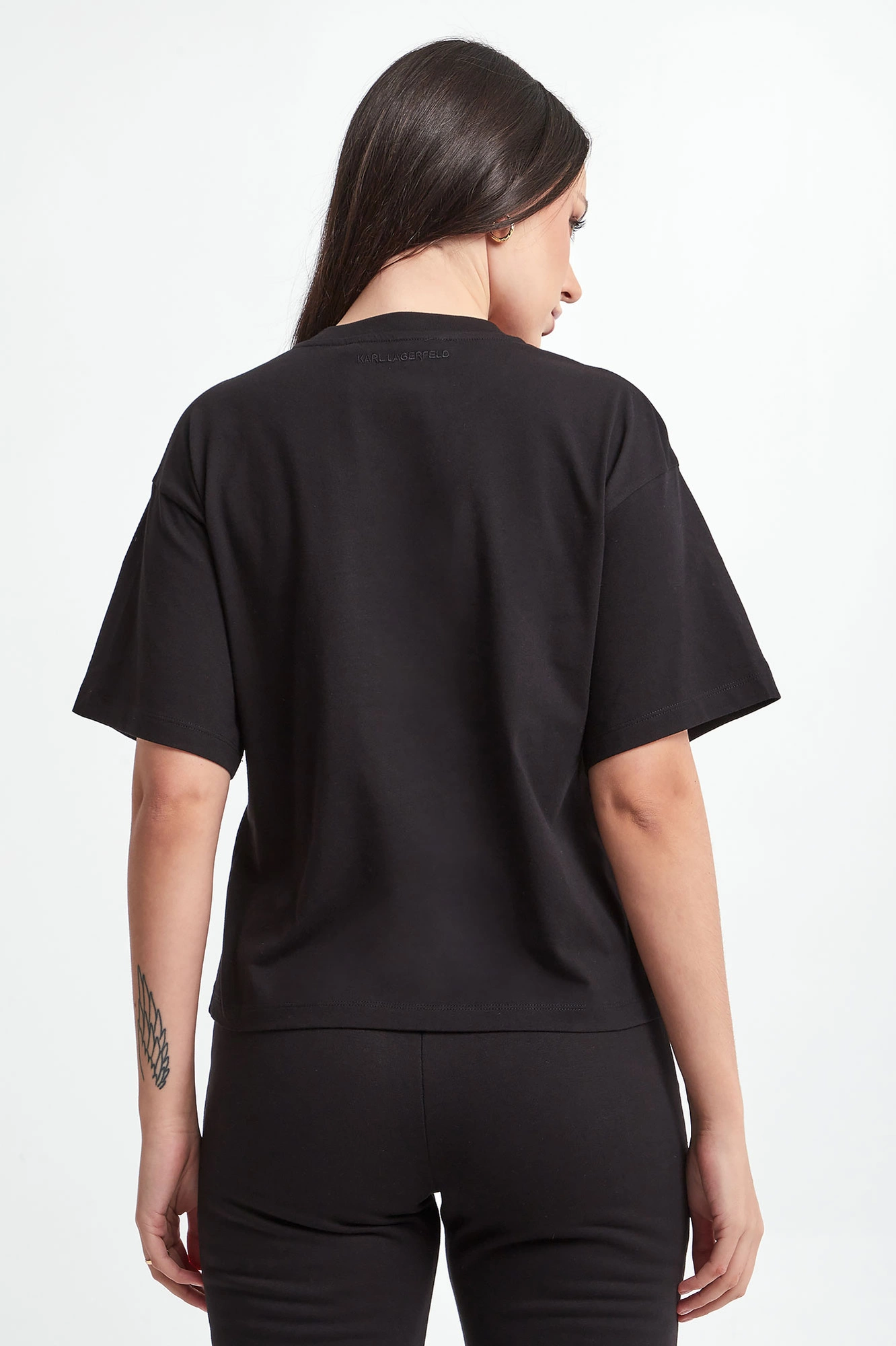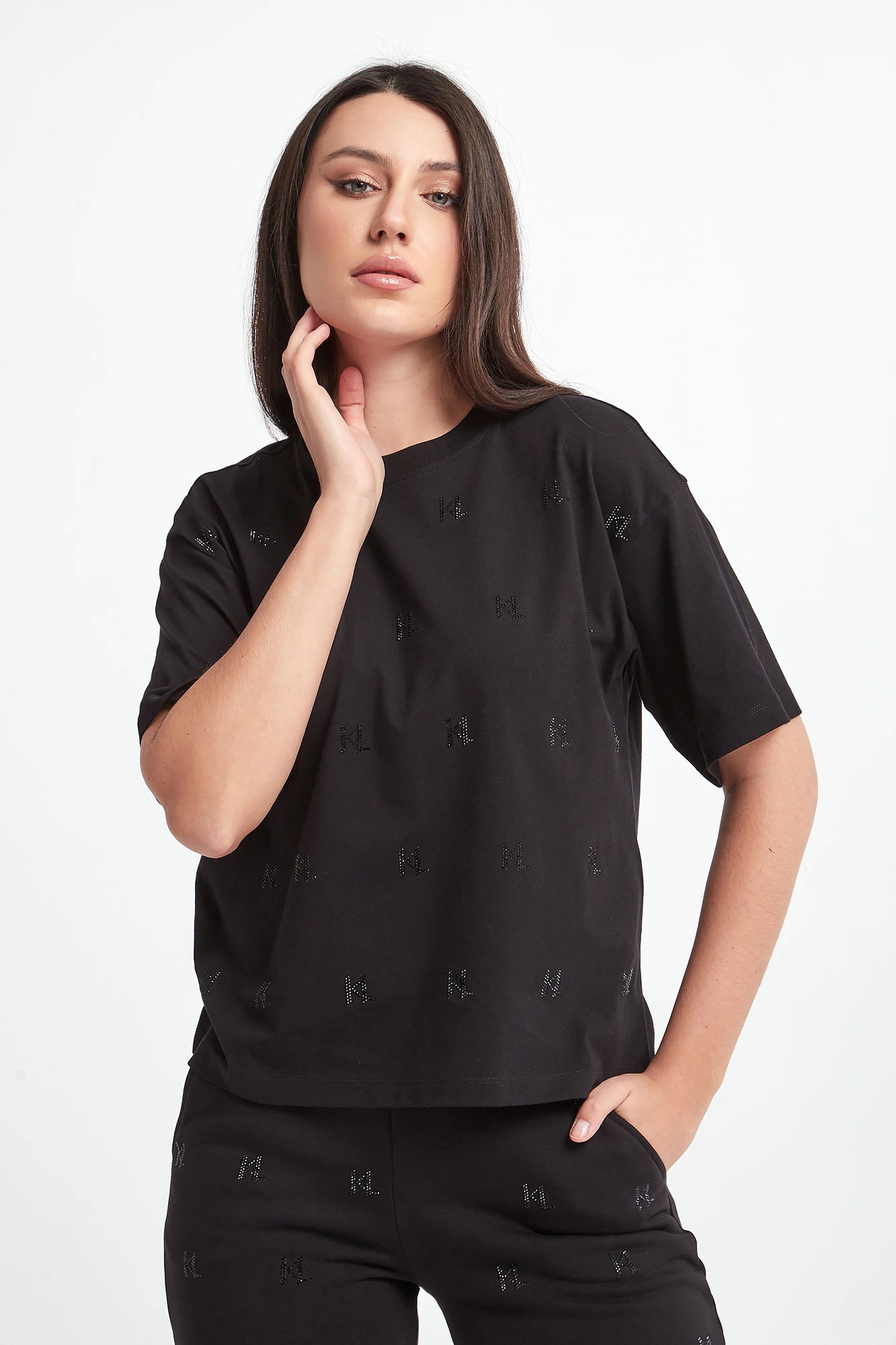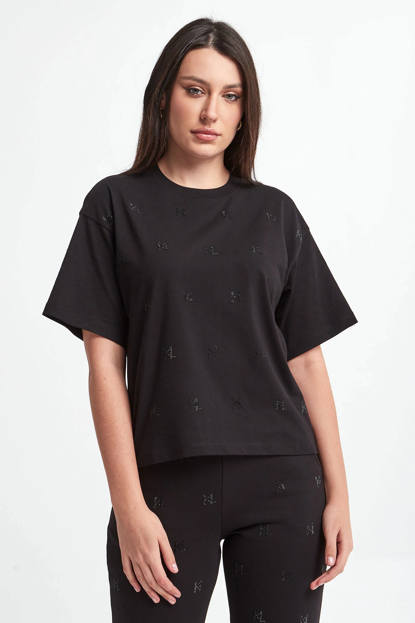 T-shirt bawełniany marki Karl Lagerfeld w kolorze czarnym. Pochodzi z linii "Karl Cares", która wykorzystuje tkaniny pochodzące z recyklingu, by wspierać zrównoważoną modę. Z przodu wzór charakterystyczny dla marki w kolorze czarnym w postaci cyrkonii. Dekolt typu o-neck wykończony ściągaczem. Dół i rękawy wykończone lamówką. Z tyłu na linii karku nadruk w postaci nazwy marki w czarnym kolorze. Wykonany w całości z bawełny. Prosty fason typu relaxed..
