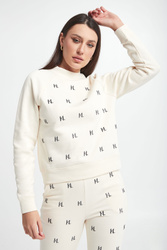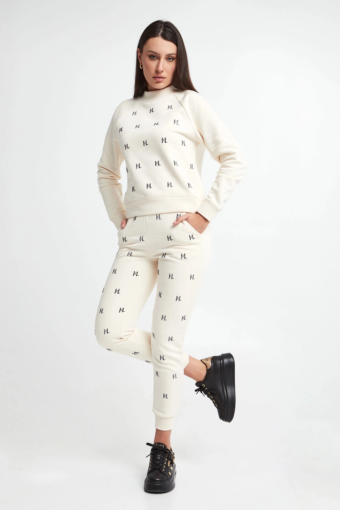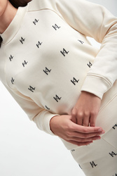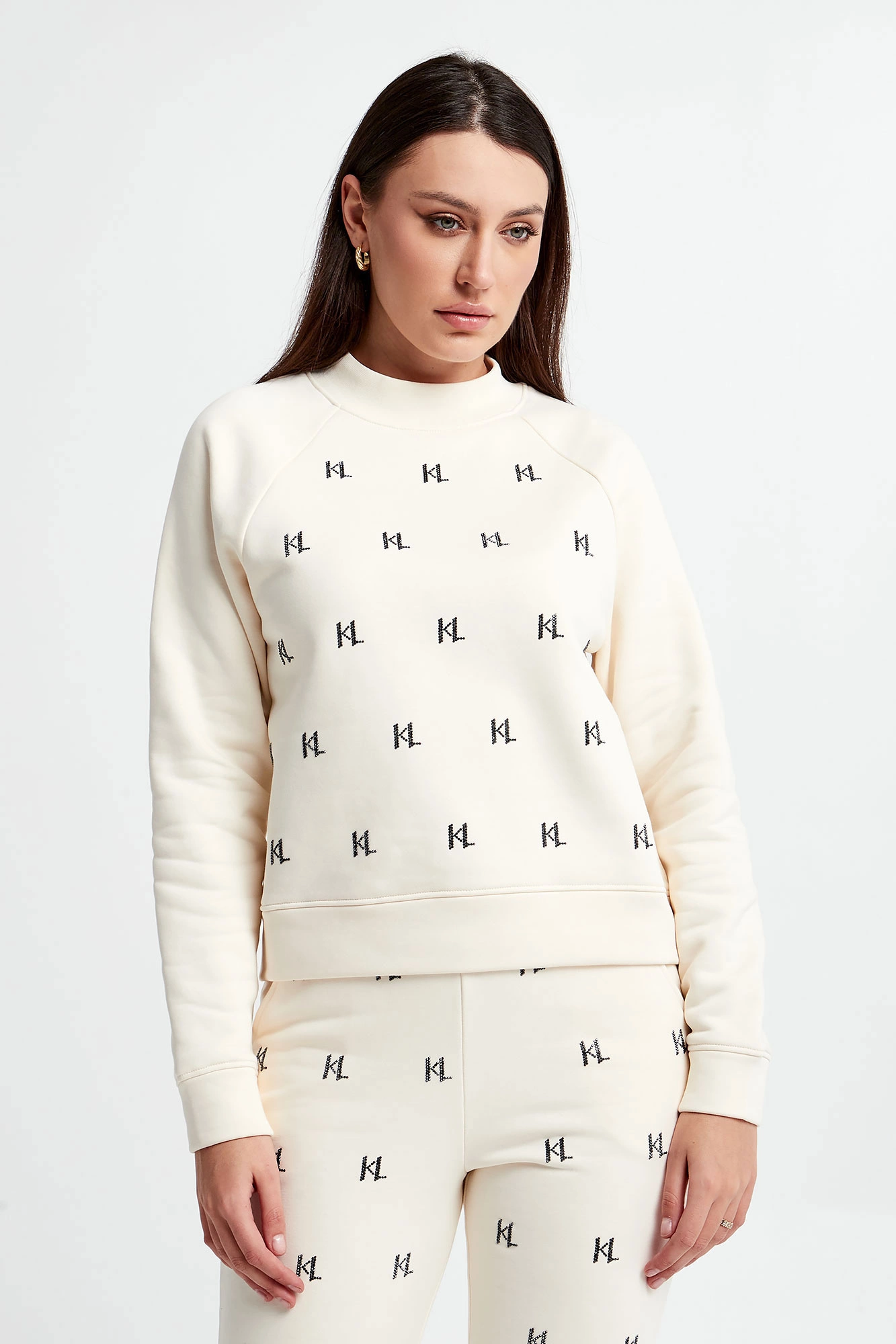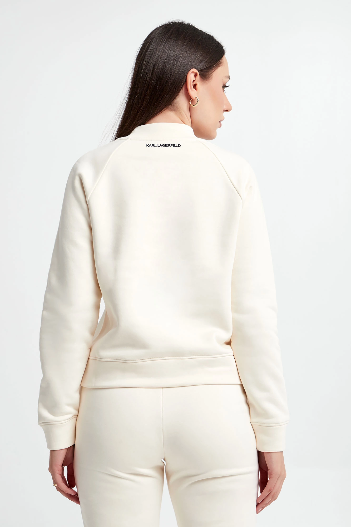 Bluza marki Karl Lagefeld w kolorze ecru. Model pochodzący z linii "Karl Cares", która wykorzystuje organiczne tkaniny, by wspierać zrównoważoną modę. Krój regular. Z przodu charakterystyczny wzór dla marki z cyrkonii. Dekolt typu o-neck, długie, proste rękawy oraz dół wykończone ściągaczami. Wykonana z miękkiej, mięsistej bawełnianej tkaniny.