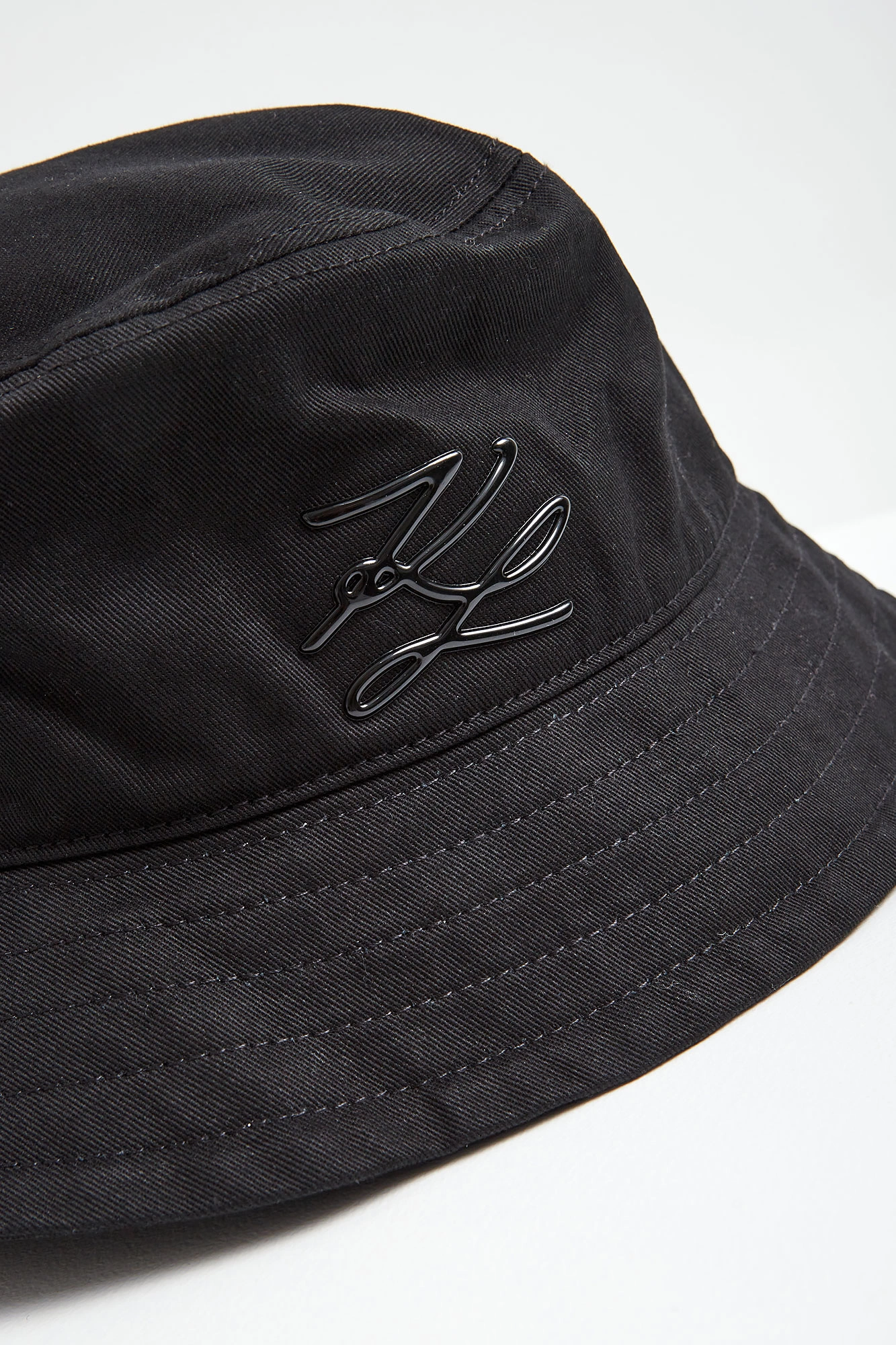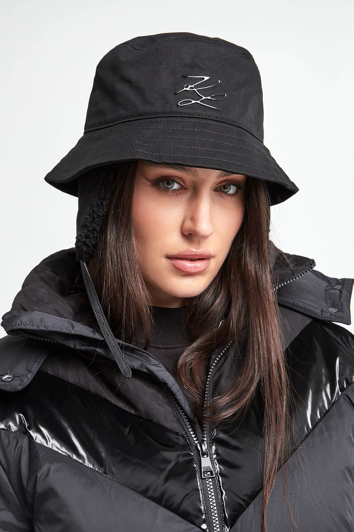 Bucket hat marki Karl Lagerfeld w czarnym kolorze. Z przodu czarna aplikacja z logo marki. Na rondzie przeszycia. Model z odpinanymi nausznicami zapinanymi na pasek i wykończonymi miękkim materiałem typu baranek. Model pochodzący z linii "Karl Cares", która wykorzystuje organiczne tkaniny, by wspierać zrównoważoną modę.