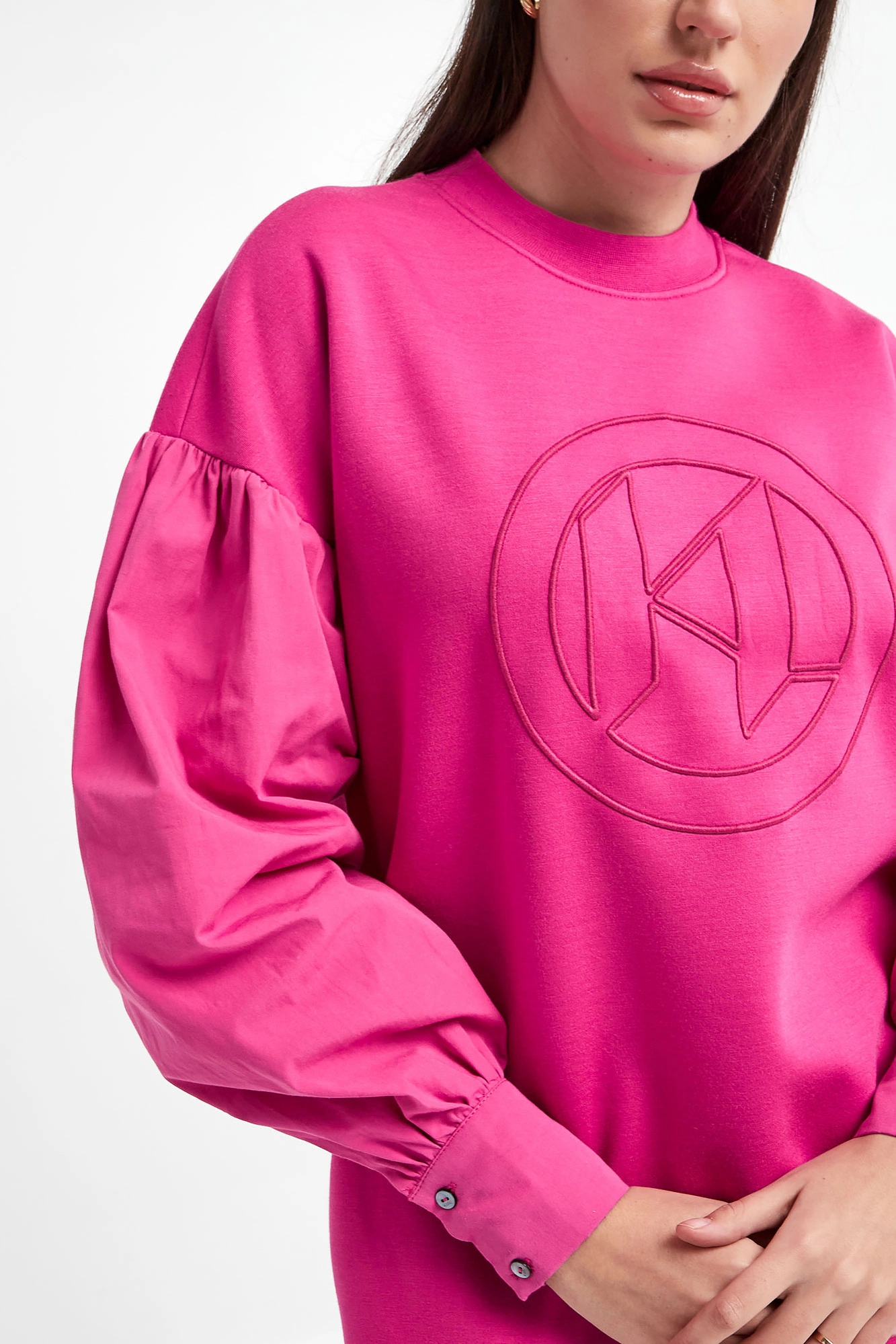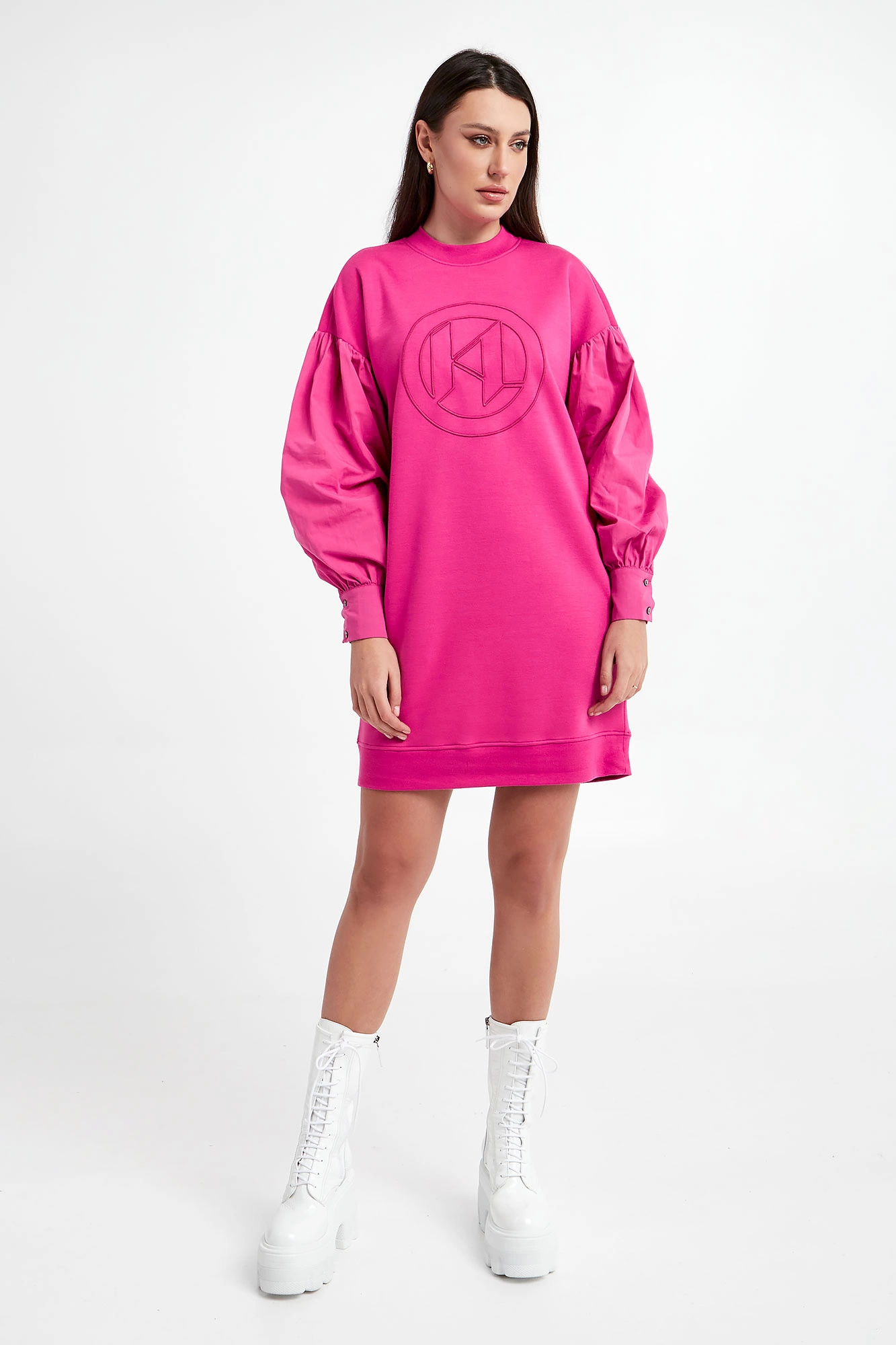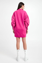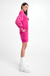 Sukienka dresowa marki Karl Lagerfeld w kolorze fuksjowym. Dekolt typu o-neck i dół zakończony ściągaczem. Na froncie haftowany wzór charakterystyczny dla marki. Długie bawełniane rękawy wykończone mankietami zapinane na sygnowane guziki. Model z dwoma wpuszczanymi kieszeniami na linii bioder. Oversizowy krój, długość mini. Wykonana z mięsistej, przyjemnej w dotyku, wiskozowej tkaniny.