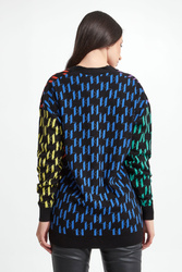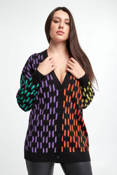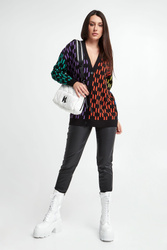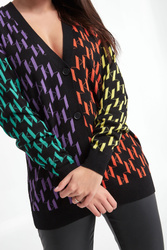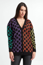 Kardigan wełniany marki Karl Lagerfeld w czarnym kolorze. Przyjemny w dotyku, dzianinowy materiał. Na całości wielokolorowy nadruk w postaci multipilkacji logo marki. Zapinany za pomocą logowanych guzików. Całość wykończona czarnym ściągaczem. Fason typu relaxed.