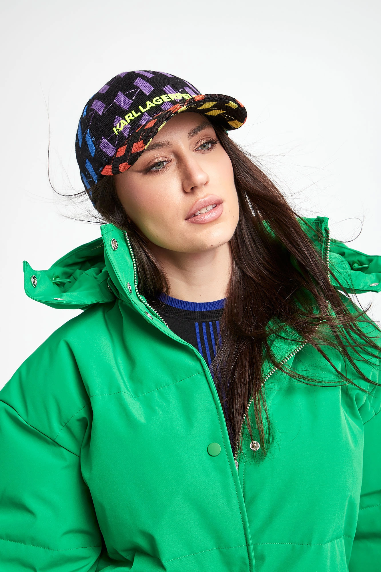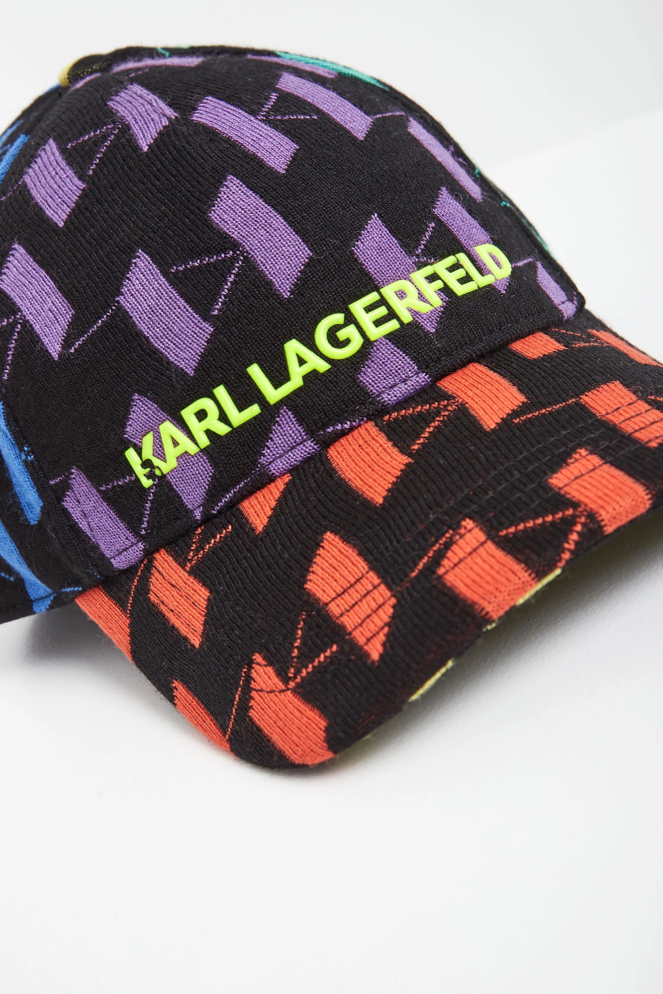 Czapka z daszkiem marki Karl Lagerfeld w kolorze czarnym. Na całości kolorowa multiplikacja monogramu. Na froncie fluorescencyjny, żółty napis z nazwą marki. Regulowana z tyłu za pomocą paska i klamry. Wykonana w 100% z wełny.