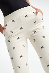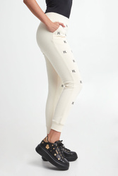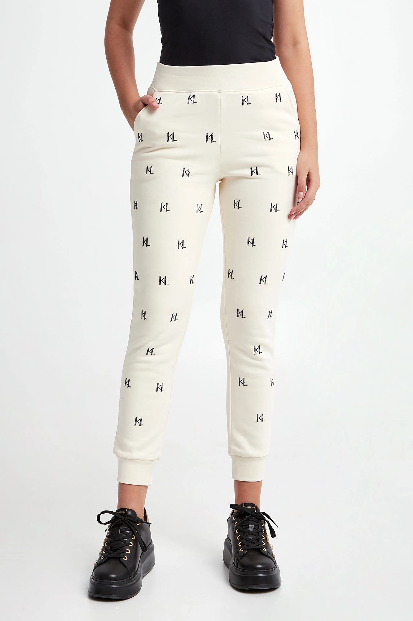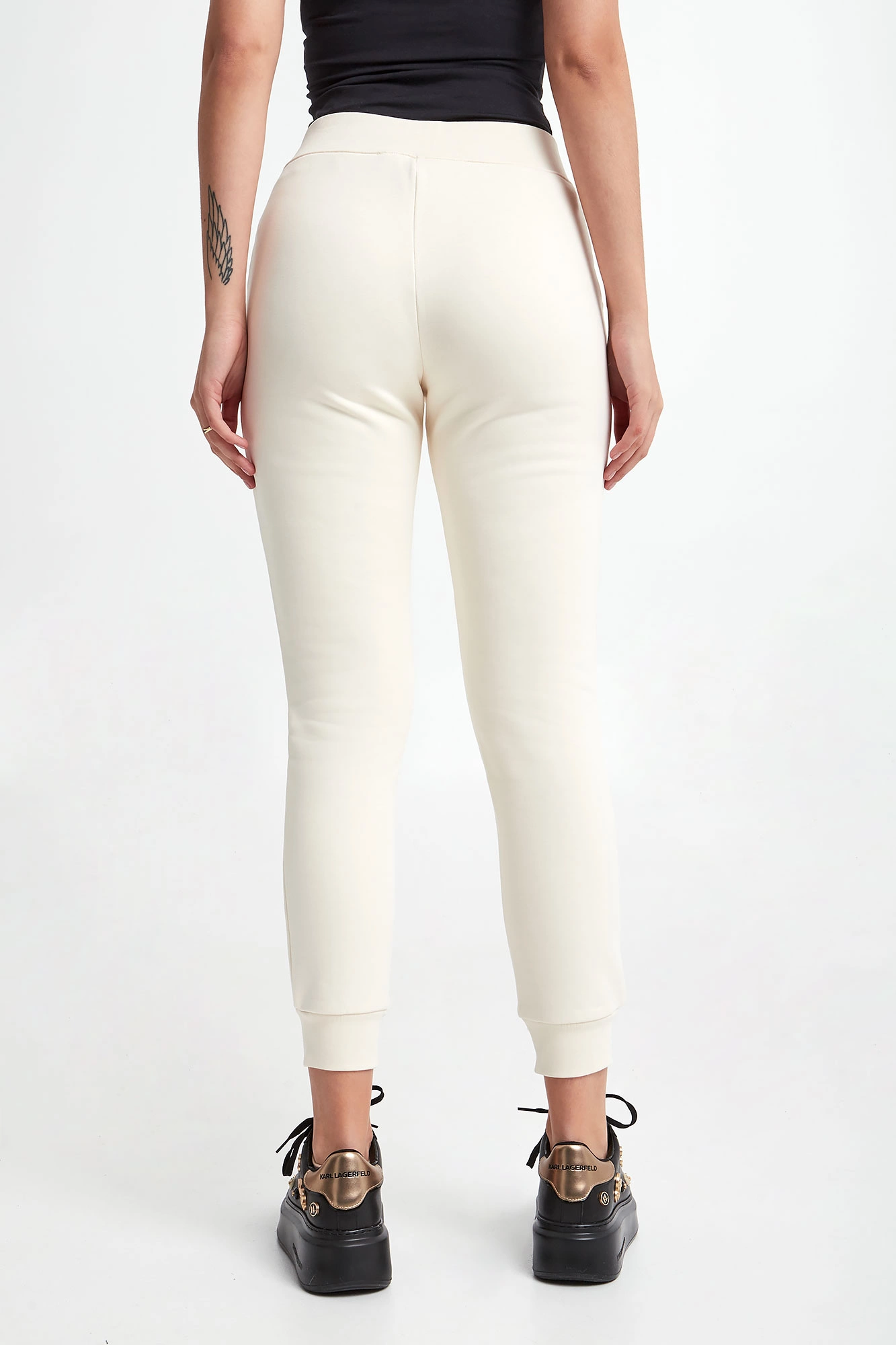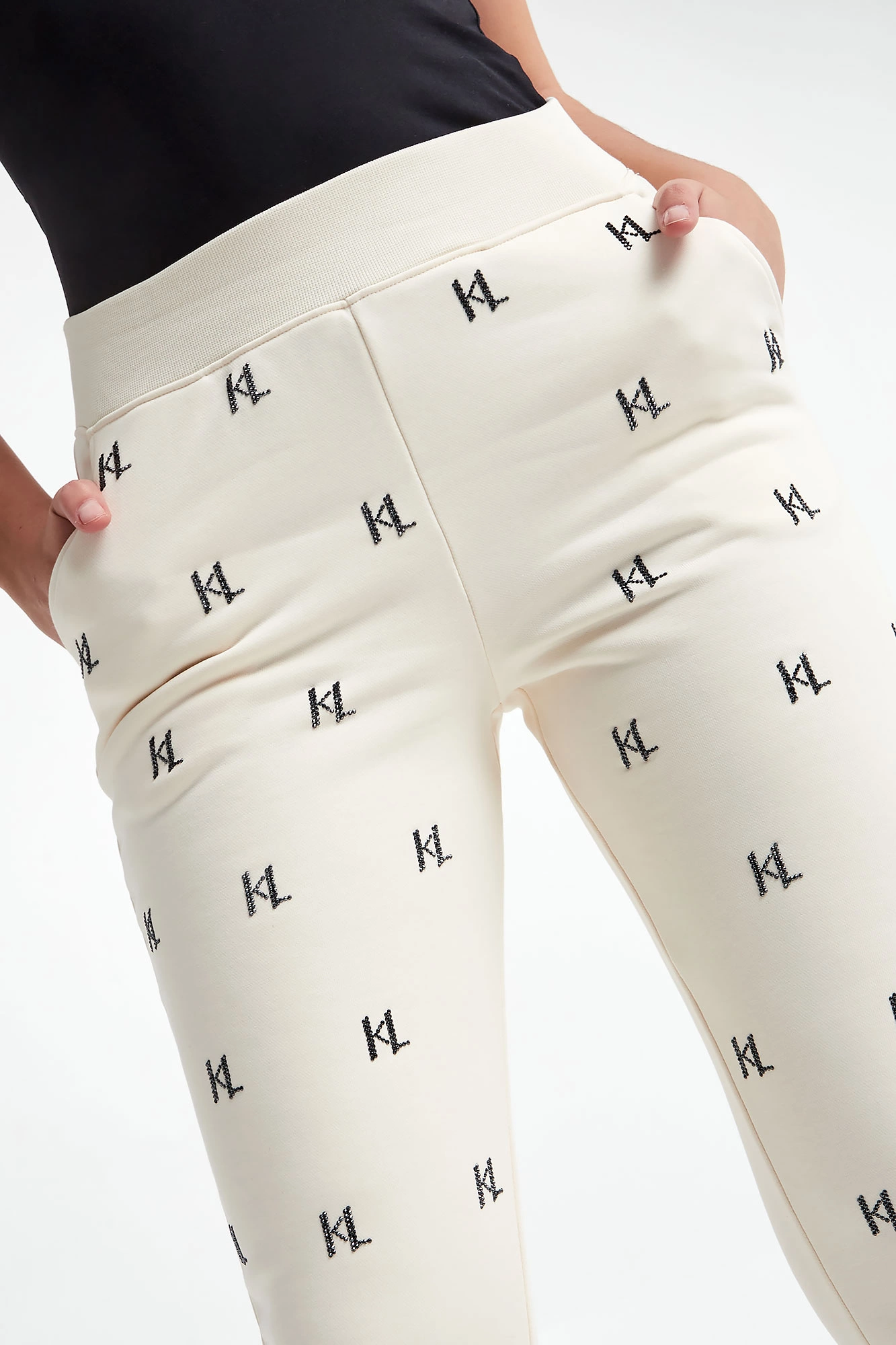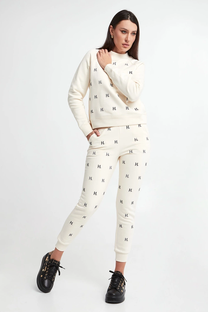 Spodnie dresowe marki Karl Lagerfeld w kolorze ecru, pochodzący z linii "Karl Cares", która wykorzystuje organiczne tkaniny, by wspierać zrównoważoną modę. Fason typu jogger. Model z dwoma wpuszczanymi kieszeniami. Na całości charakterystyczny wzór dla marki z cyrkonii. W pasie i na nogawkach elastyczny ściągacz. Wykonane z miękkiej, mięsistej bawełnianej tkaniny.