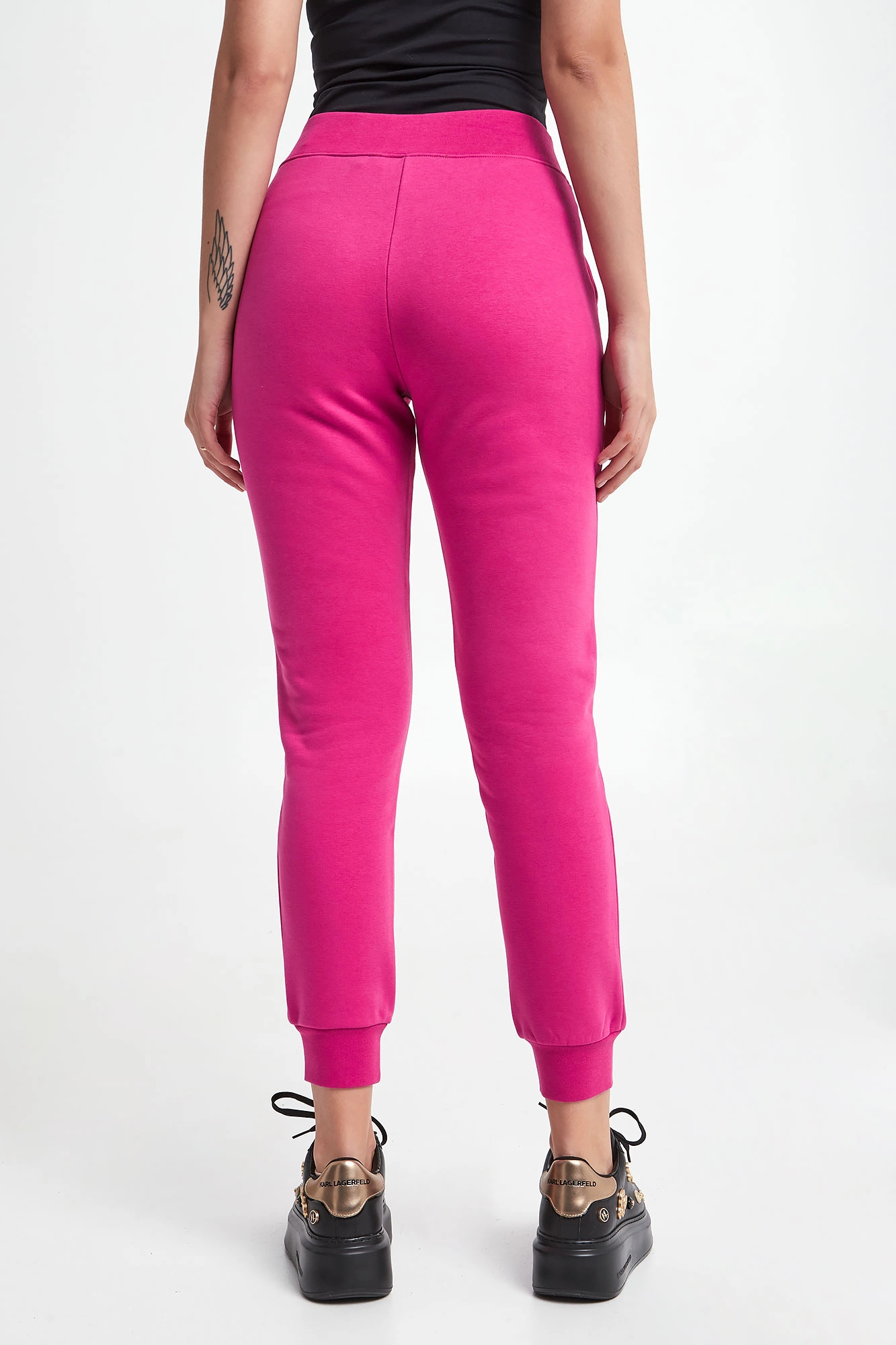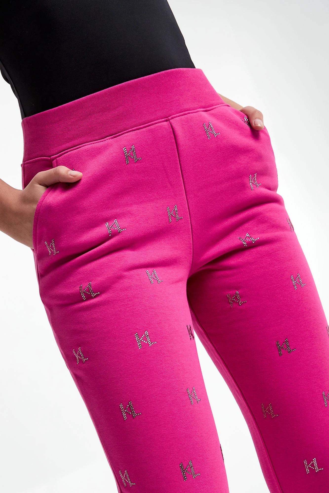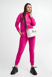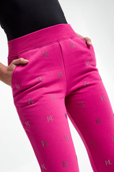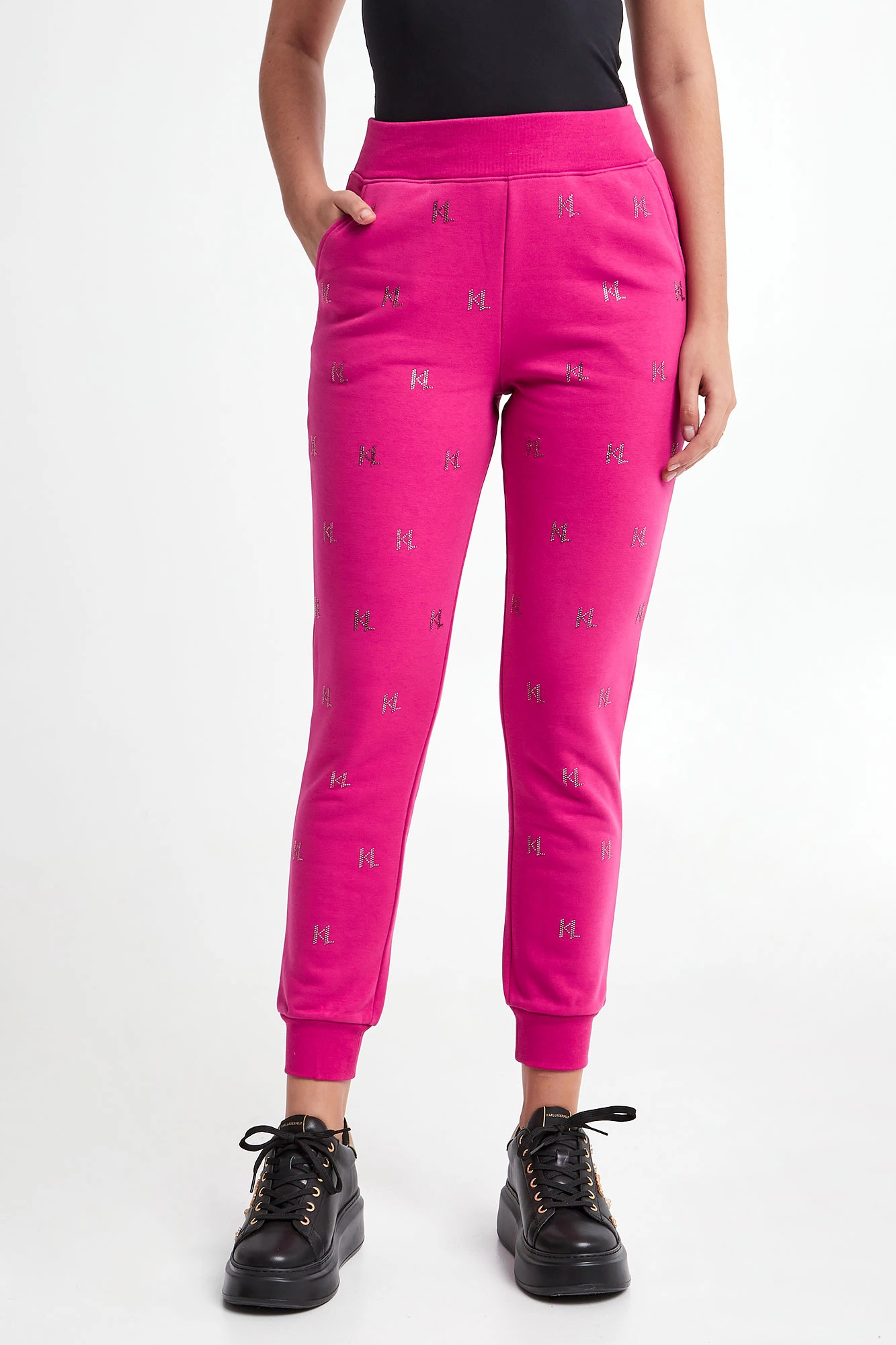 Spodnie dresowe marki Karl Lagerfeld w kolorze czarnym, pochodzący z linii "Karl Cares", która wykorzystuje organiczne tkaniny, by wspierać zrównoważoną modę. Fason typu jogger. Model z dwoma wpuszczanymi kieszeniami. Na całości charakterystyczny wzór dla marki z cyrkonii. W pasie i na nogawkach elastyczny ściągacz. Wykonane z miękkiej, mięsistej bawełnianej tkaniny.