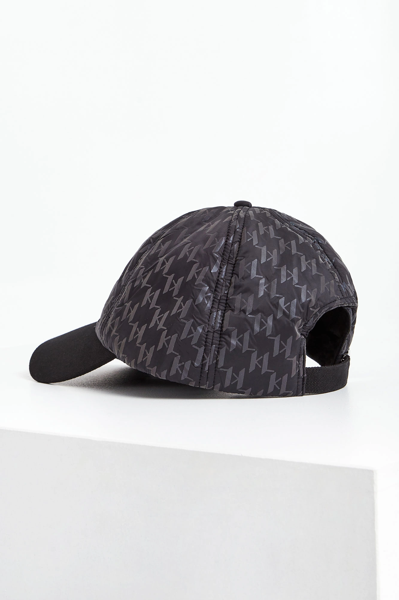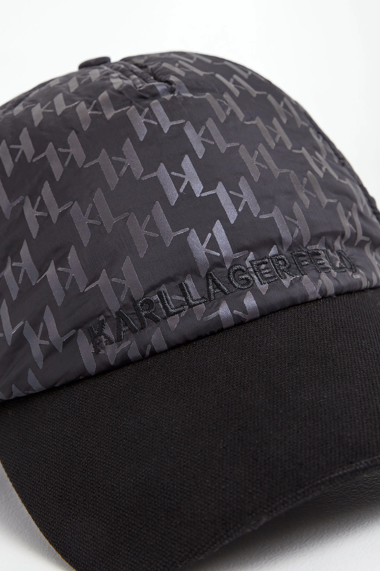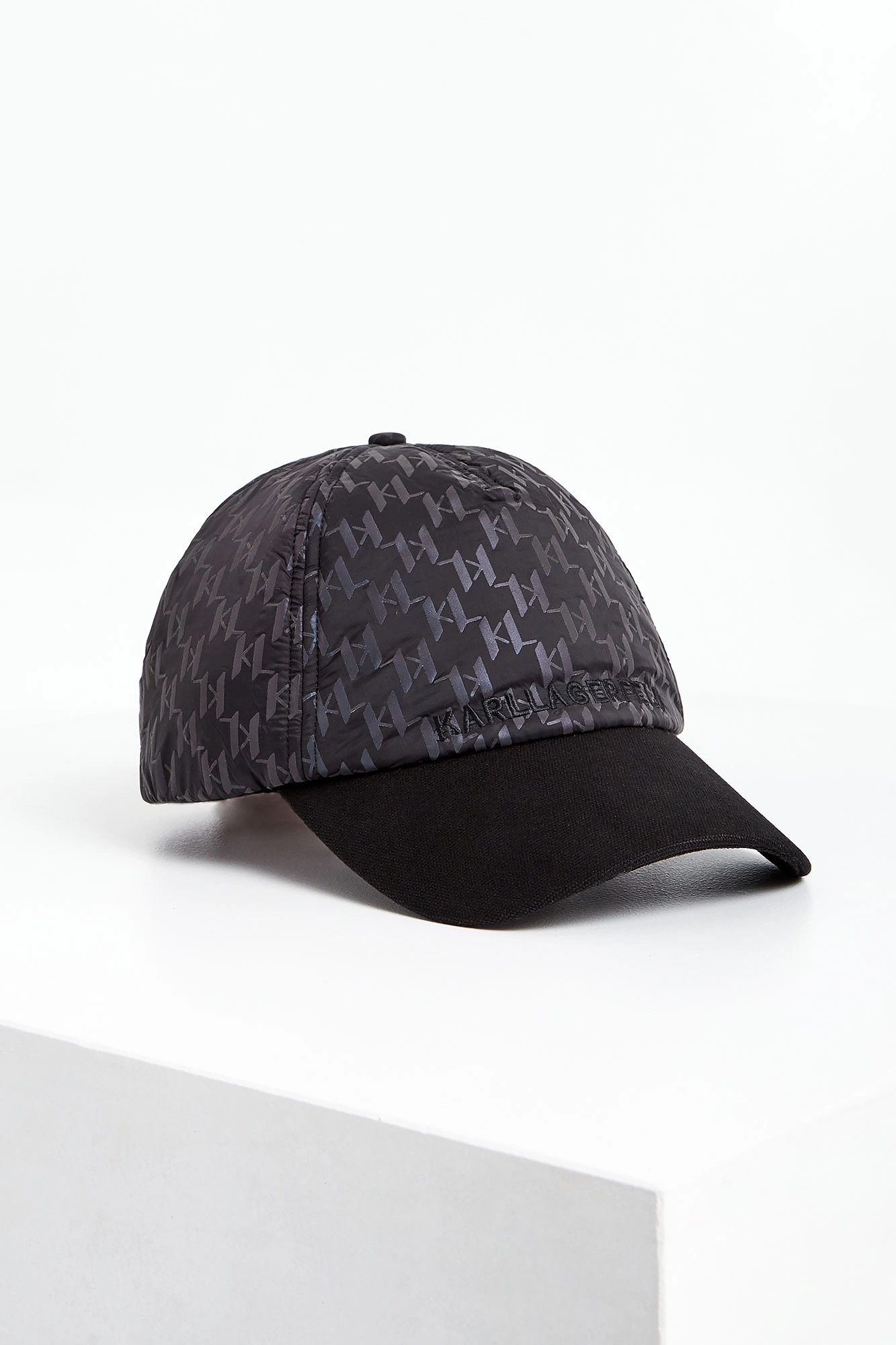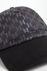 Czapka z daszkiem marki Karl Lagerfeld w czarnym kolorze. Wykonana z nylonowego materiału. Na całości mieniący się nadruk z monogramem marki. Z przodu czarny haft z nazwą marki. Daszek w jednolitym czarnym kolorze. Z tyłu logowane, regulowane zapięcie z klamrą w srebrnym kolorze.