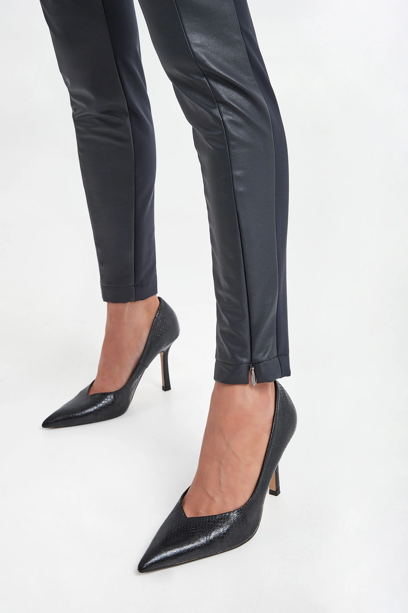 Legginsy marki Sportalm w kolorze granatowym. Model z wysokim stanem. Przód wykonany z imitacji skóry, tył natomiast z elastycznego materiału. Wzdłuż nogawki szwy zakończone krótkimi zamkami błyskawicznymi. Fason skinny.