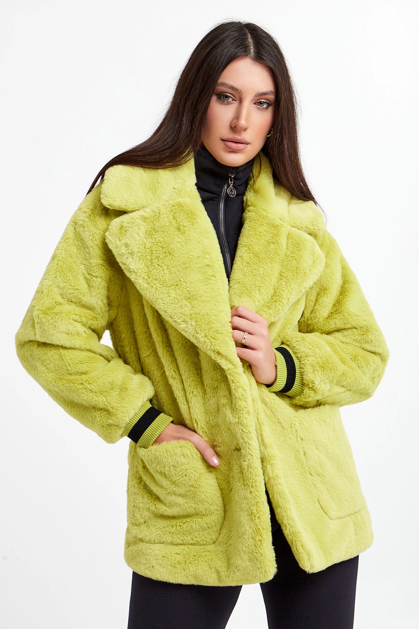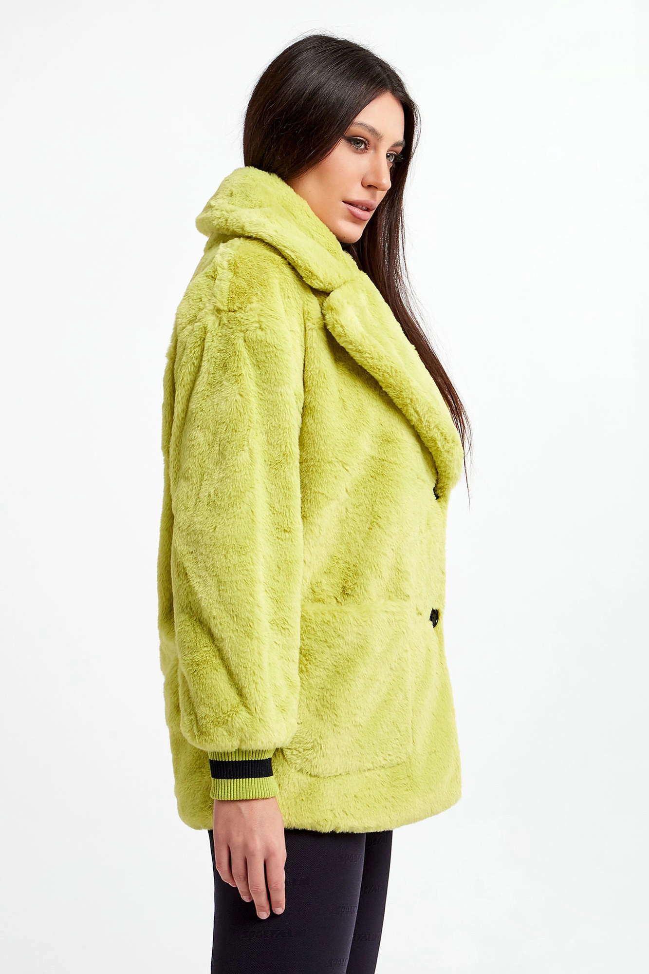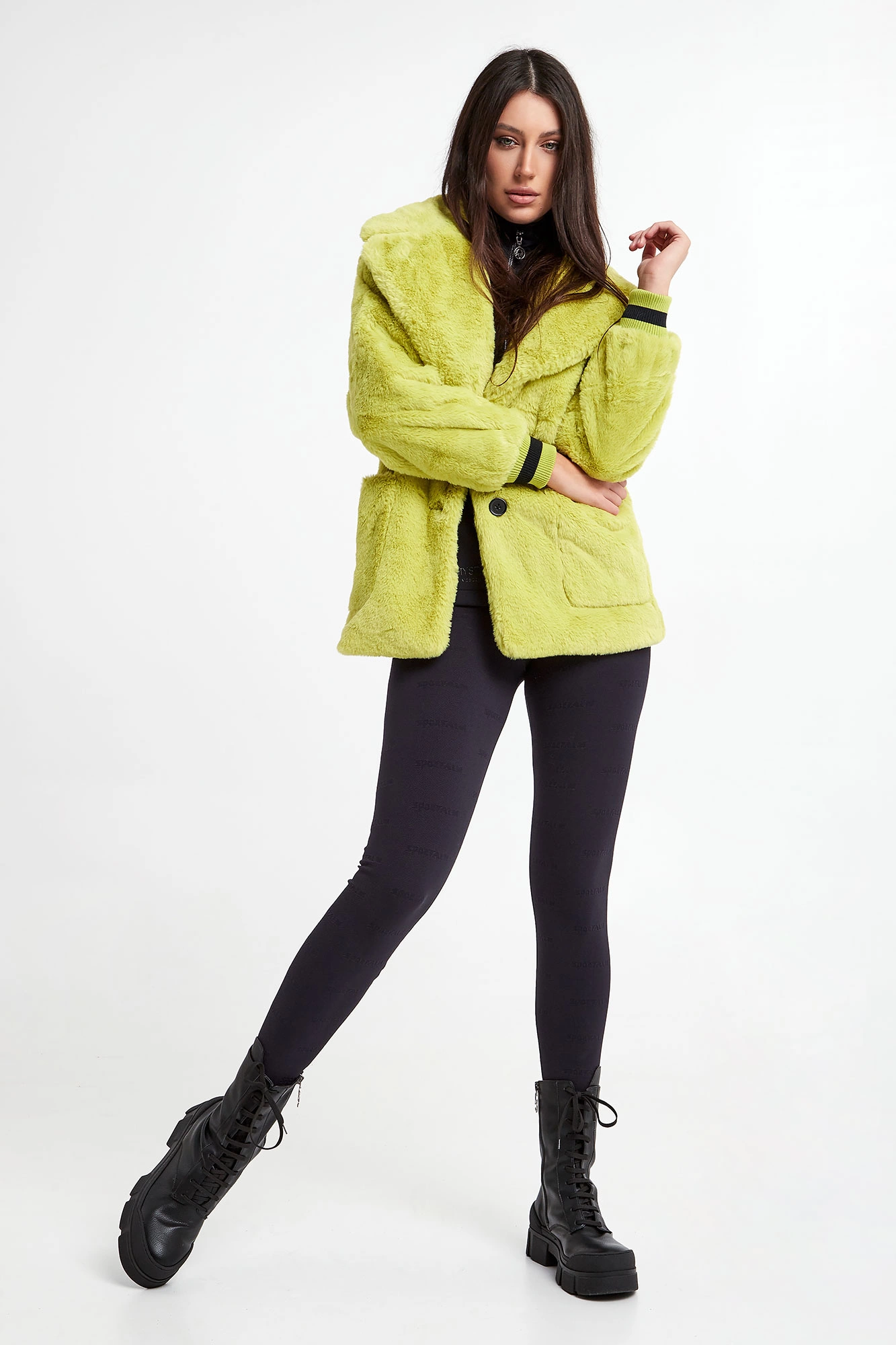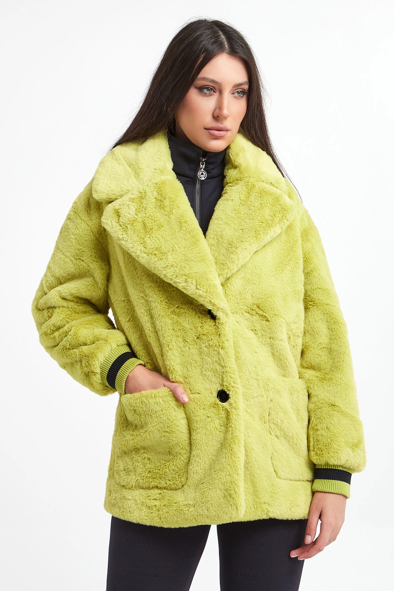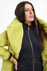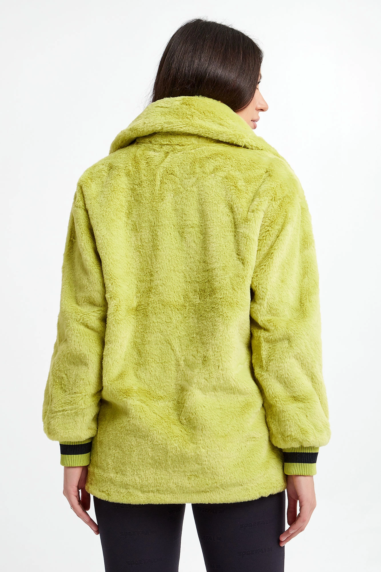 Futro marki Sportalm w limonkowym kolorze. Wykończone klasyczną klapą. Na przodzie dwie naszyte, otwarte kieszenie. Model zapinany za pomocą kontrastowych czarnych guzików. Rękawy wykończone elastycznym, prążkowanym ściągaczem z czarnym paskiem. Wewnątrz czarno-białe abstrakcyjne wzory. Fason typu regular.