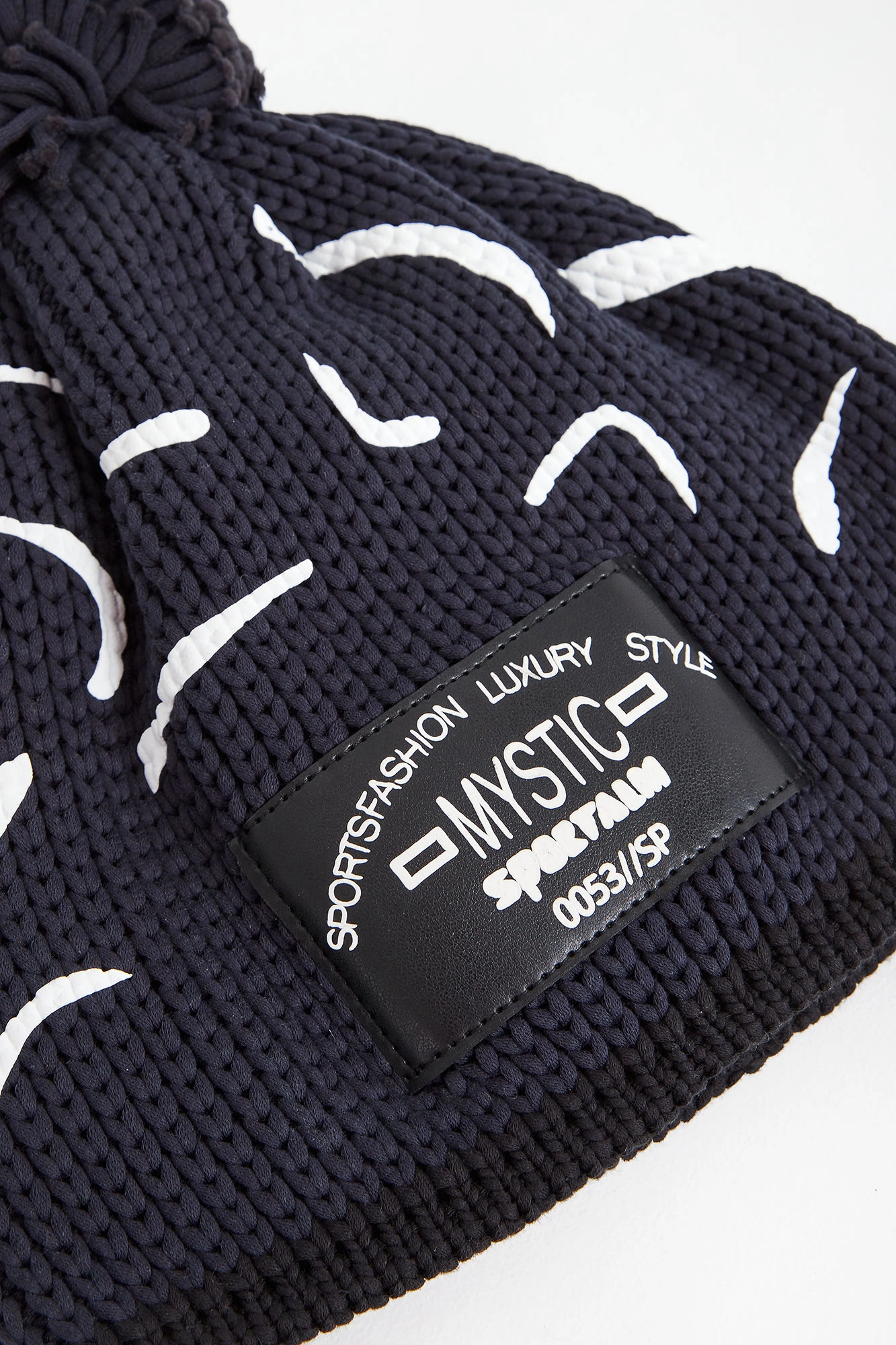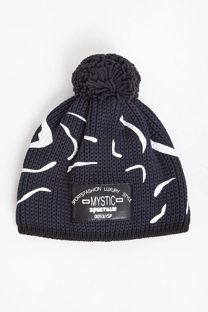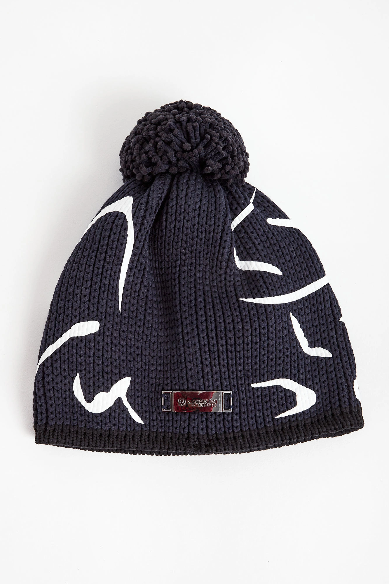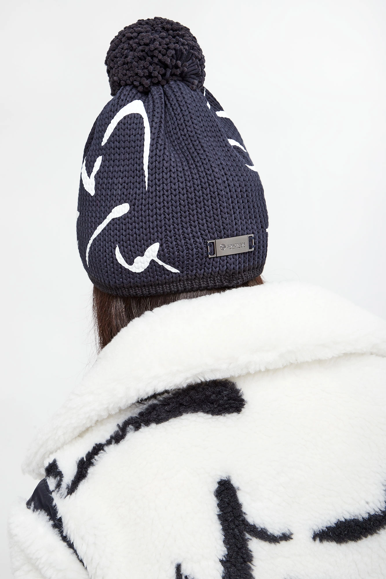 Czapka marki Sportalm w kolorze granatowym. Z zewnątrz wykonana z dzianiny, a wnętrze wyścieła polar. Model z odpinanym bawełnianym pomponem. Na całości kontrastowy nadruk z motywem motyla. Z przodu naszywka z ekoskóry, a z tyłu metalowa aplikacja z nazwą marki.