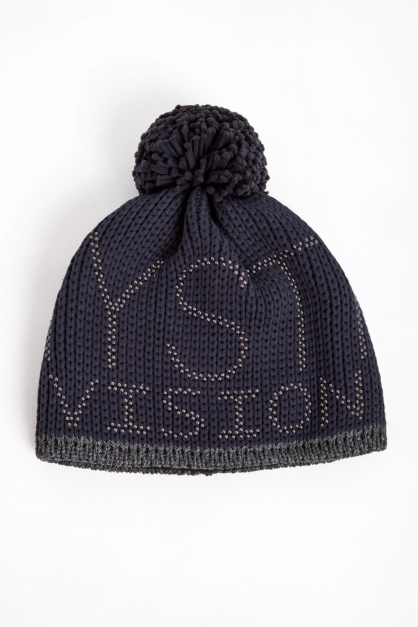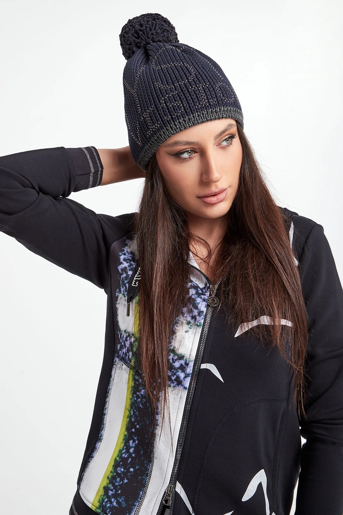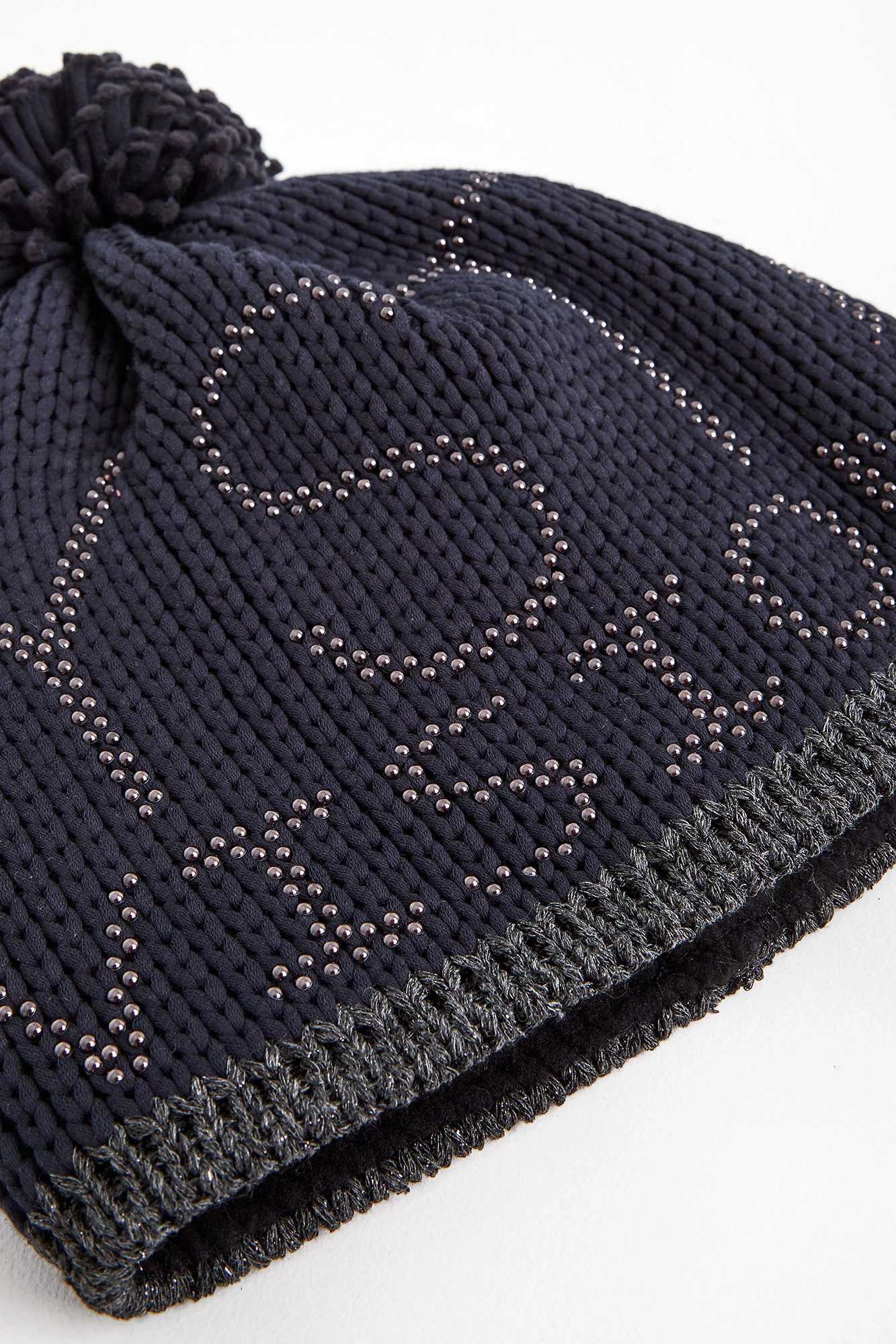 Czapka marki Sportalm w kolorze granatowym. Wykonana z plecionej tkaniny dzianinowej. Model z bawełnianym, odpinanym pomponem. Na froncie duży napis z nazwą kolekcji wykonany z połyskujących jettów. Na dole wykończona połyskującą, srebrną nitką. Wyściółka wykończona polarem.