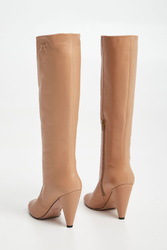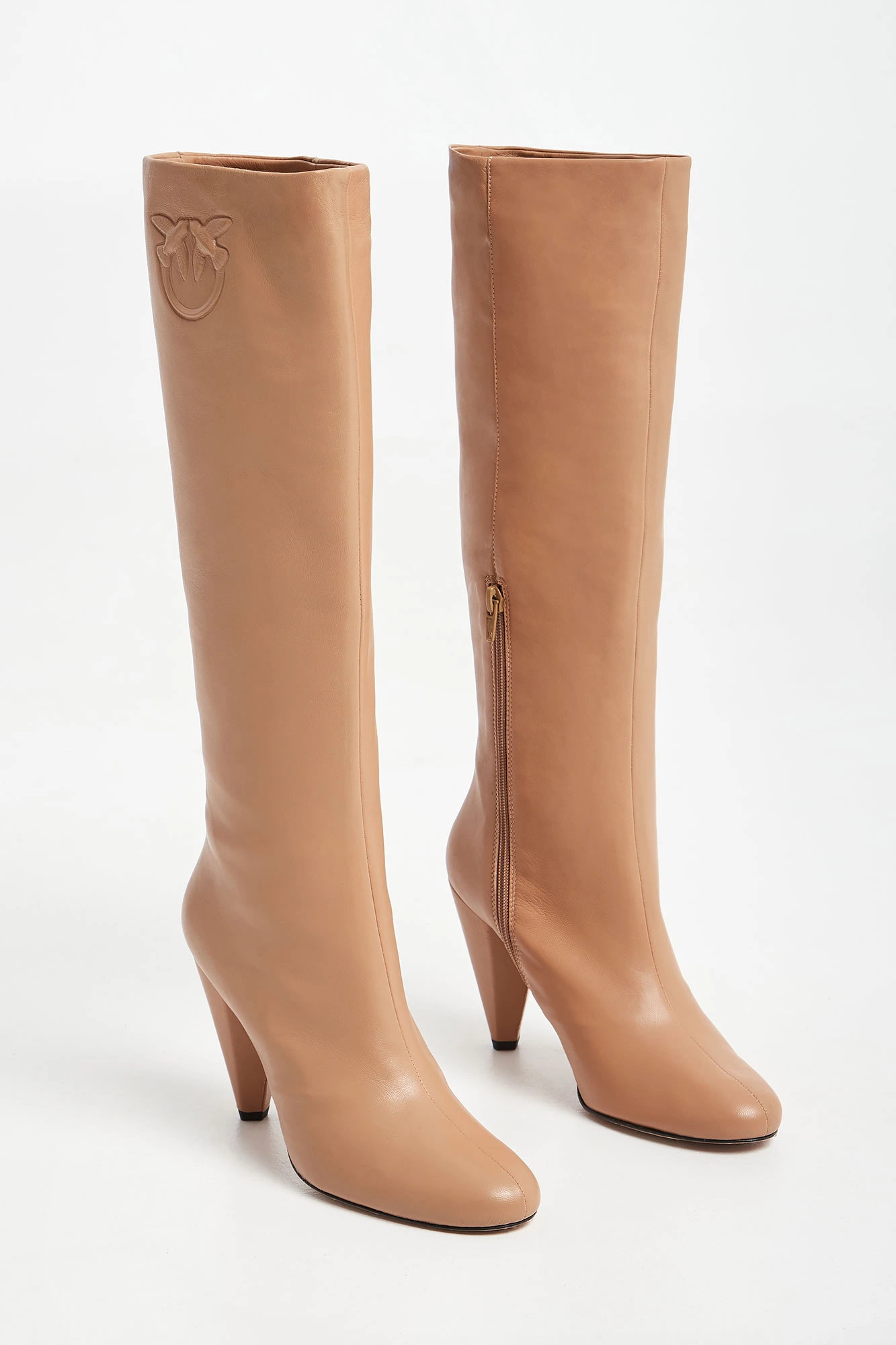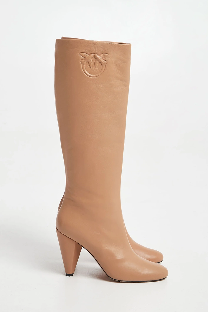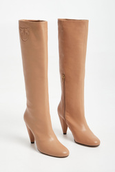 Kozaki marki Pinko w kamelowym kolorze. Wykonane z gładkiej naturalnej skóry. Przed kolano. Na zewnętrznej stronie cholewki wytłoczone logo Love Birds. Z wewnętrznej strony zamek przy kostce, ułatwiający zakładanie. Skórzana podeszwa. Stożkowy obcas.