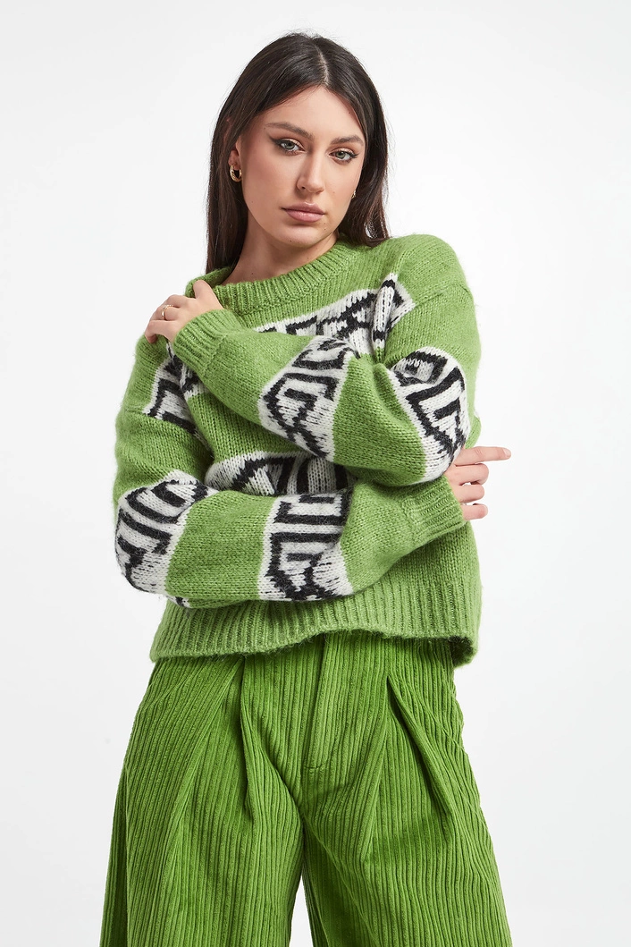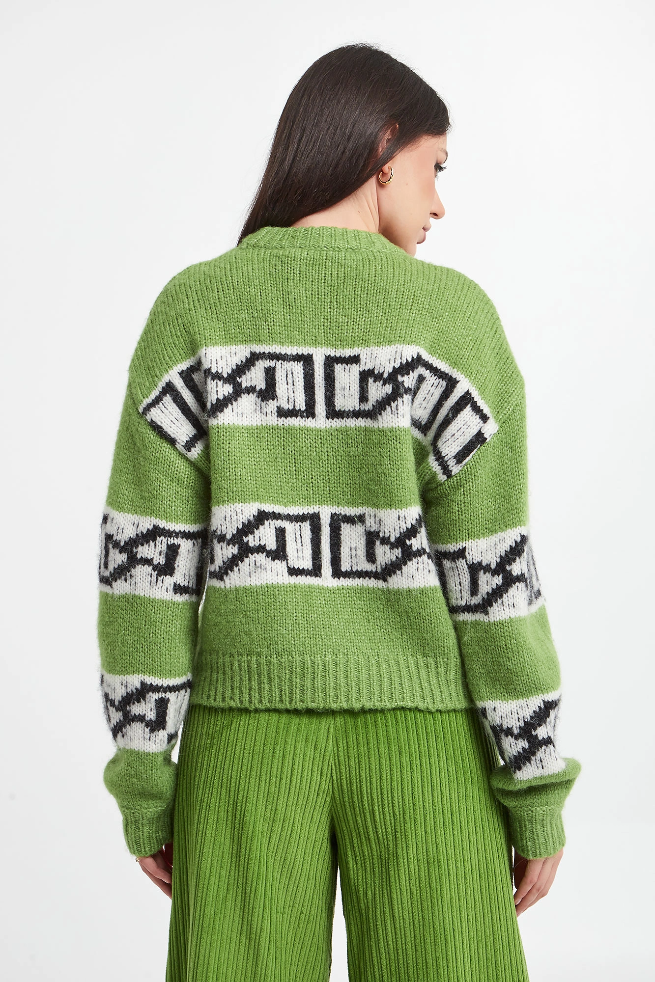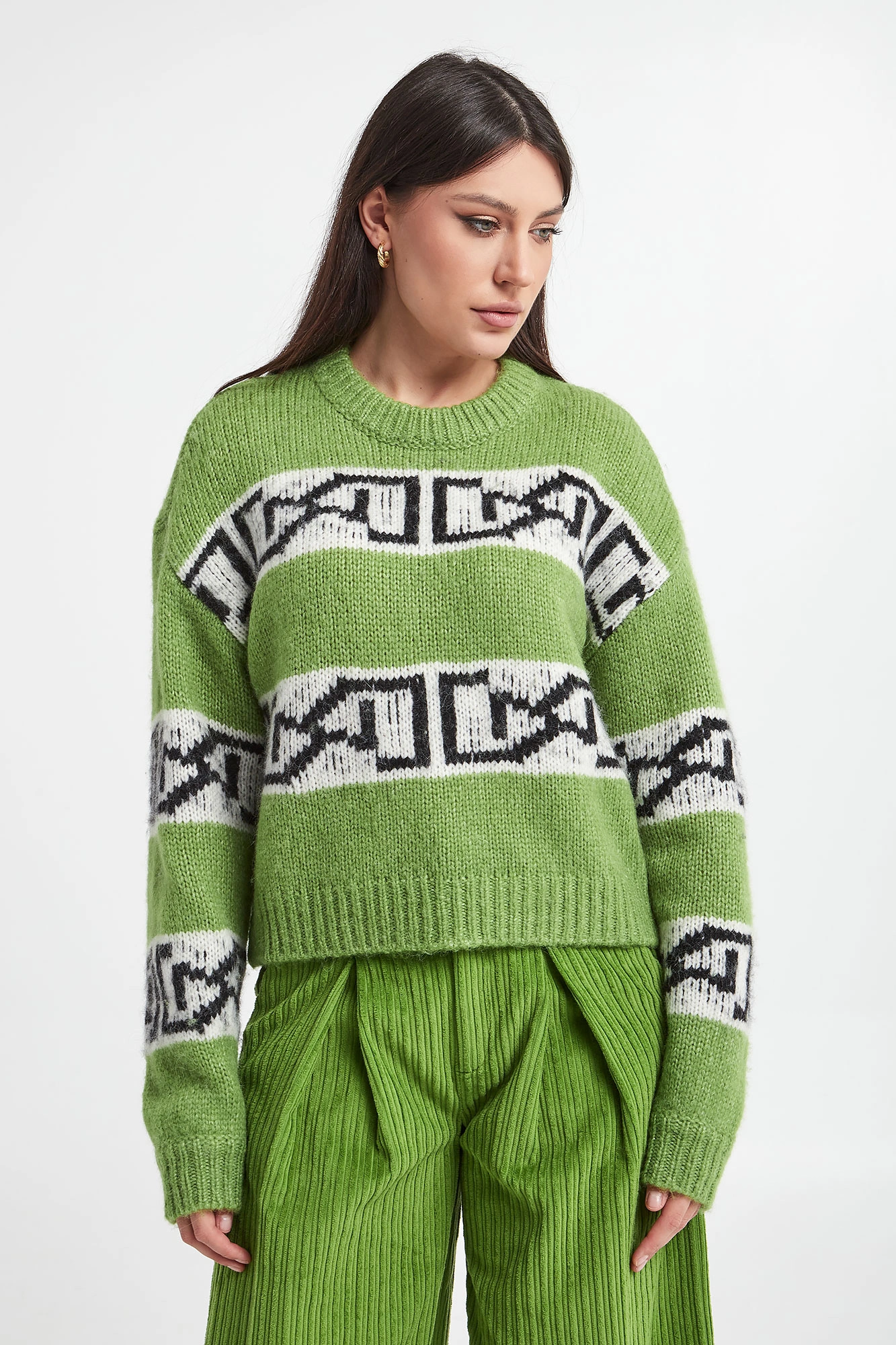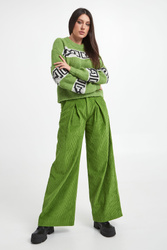 Wełniany sweter marki Gestuz w zielonym kolorze. Wykonany z miękkiej tkaniny z dodatkiem wełny z alpaki, wełny owczej oraz elastycznych włókien. Na całości poziomy nadruk w biało-czarnym kolorze. Obniżona linia ramion. Dekolt typu o-neck, długie rękawy i dół wykończone ściągaczem. Nieco krótszy fason typu relaxed.
