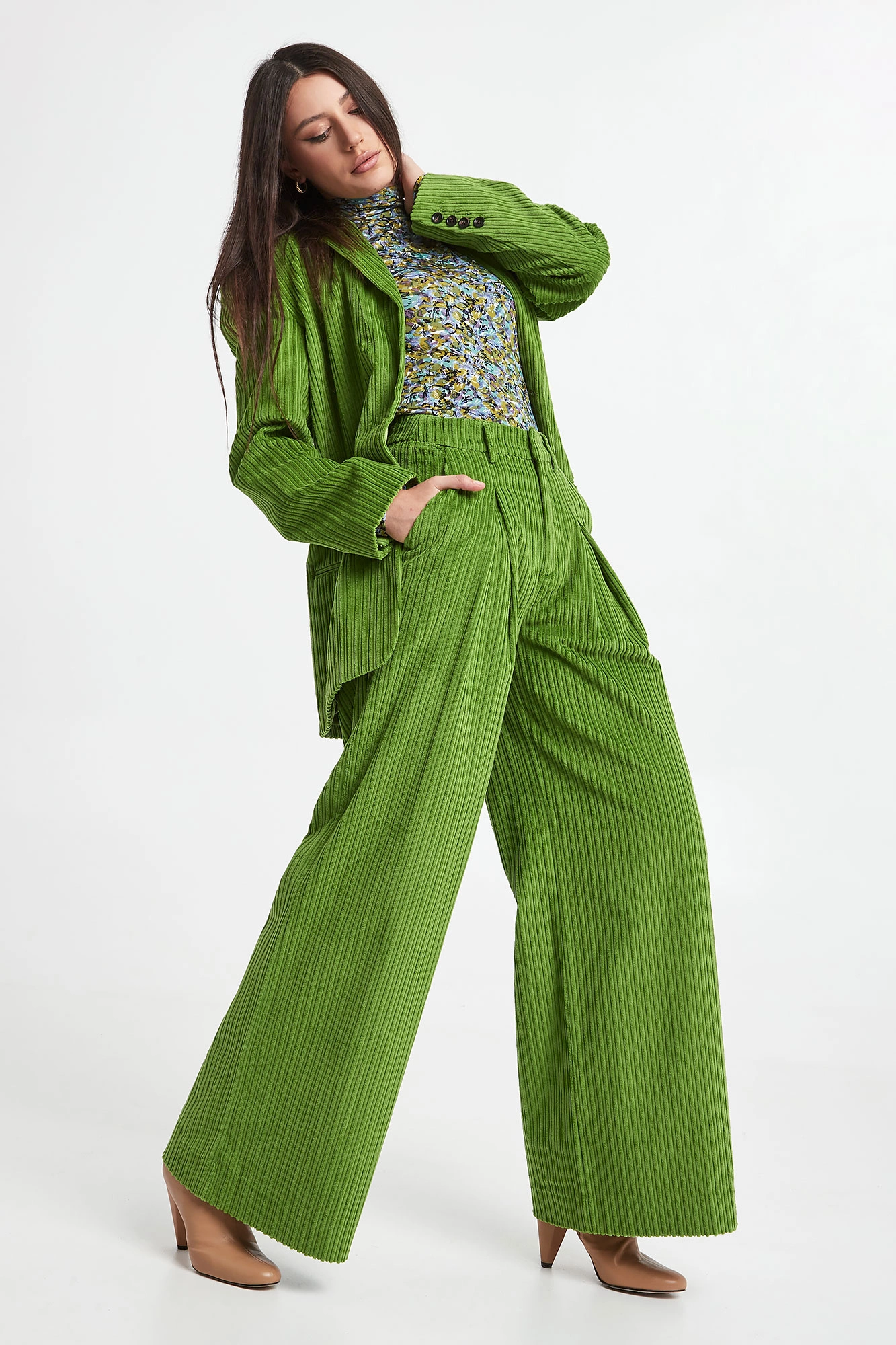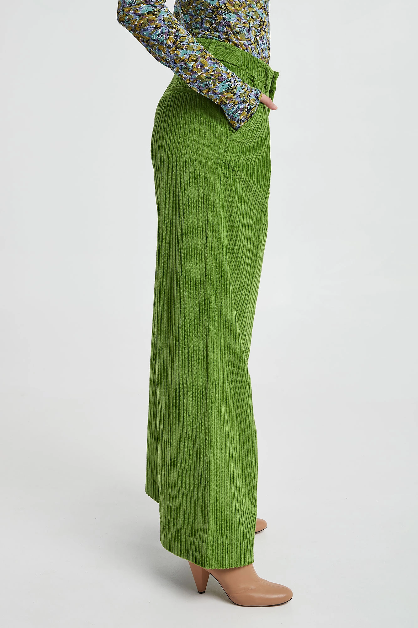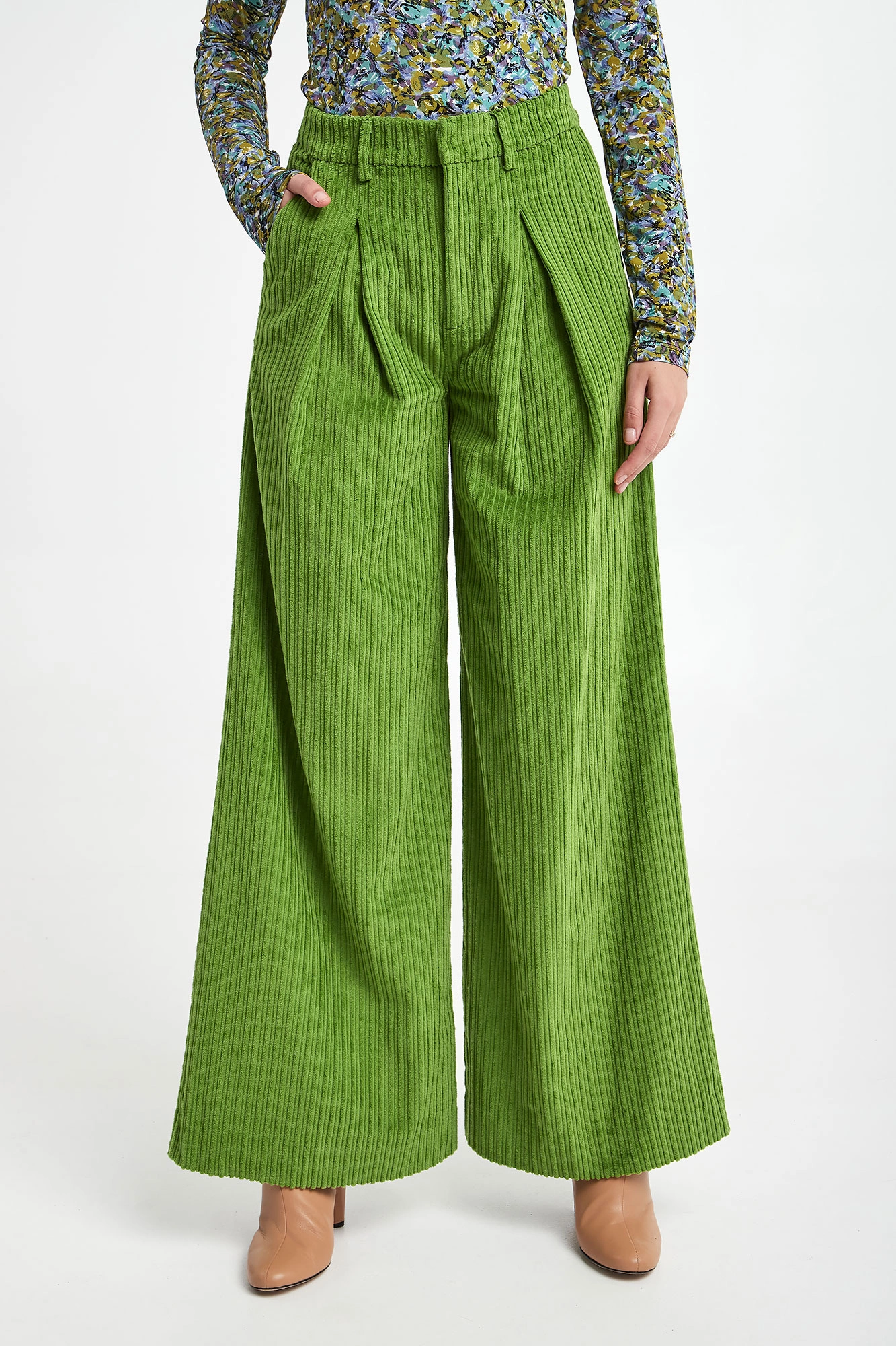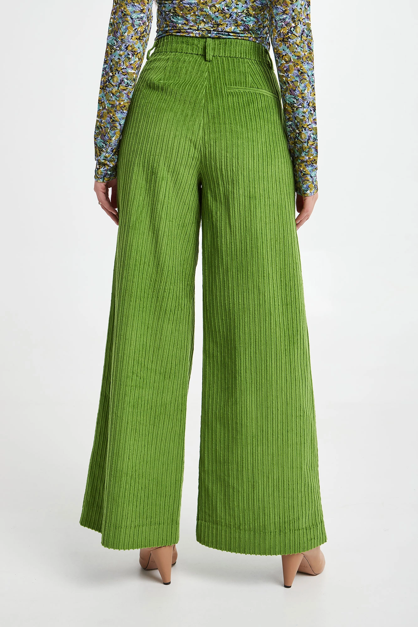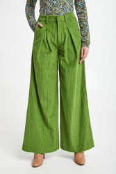 Spodnie sztruksowe marki Gestuz w zielonym kolorze. Rozszerzane, typu szwedy/wide leg. Wysoki stan. Z przodu zakładki. Zapinane za pomocą zamka i zakładek. Model z trzema wpuszczanymi kieszeniami. W talii szlufki. Wykonane z czystej bawełny.