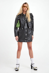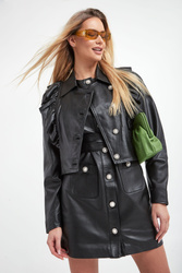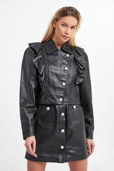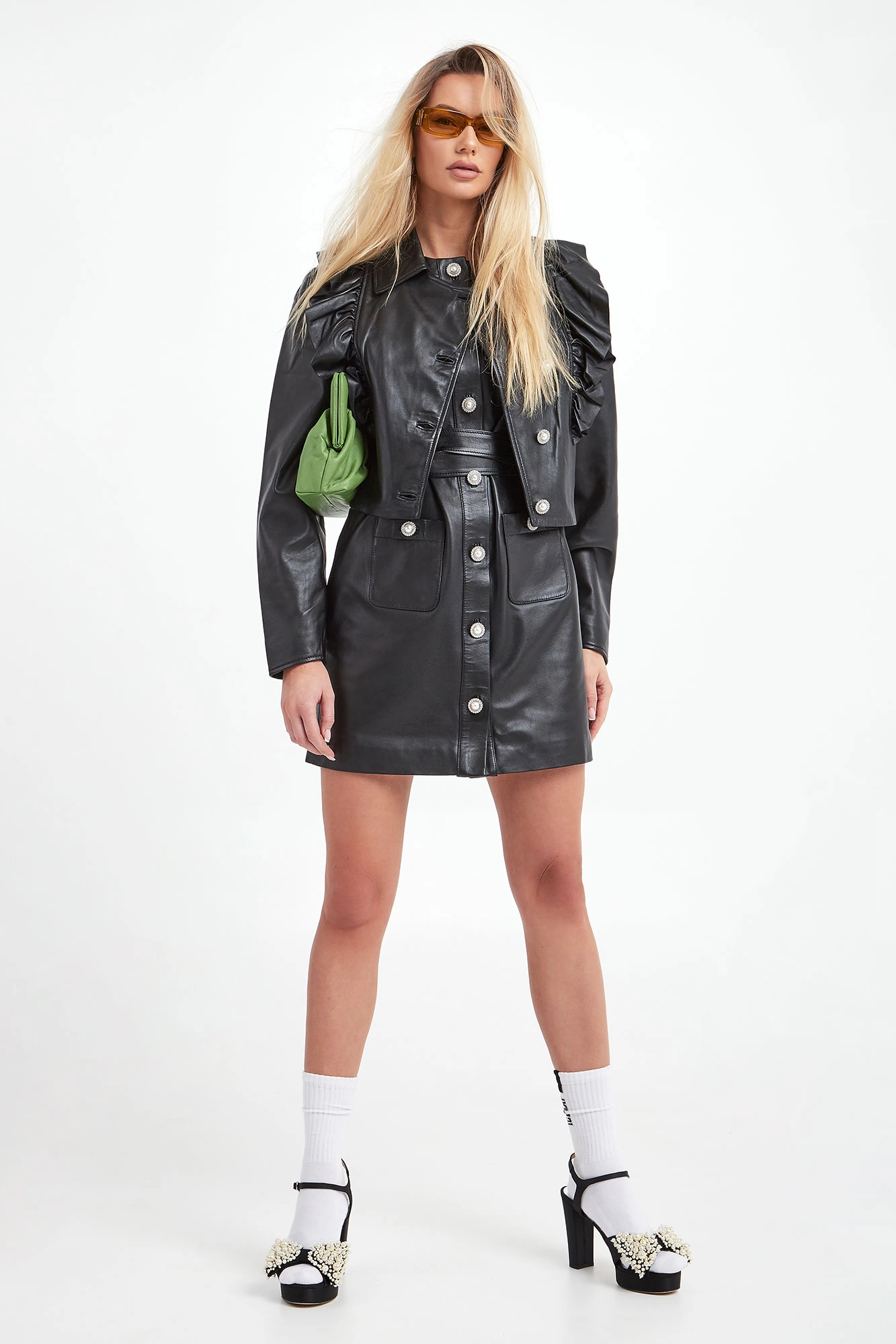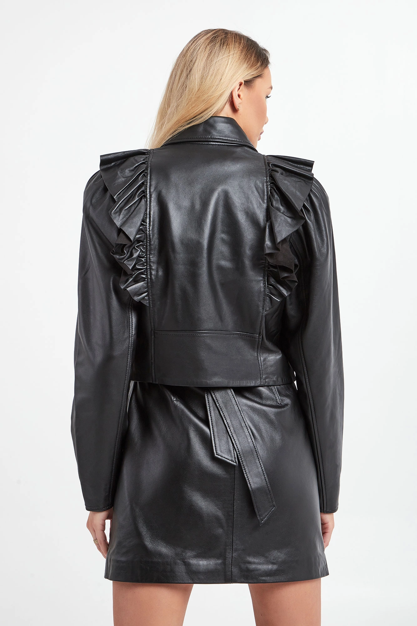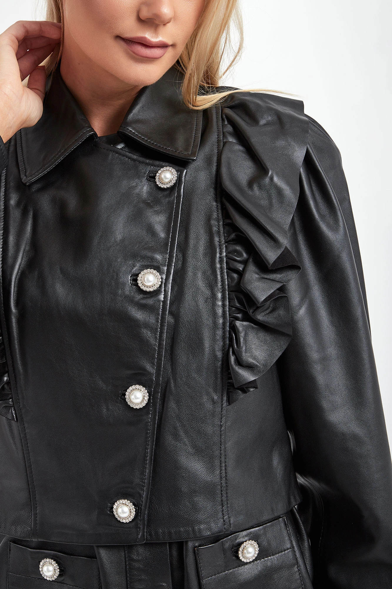 Skórzany żakiet marki Custommade w czarnym kolorze. Wykonany z miękkiej skóry jagnięcej. Zapinany po skosie za pomocą biżuteryjnych guzików ozdobionych perłami i kryształkami. Model z kołnierzem i falbanami przechodzącymi przez ramiona. Rękawy z bufkami. Z tyłu przeszycia. Fason typu regular.