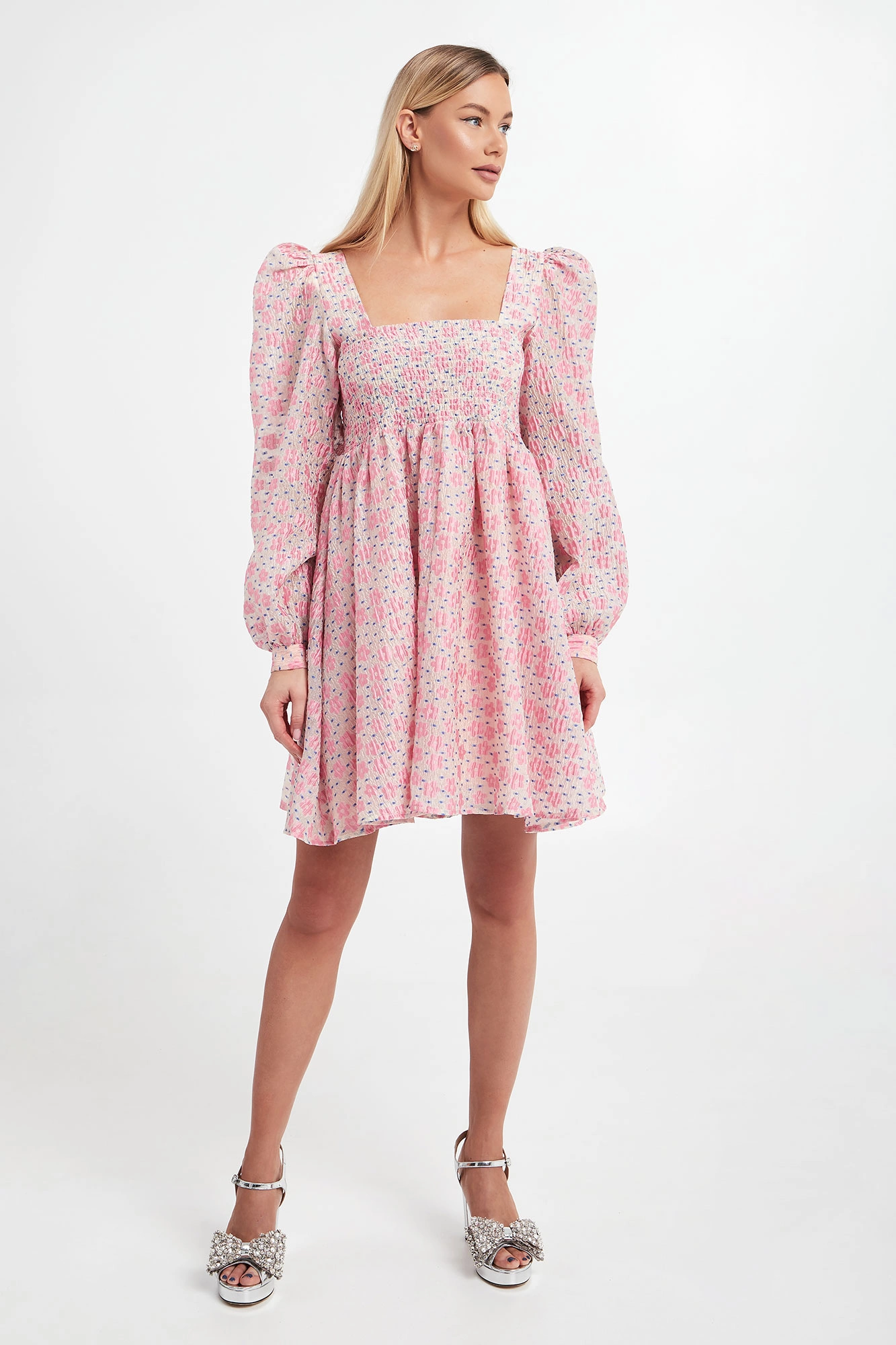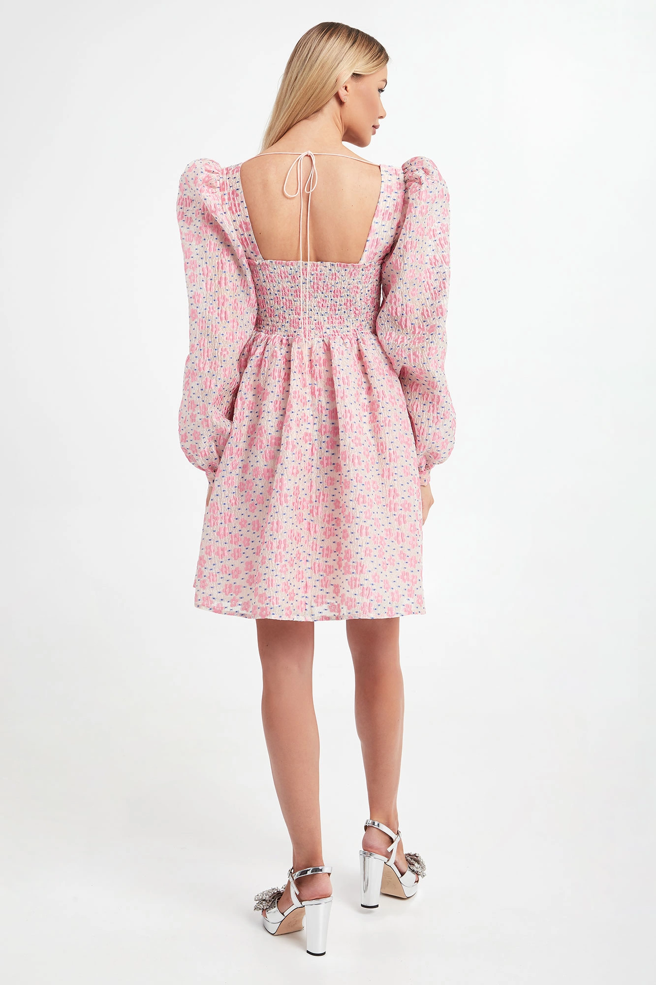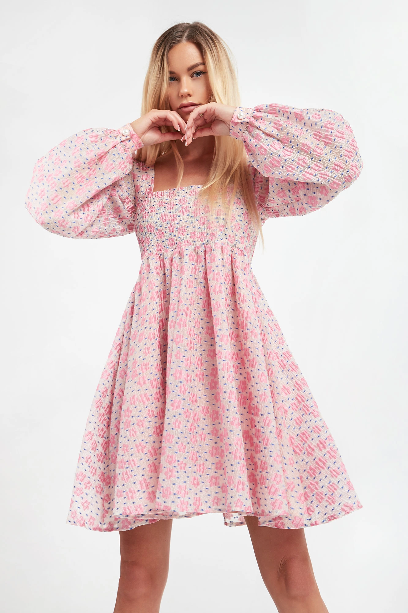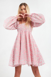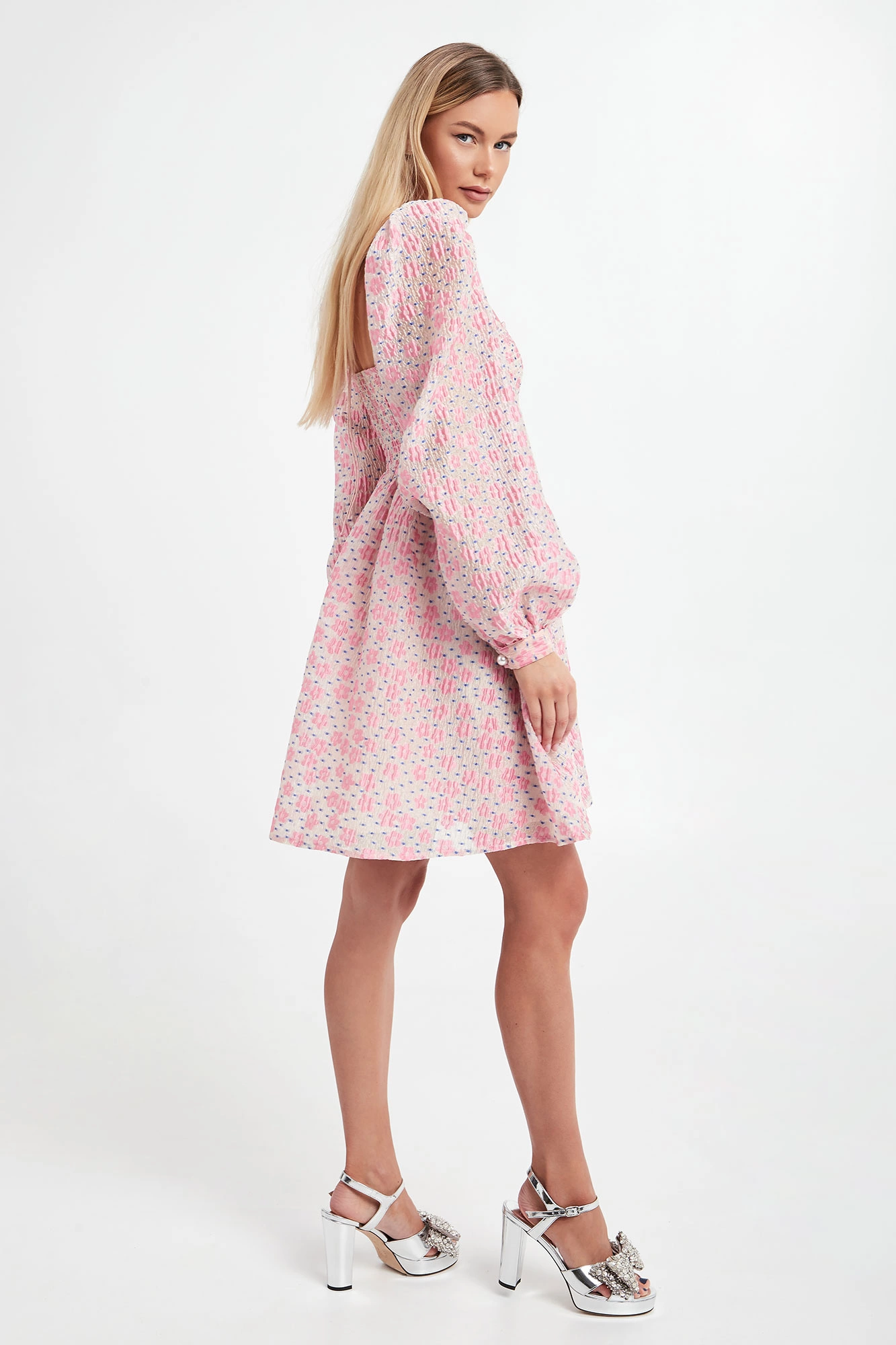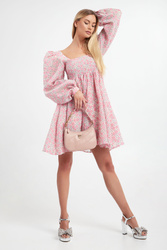 Sukienka marki Custommade w różowym kolorze. Wykonana z czystej bawełny organicznej. Na całości strukturalny wzór z motywem kwiatów i niebieskich groszków. Góra marszczona, wykonana z elastycznego ściągacza. Dekolt karo. Bufiaste, długie rękawy zakończone mankietem zapinanym za pomocą perłowych guzików. Wiązana z tyłu za pomocą troczków. Dół rozkloszowany. Fason typu regular o długości mini.