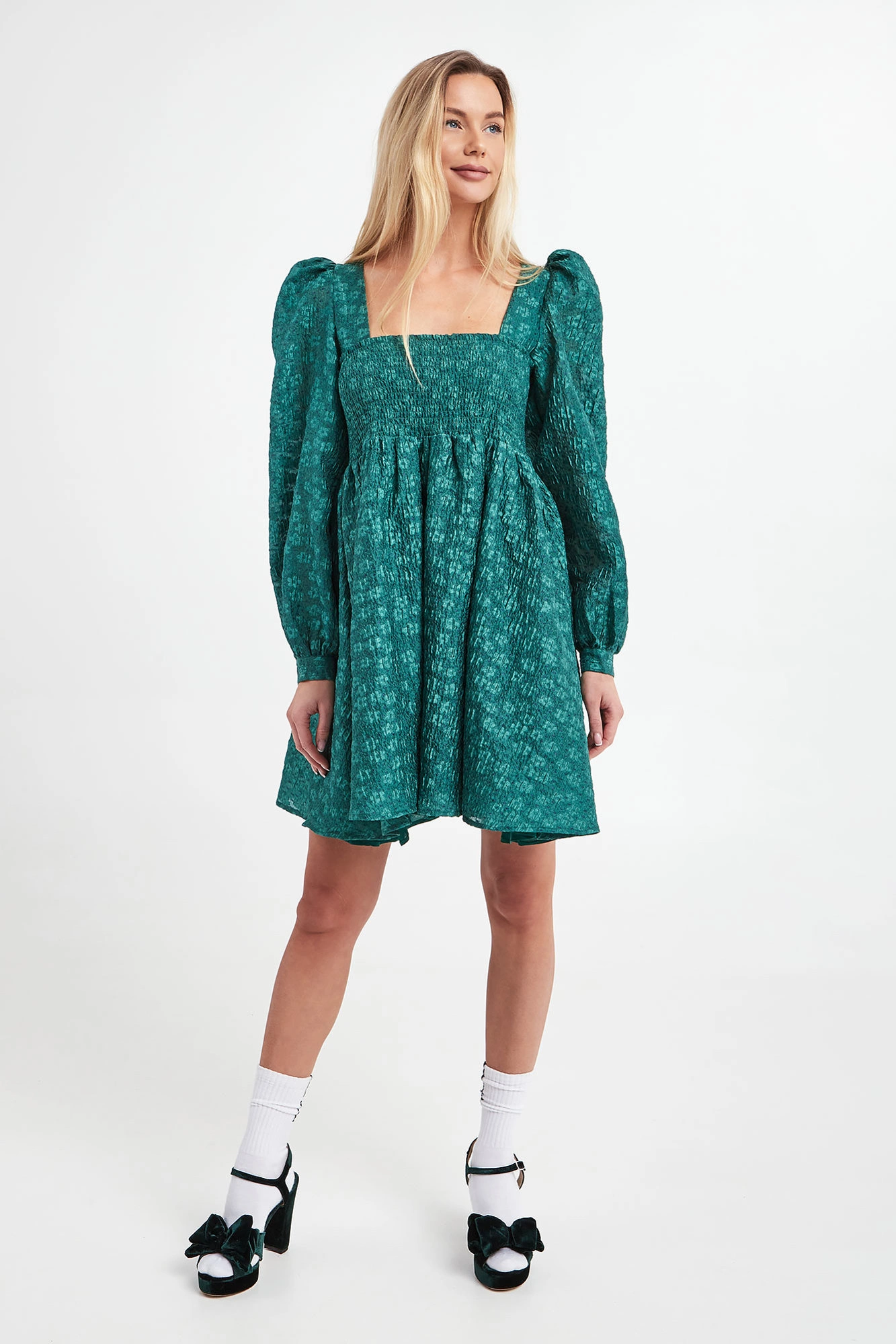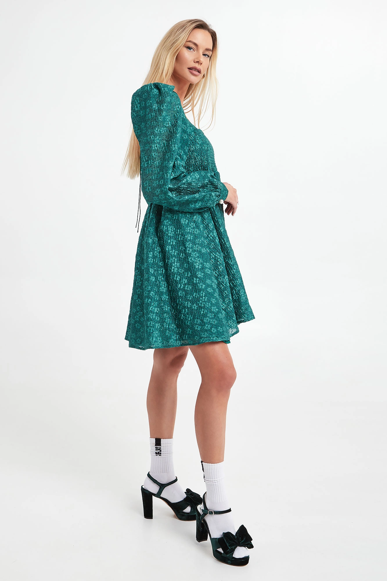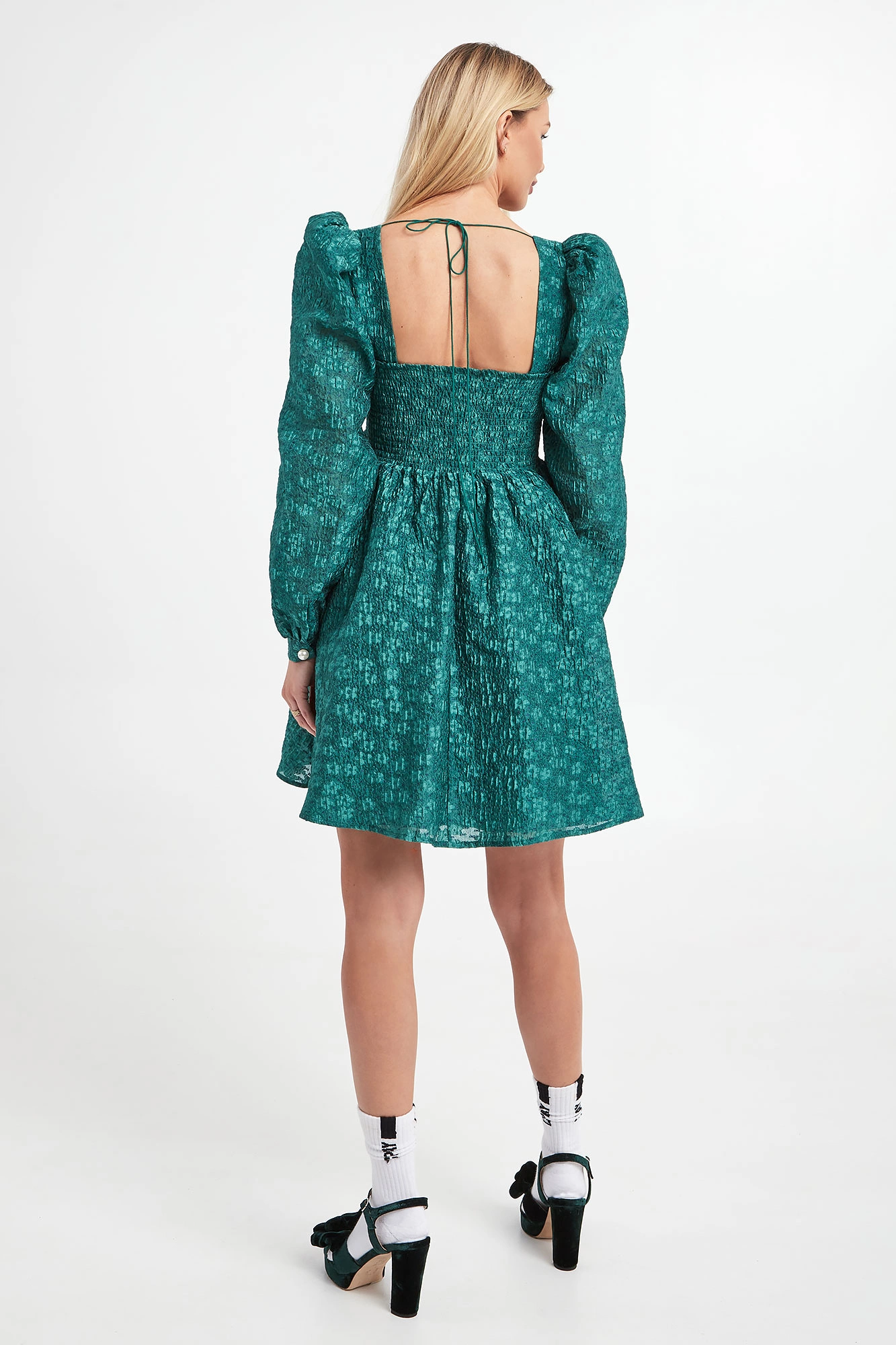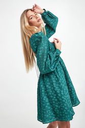 Sukienka marki Custommade w kolorze butelkowej zieleni. Wykonana z czystej bawełny organicznej. Na całości strukturalny wzór z motywem kwiatów. Góra marszczona, wykonana z elastycznego ściągacza. Dekolt karo. Bufiaste, długie rękawy zakończone mankietem zapinanym za pomocą perłowych guzików. Wiązana z tyłu za pomocą troczków. Dół rozkloszowany. Fason typu regular o długości mini.