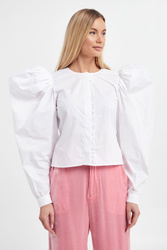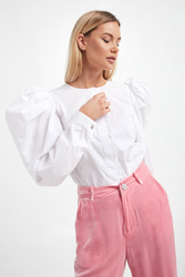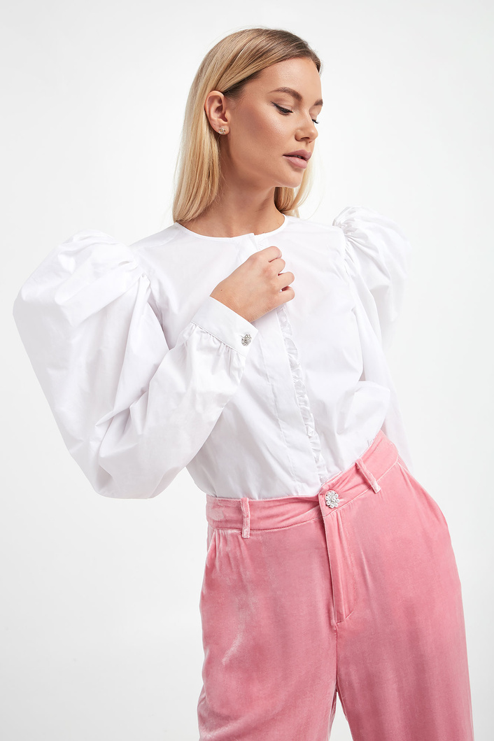 Koszula marki Custommade w kolorze białym. Wykonana z bawełnianej popeliny. Zapinana na guziki, kryte taśmą z falbanką. Bufiaste, długie rękawy z marszczeniami zakończone wąskimi mankietami zapinanymi na kryształowy guzik. Fason regular.