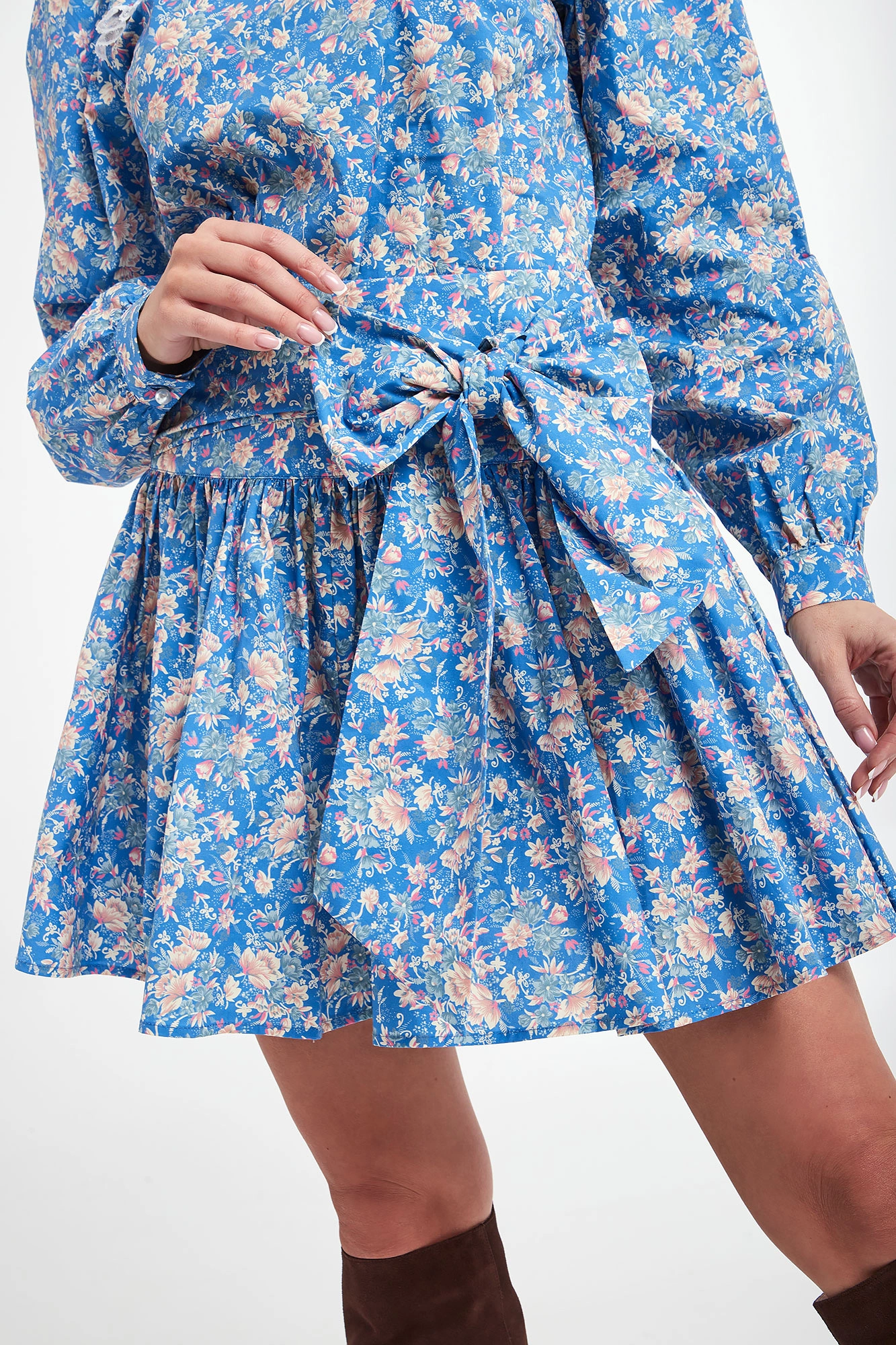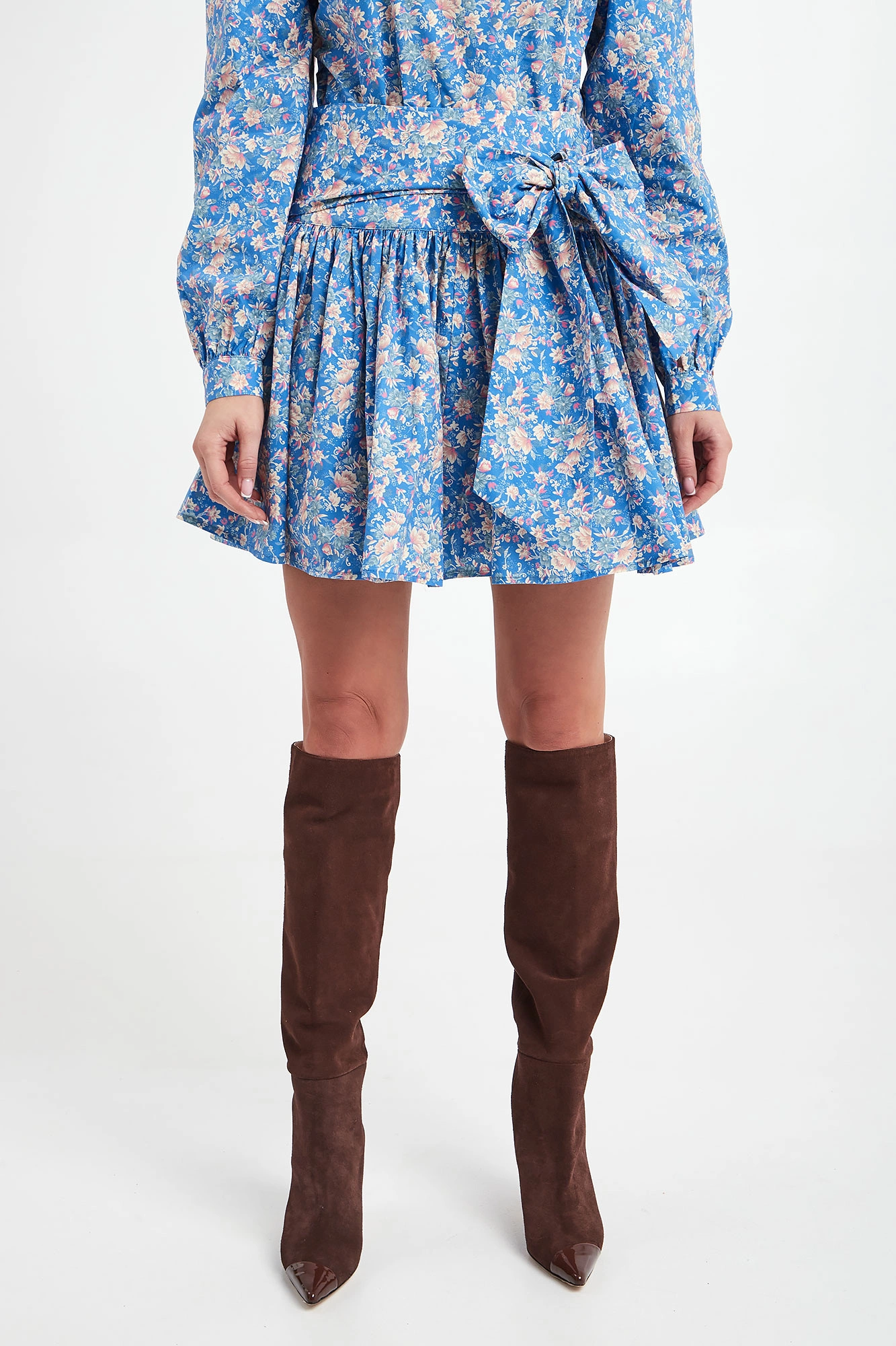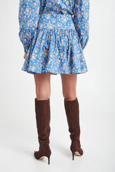 Spódnica marki Custommade w niebieskim kolorze. Na całości kwiatowy wzór. Wykonana z czystej, popelinowej bawełny. Zapinana z tyłu na zamek. Góra gładka z paskiem wiązanym z tyłu na kokardę. Dół rozkloszowany, wykończony falbanami. Fason typu regular. Długość mini.