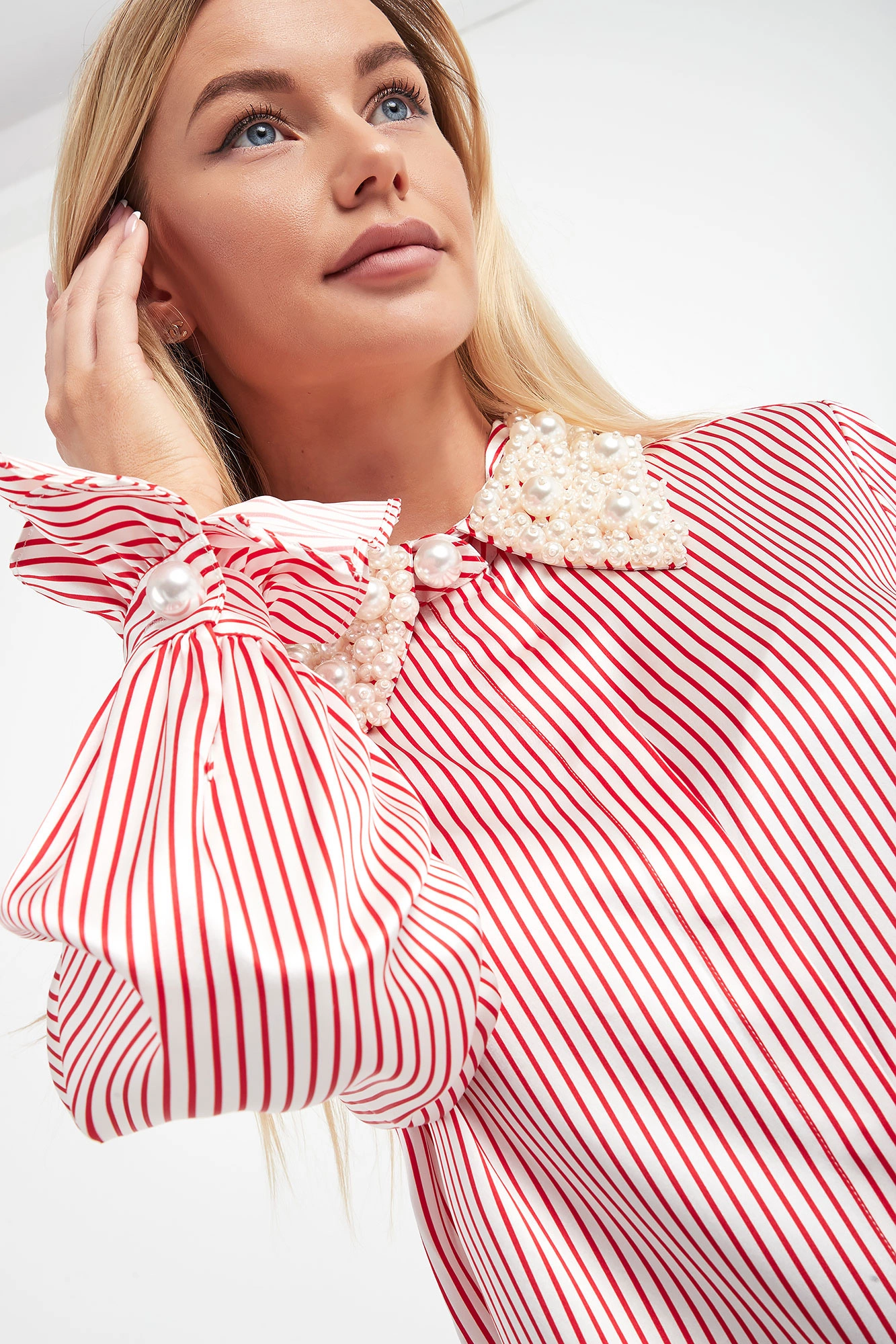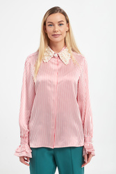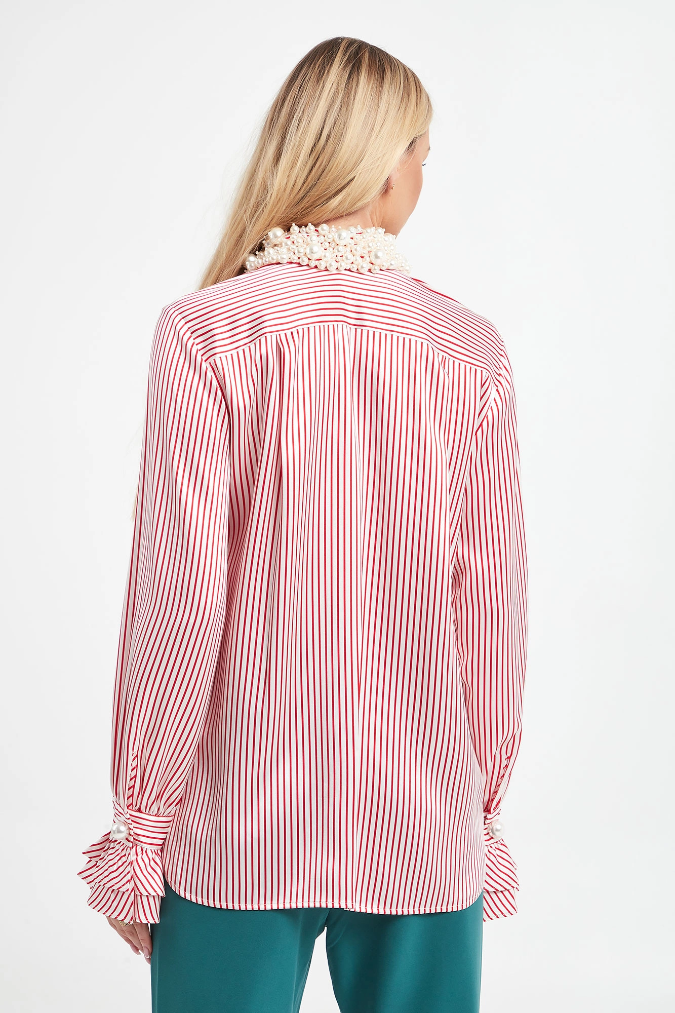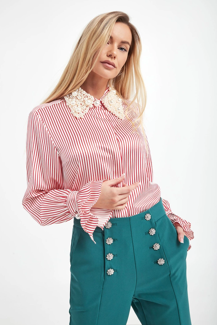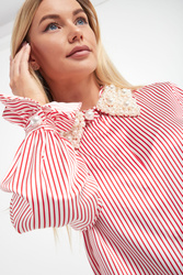 Koszula marki Custommade w kolorze biało-czerwonym. Wykonana z jedwabiu. Model z bardzo ozdobnym kołnierzykiem z perłami. Zapinana na guziki z krytą plisą. Na całości paski. Długie, wąskie rękawy zakończone falbaniastymi mankietami zapinanymi na perłowy guzik. Fason regular.