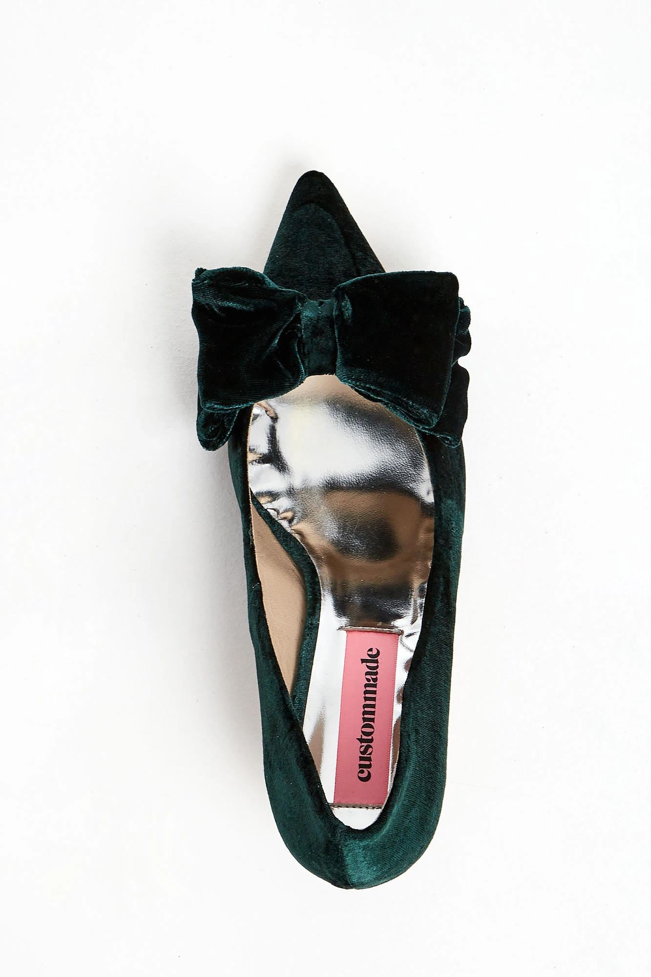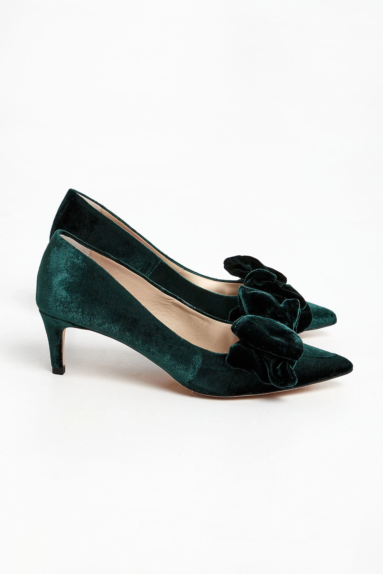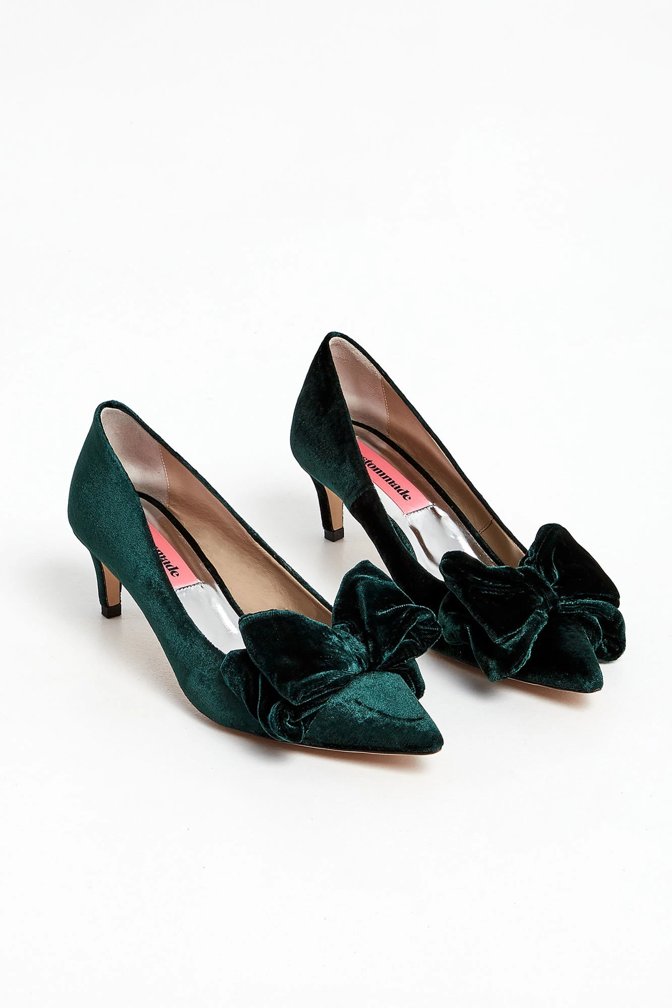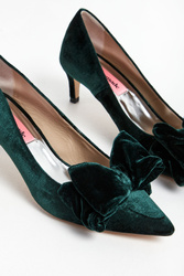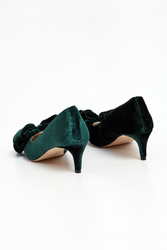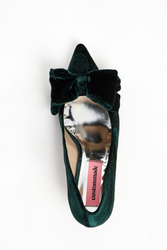 Szpilki marki Custommade w kolorze szmaragdowej zieleni. Z przodu kryte palce i duża, podwójna kokarda. Materiał wierzchni wykonany z aksamitu. Podeszwa w beżowym kolorze.
