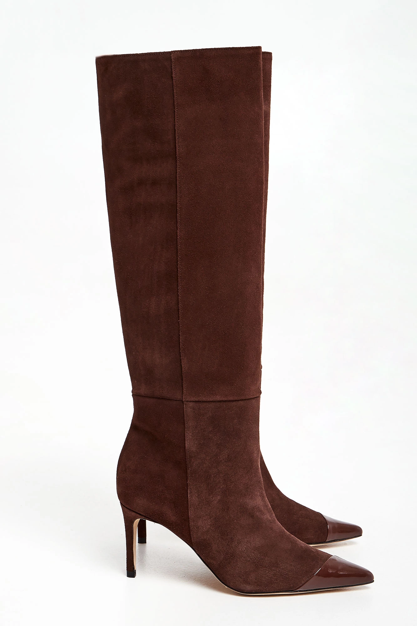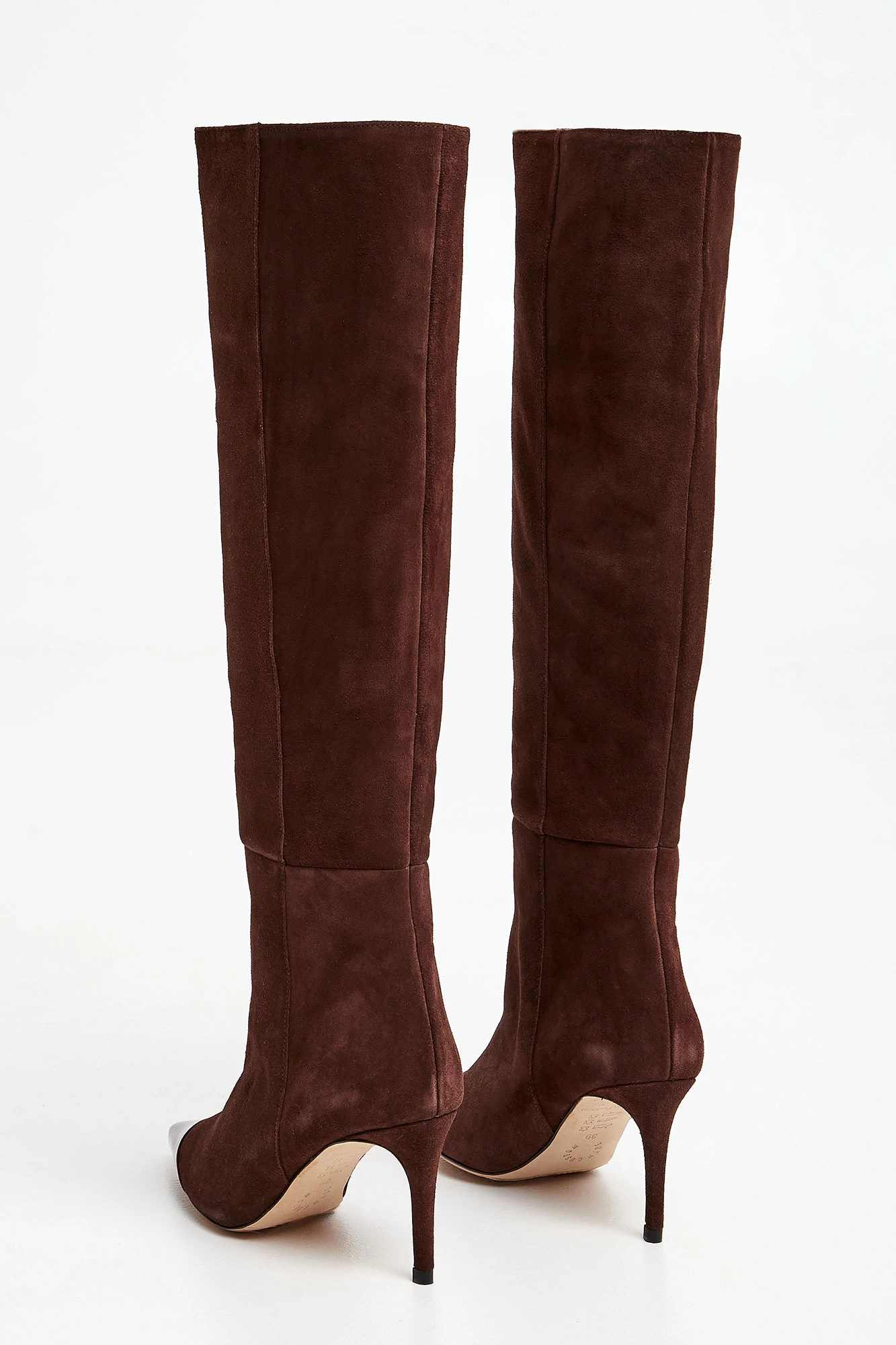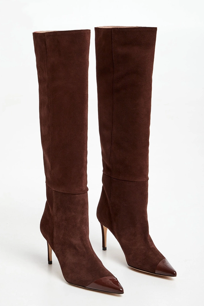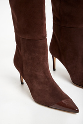 Kozaki na szpilce marki Custommade w ciemnobrązowym kolorze. Wysoka cholewka. Przód zakończony szpiczastym noskiem z połyskującej skóry. Na całości ozdobne przeszycia. Wykonane z naturalnej, zamszowej skóry.