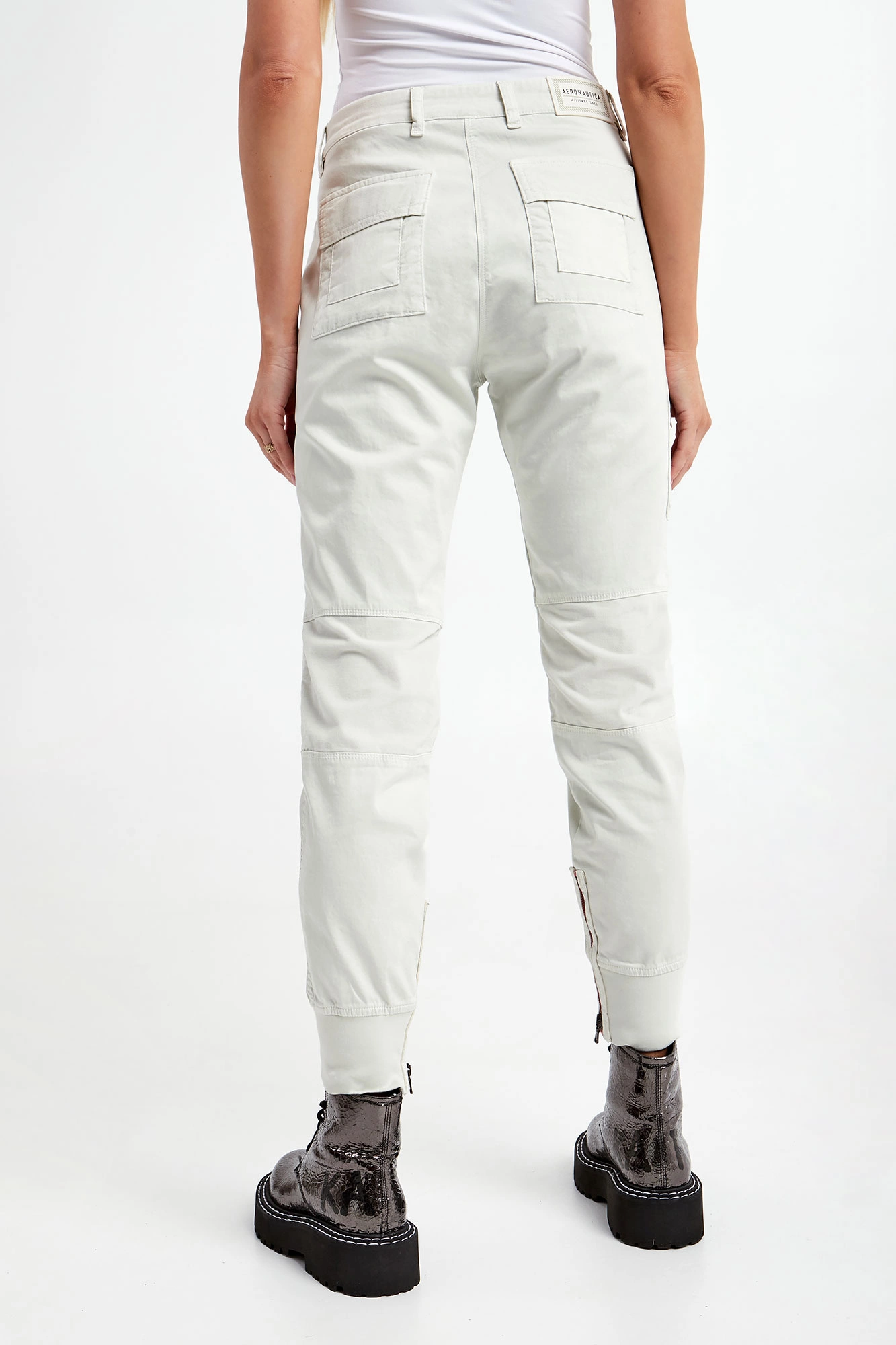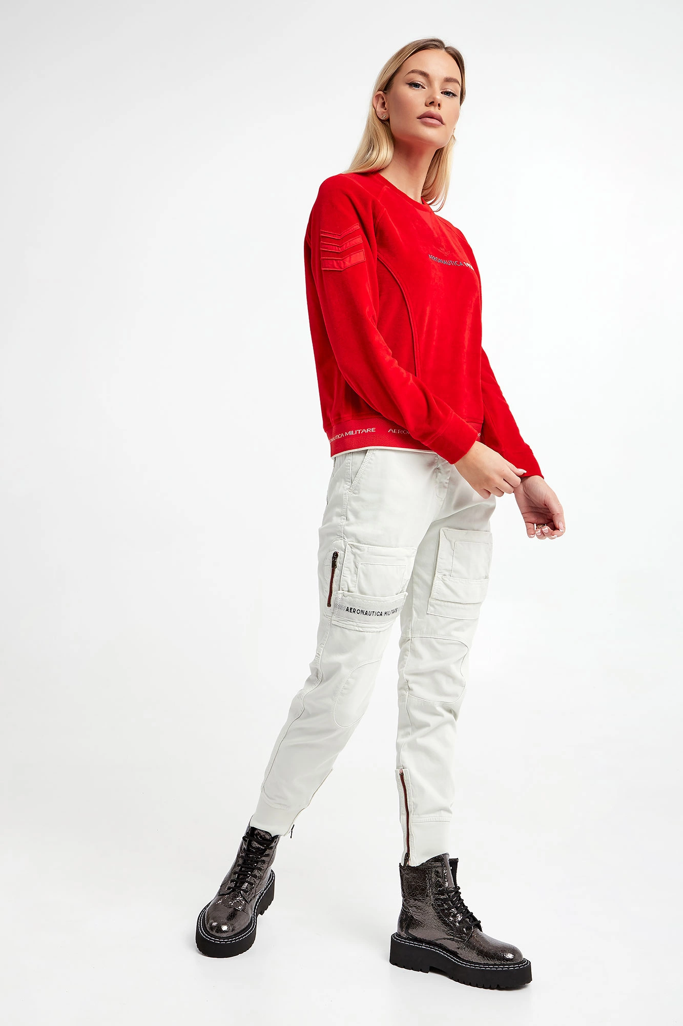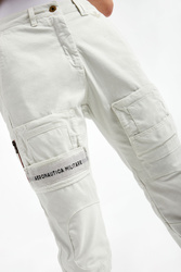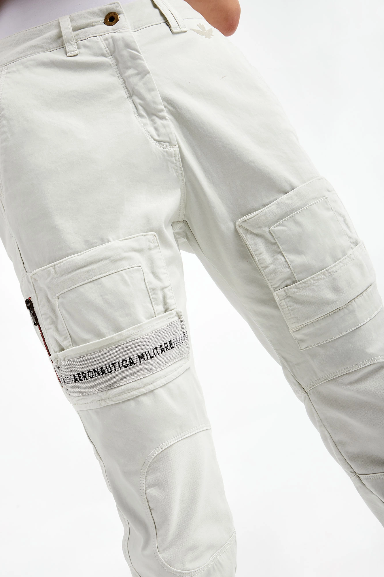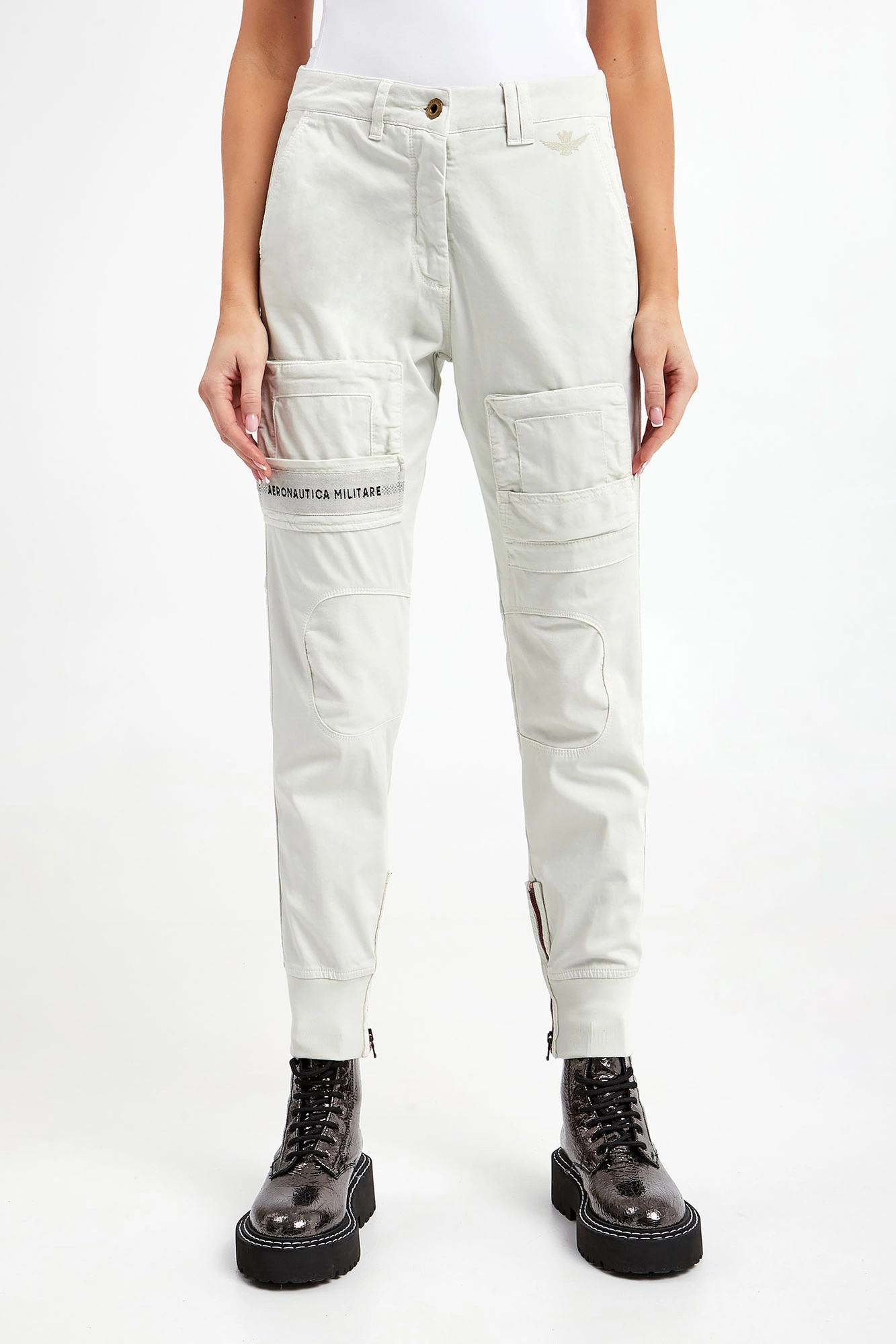 Spodnie cargo marki Aeronautica Militare w beżowym kolorze. Wykonane z bawełny z domieszką elastycznych włókien. Fason jogger z licznymi przeszyciami. Zapinane za pomocą zamka i sygnowanego guzika. Na części sztruksowe wstawki. W pasie szlufki. Model z wieloma kieszeniami. Z przodu haft i naszywka z logo i nazwą marki. Nogawki zakończone ściągaczem i zamkami.
