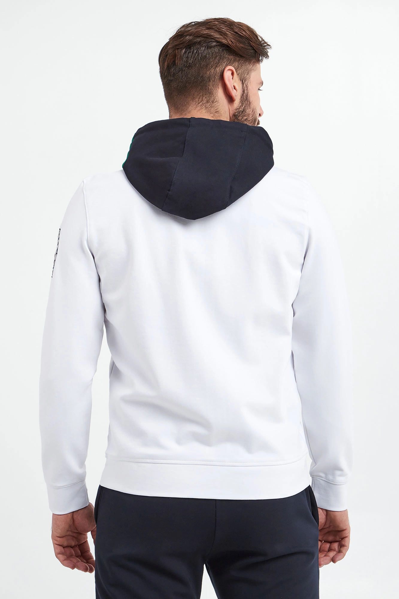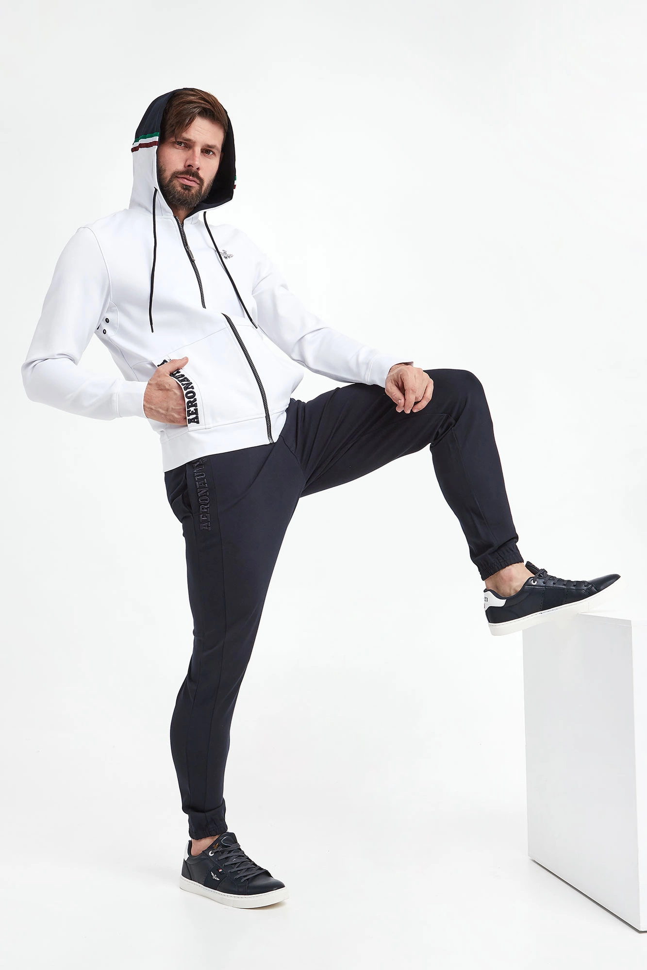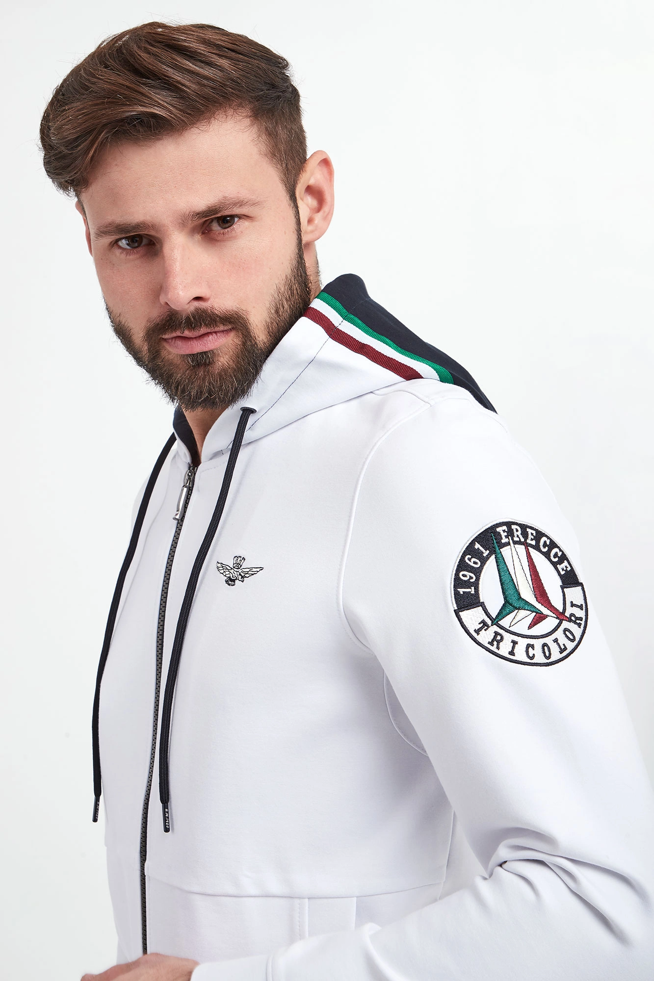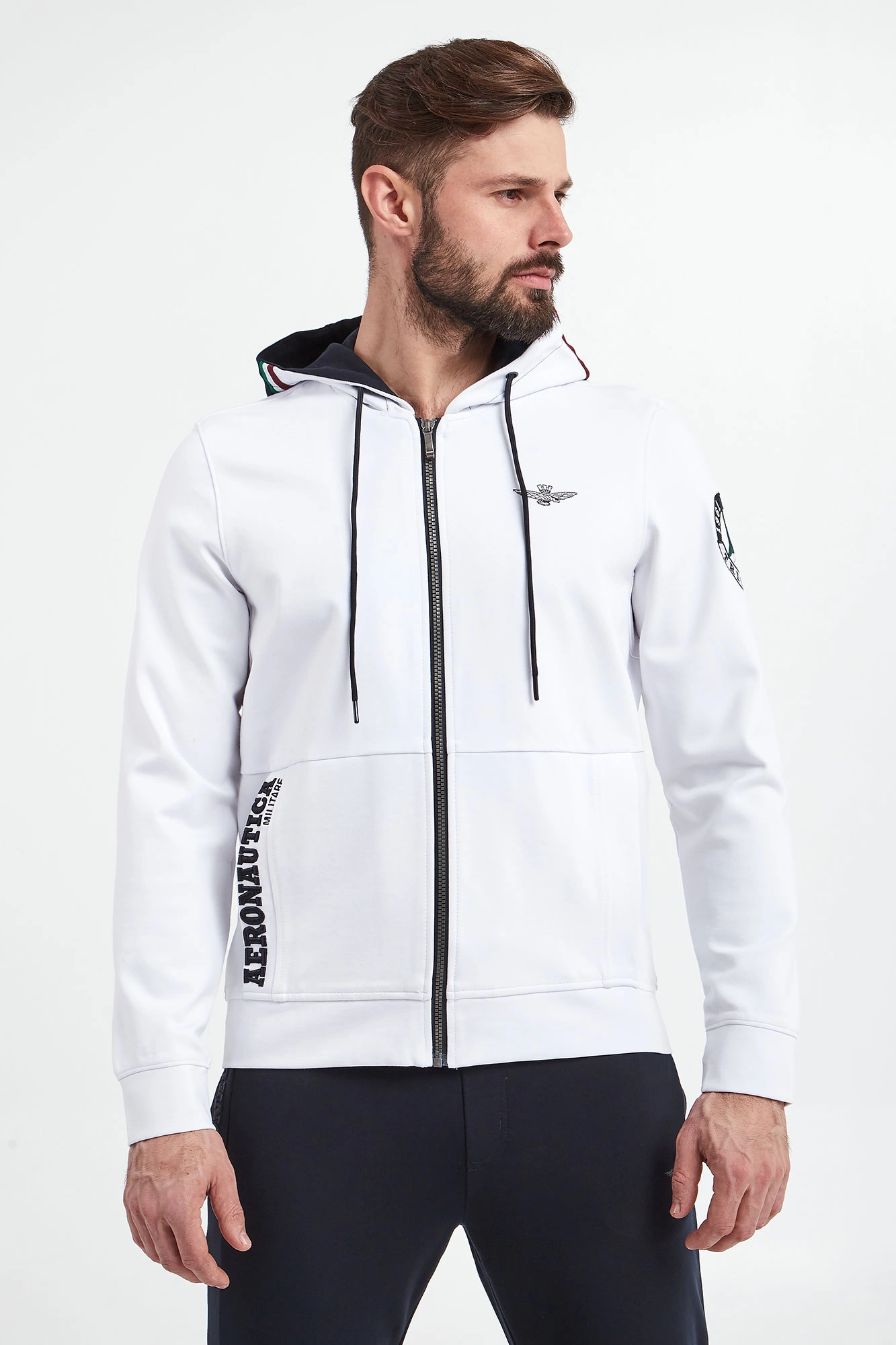 Bluza męska z kapturem marki Aeronautica Militare w białym kolorze. Przyjemna w dotyku, matowa tkanina wykonana z regenerowanych włókien celulozowych drzew bukowych. Czarny kaptur z wielokolorowym lampasem, regulowany za pomocą troczków. Z przodu minimalistyczne, haftowane logo marki. Na ramieniu naszywka z motywem militarnym. Model z dwiema otwartymi kieszeniami. Na kieszeni gruby haftowany napis z nazwą marki. Zapinana za pomocą kontrastowego, czarnego zamka. Wywietrzniki pod pachami. Dół i rękawy wykończone elastycznym ściągaczem. Fason typu regular.