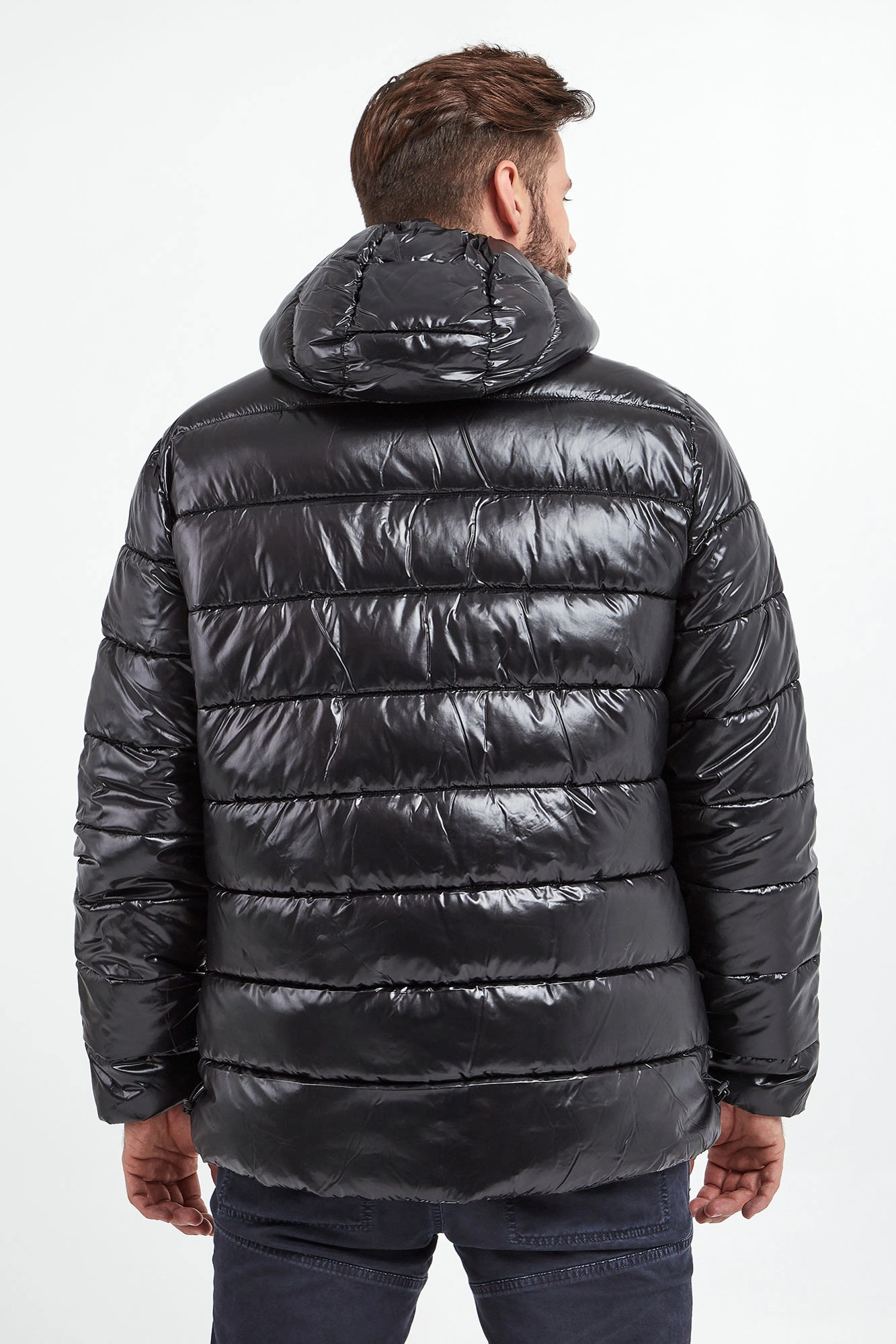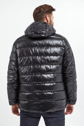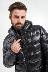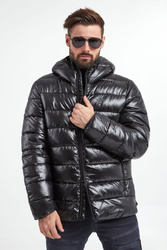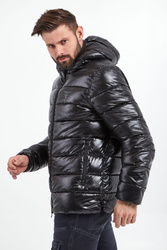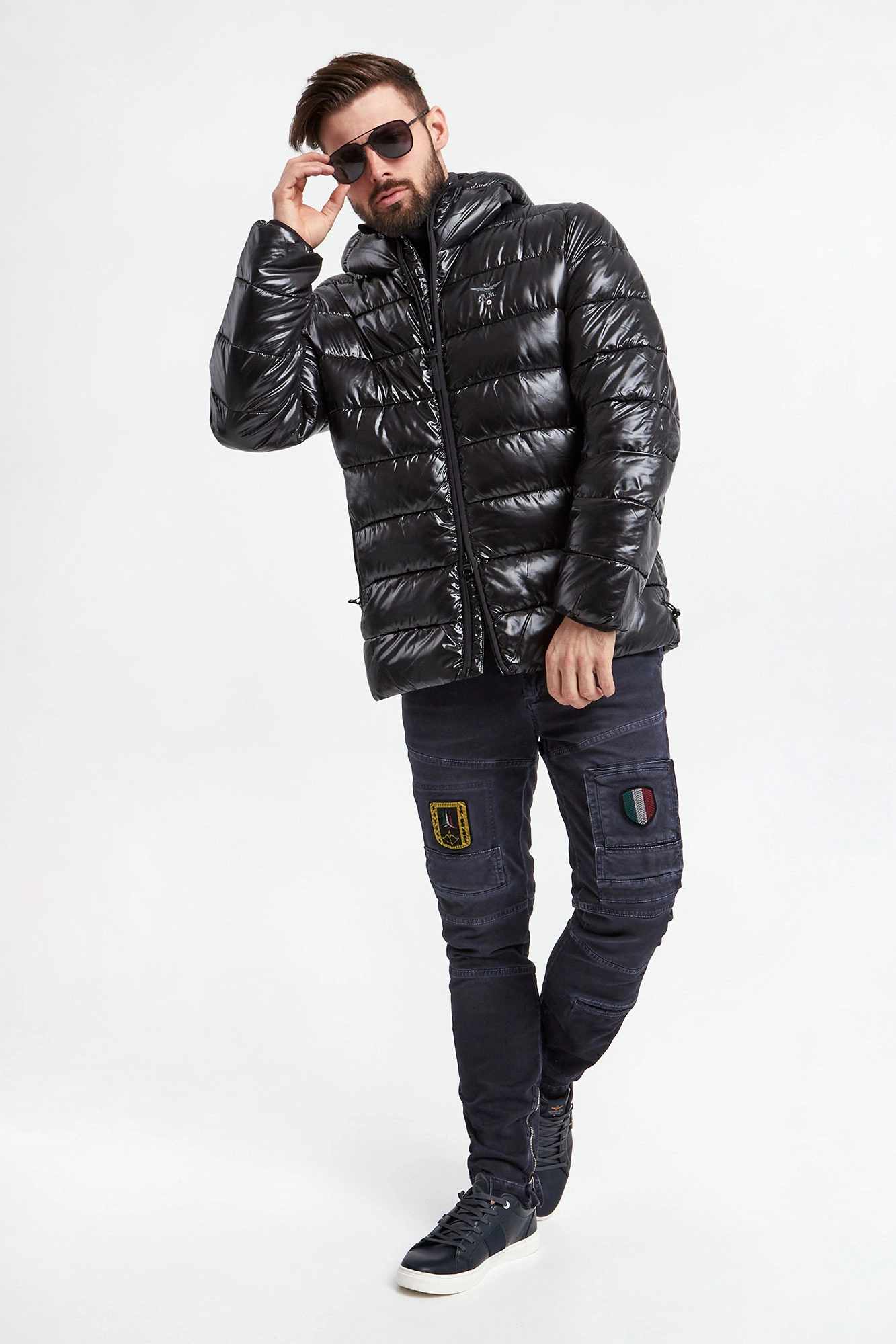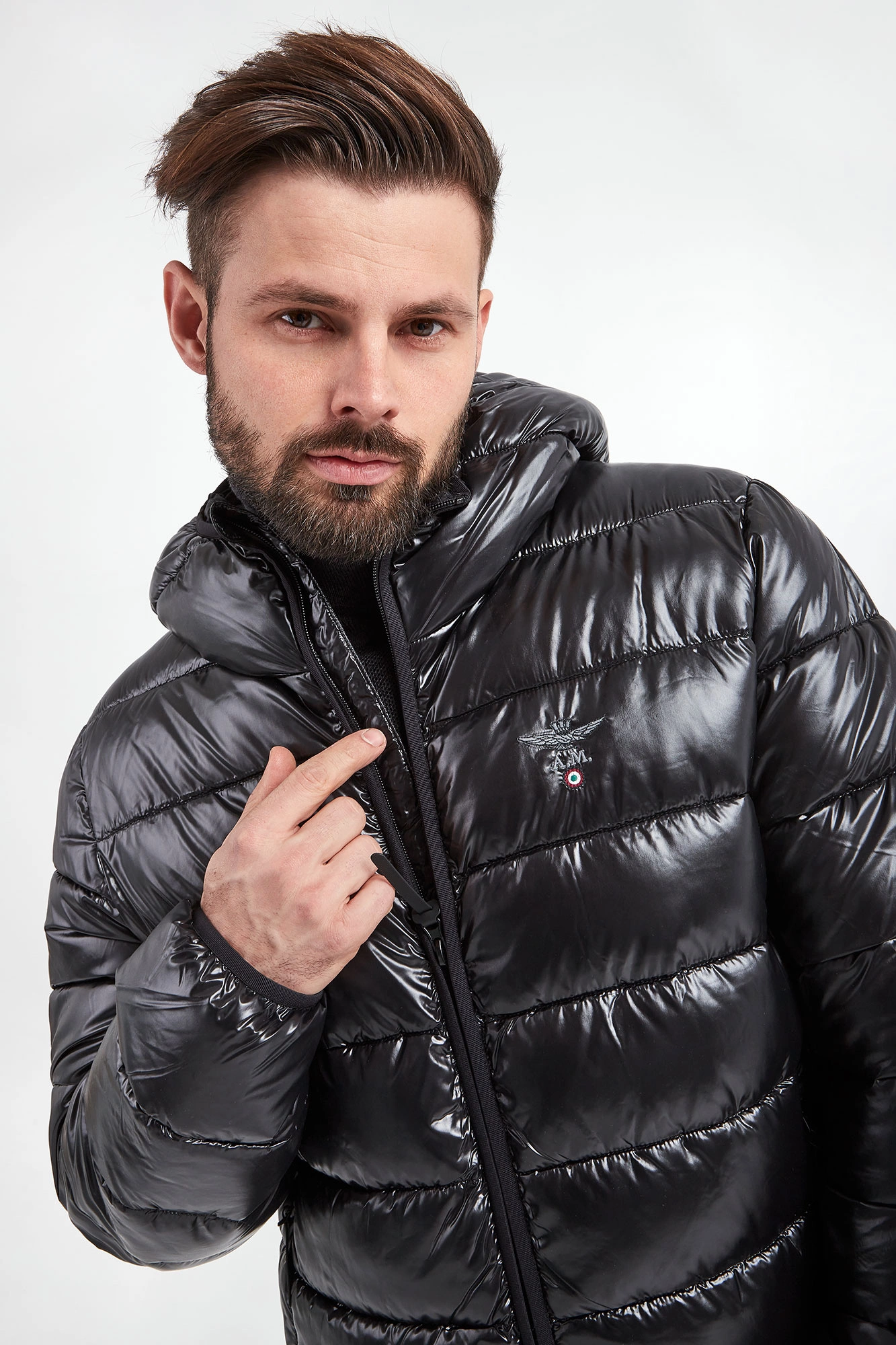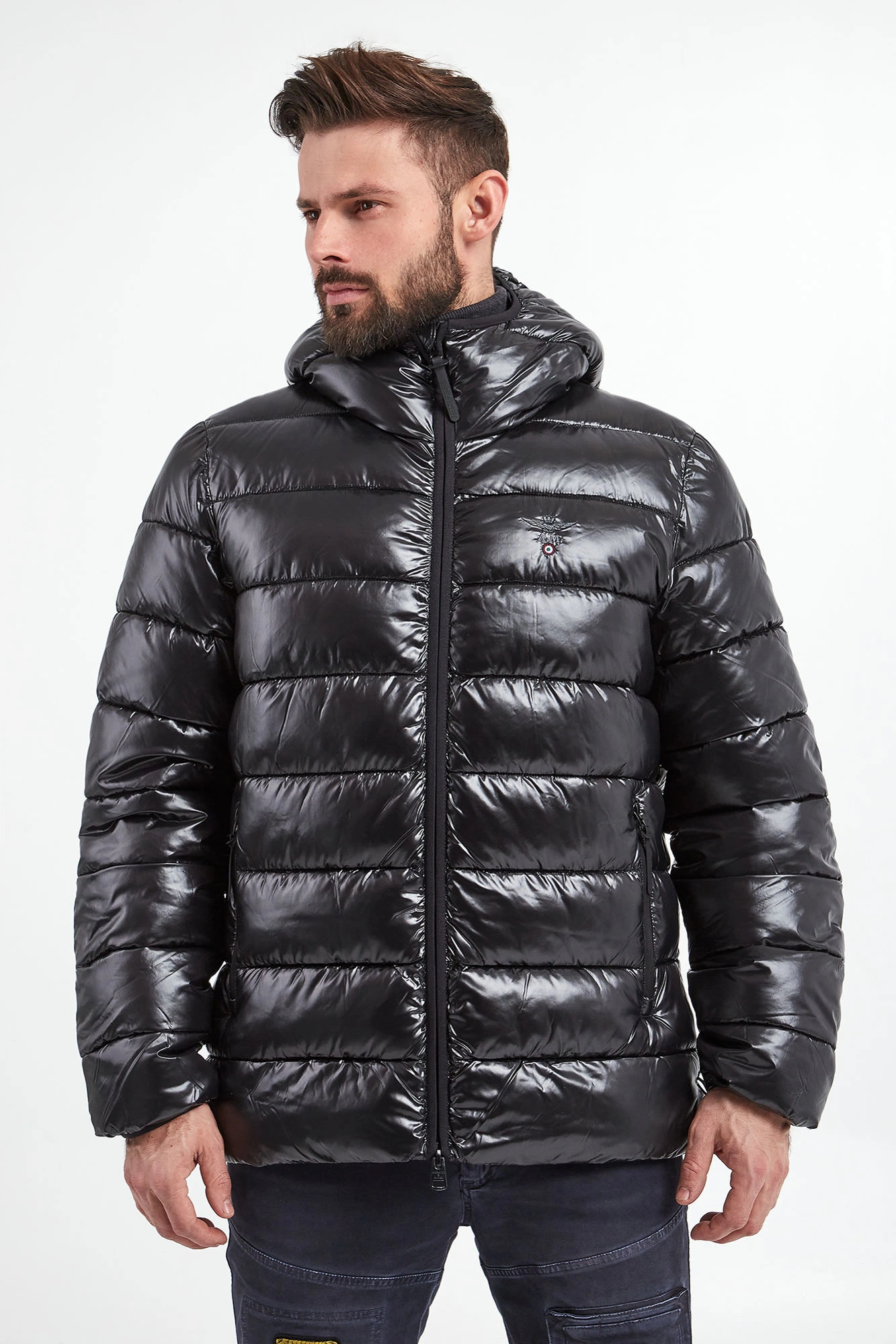 Kurtka pikowana marki Aeronautica Militare w czarnym kolorze. Z kapturem. Na całości poziome pikowania. Syntetyczne wypełnienie. Na piersi haft z logo marki. Model z dwiema kieszeniami na suwak. Zapinana za pomocą dwukierunkowego zamka. Wewnątrz dodatkowe kieszenie. Regulowany dół za pomocą troczków ze stoperami. Po bokach delikatne wycięcia. Wykończona czarną lamówką. Fason typu regular.