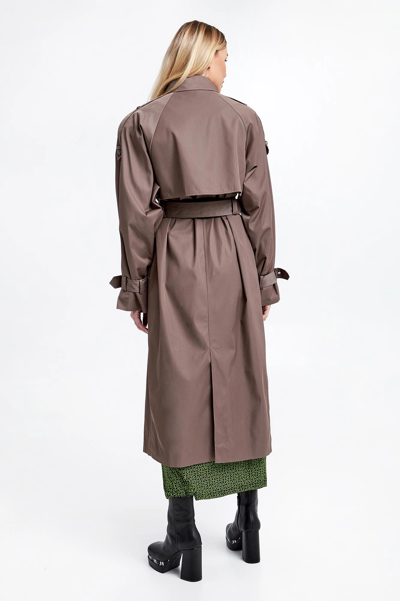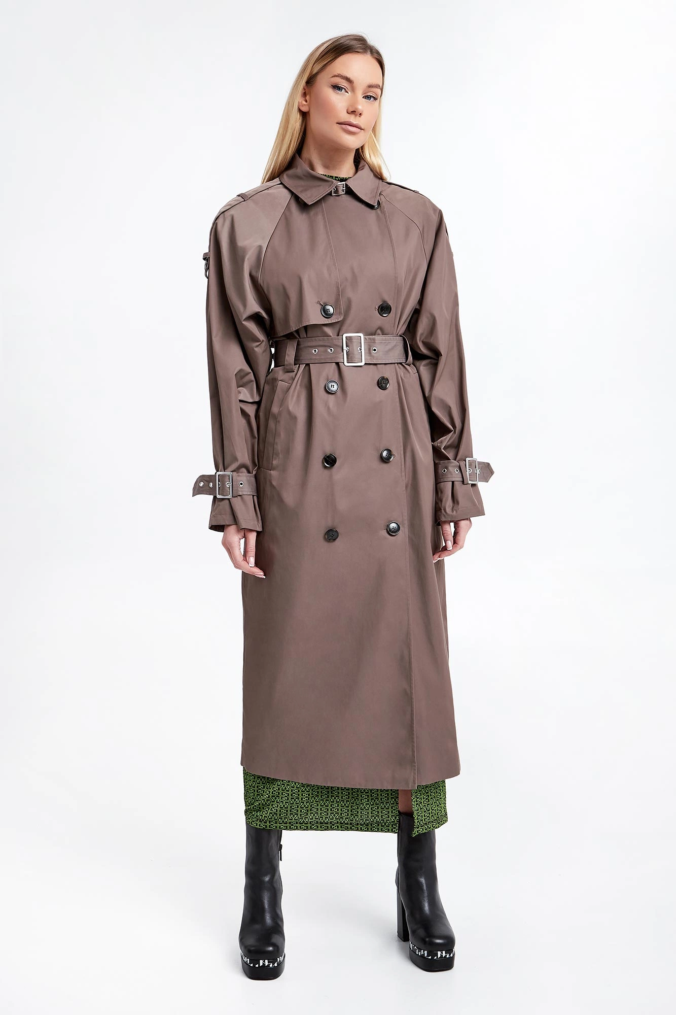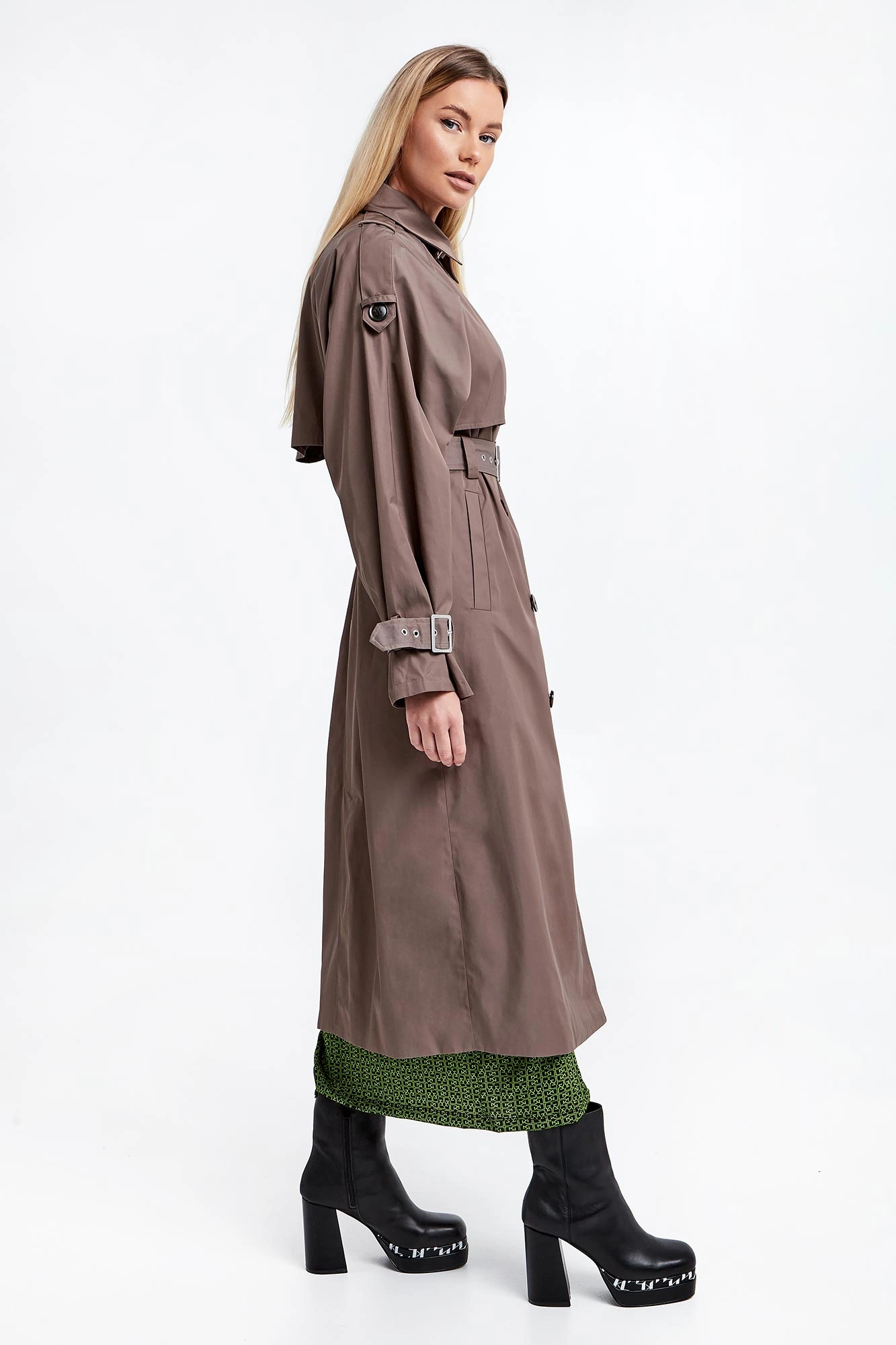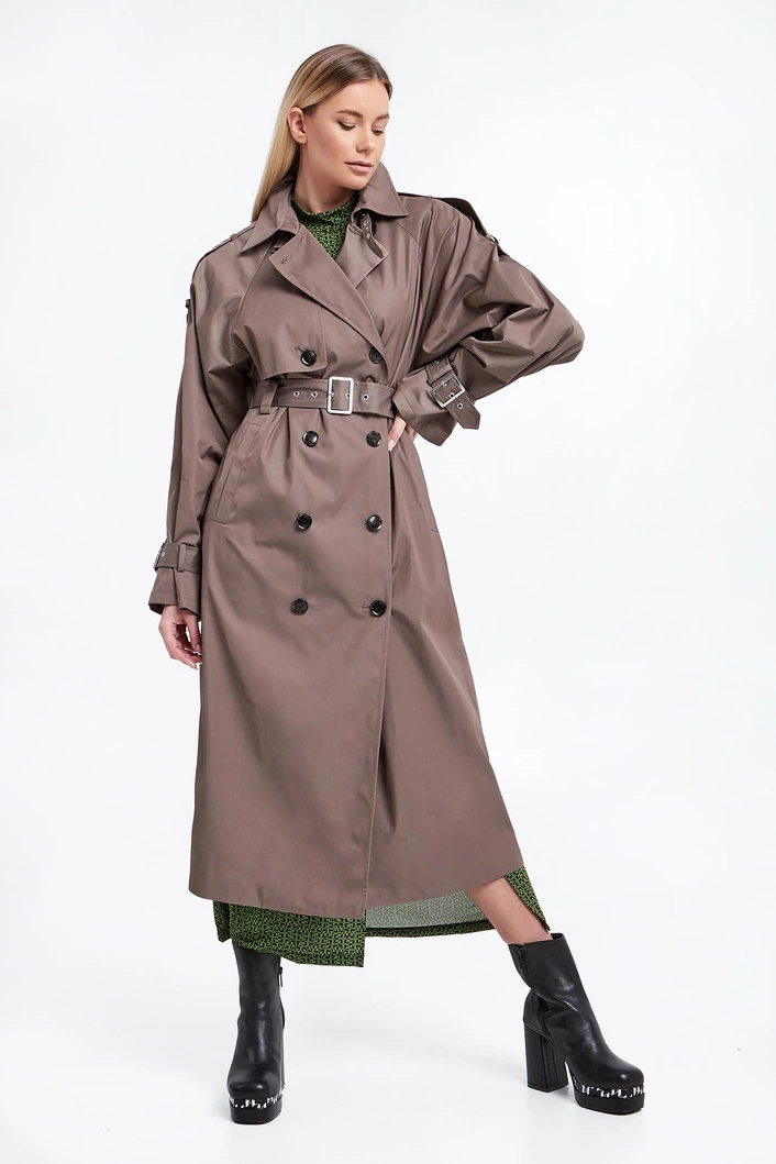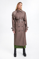 Trencz marki Gestuz w szaro-brązowym kolorze. Odporny na wilgoć dzięki powłoce Scotchgard®. Zapinany za pomocą dwurzędowych guzików. Dekolt wykończony klasycznym kołnierzem i zapinanym paskiem. Z przodu i z tyłu charakterystyczna dla trencza patka. Reglanowy krój ramion, na nich pagony zapinane za pomocą guzika. Długie rękawy wykończone paskiem z regulowana klamrą w srebrnym kolorze. Model z dwoma wpuszczanymi kieszeniami. Sygnowana podszewka. Fason typu relaxed.