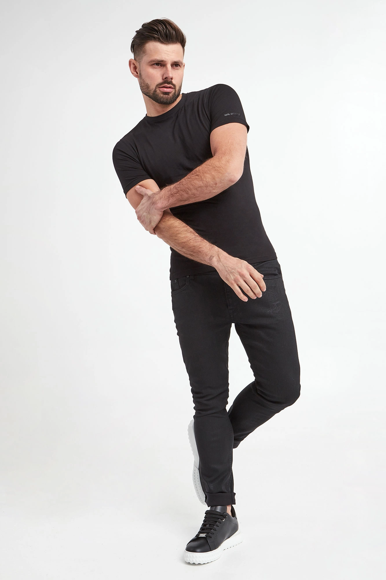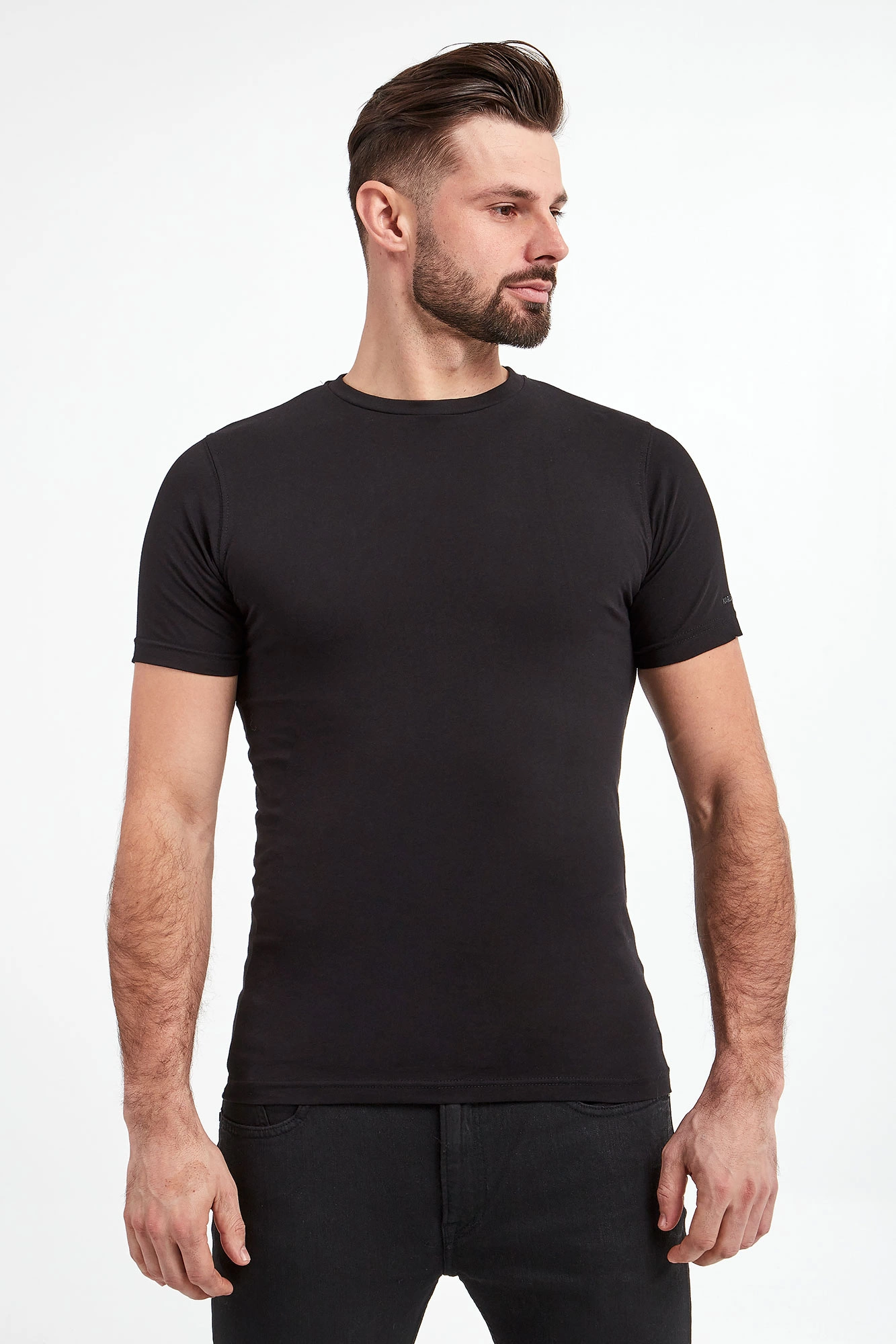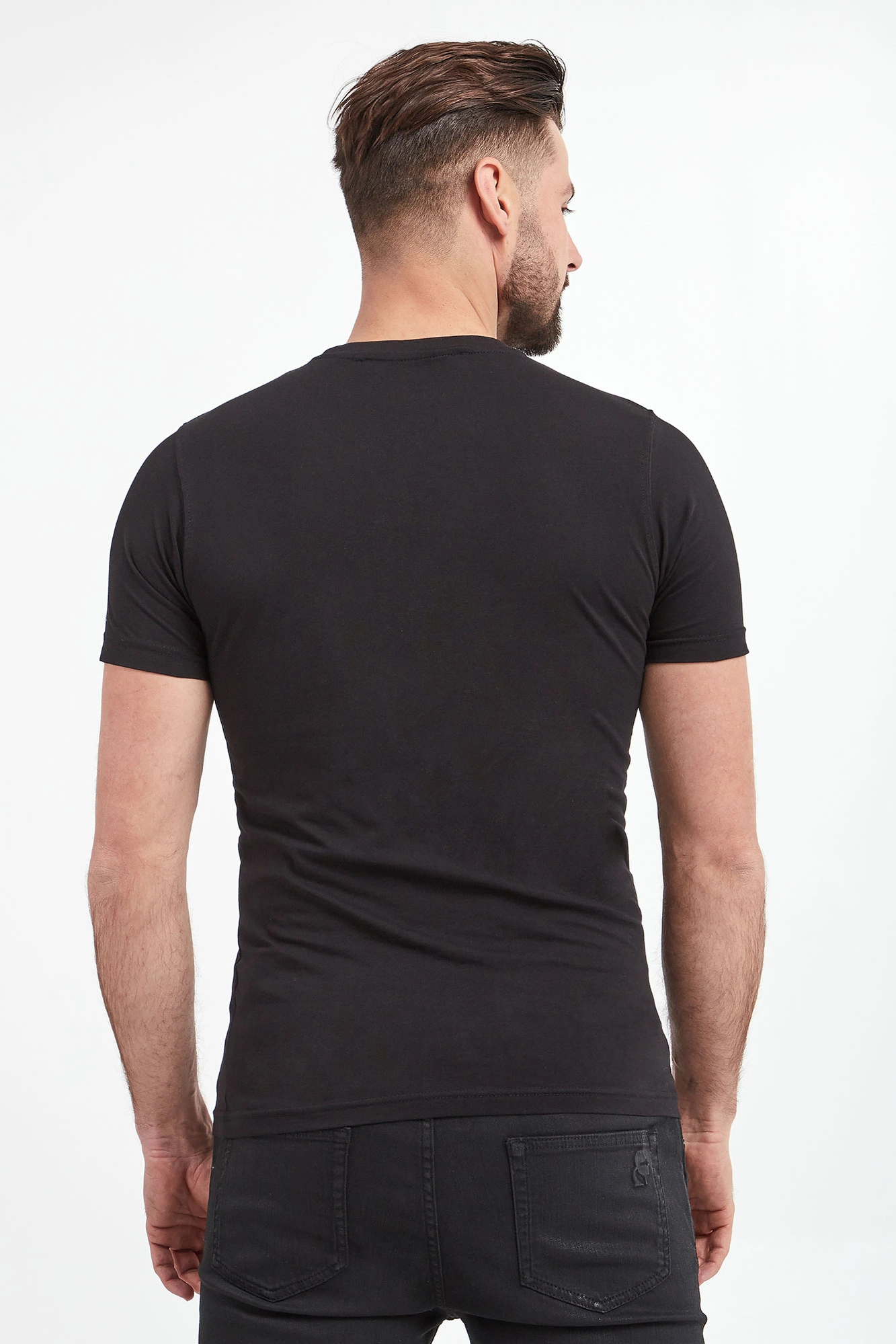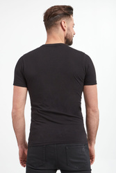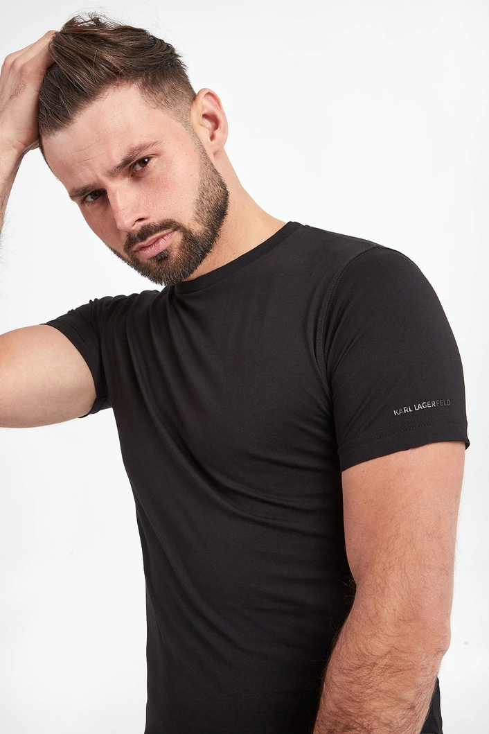 T-shirt męski 2-pak marki Karl Lagerfeld w czarnym kolorze. Wykonany ze stuprocentowej bawełny. Dekolt typu o-neck wykończony ściągaczem. Na lewym rękawie gumowany nadruk z nazwa marki w kolorze t-shirtu. Fason typu slim. Idealna baza do wielu stylizacji.