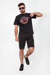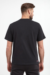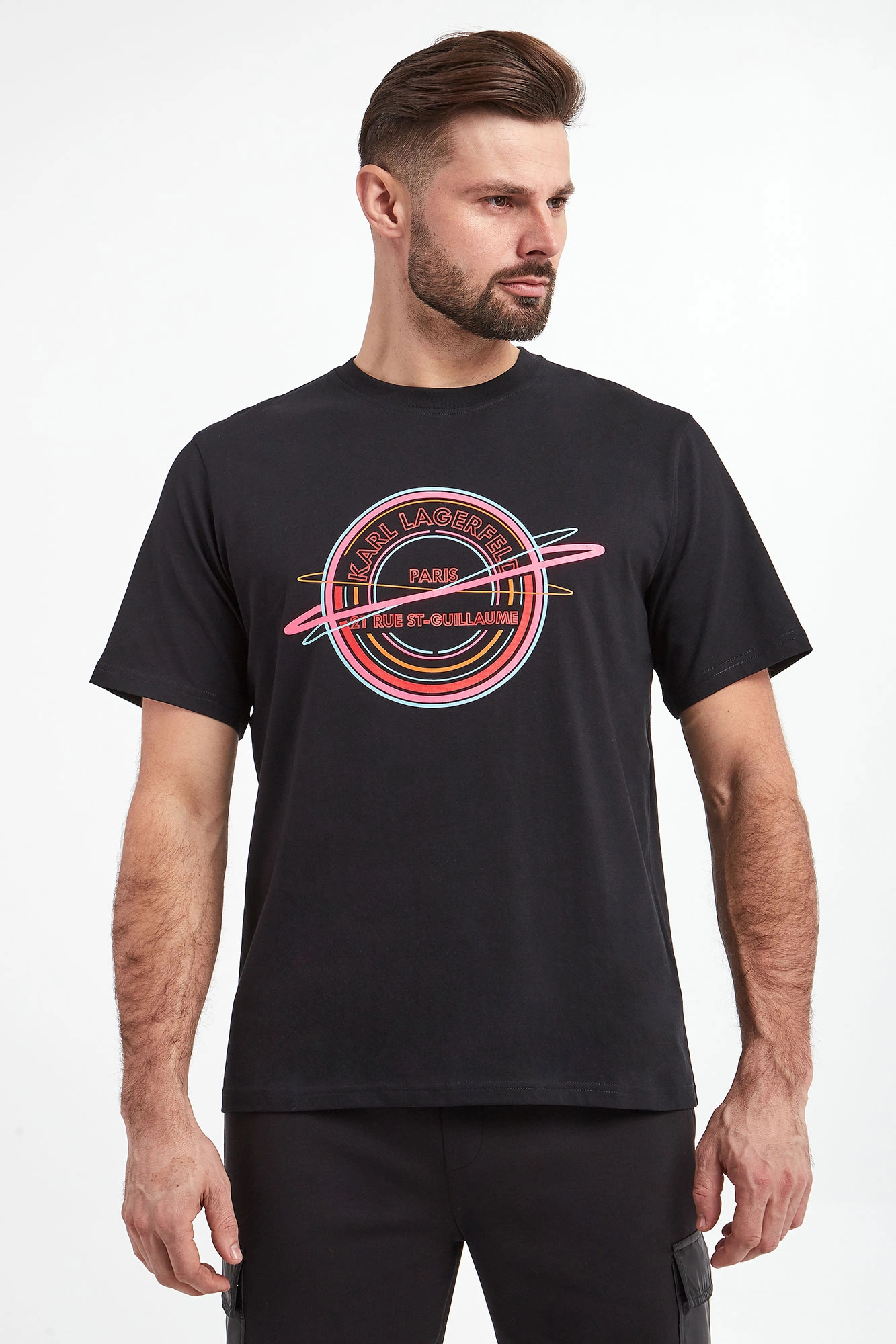 T-shirt marki Karl Lagerfeld w czarnym kolorze. Wykonany z czystej bawełny. Model pochodzi z linii "Karl Cares", która wspiera zrównoważoną modę. Dekolt typu o-neck wykończony ściągaczem. Na piersi nadruk inspirowany przestrzenią międzygalaktyczną logo Rue St-Guillaume. Rękawy i dół wykończone przeszyciami. Z tyłu nadruk z nazwą marki w różowym kolorze. Fason typu regular.