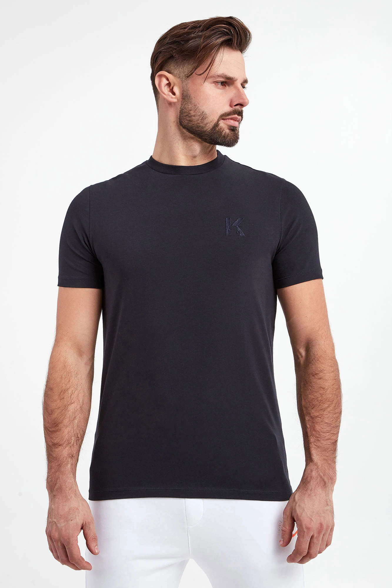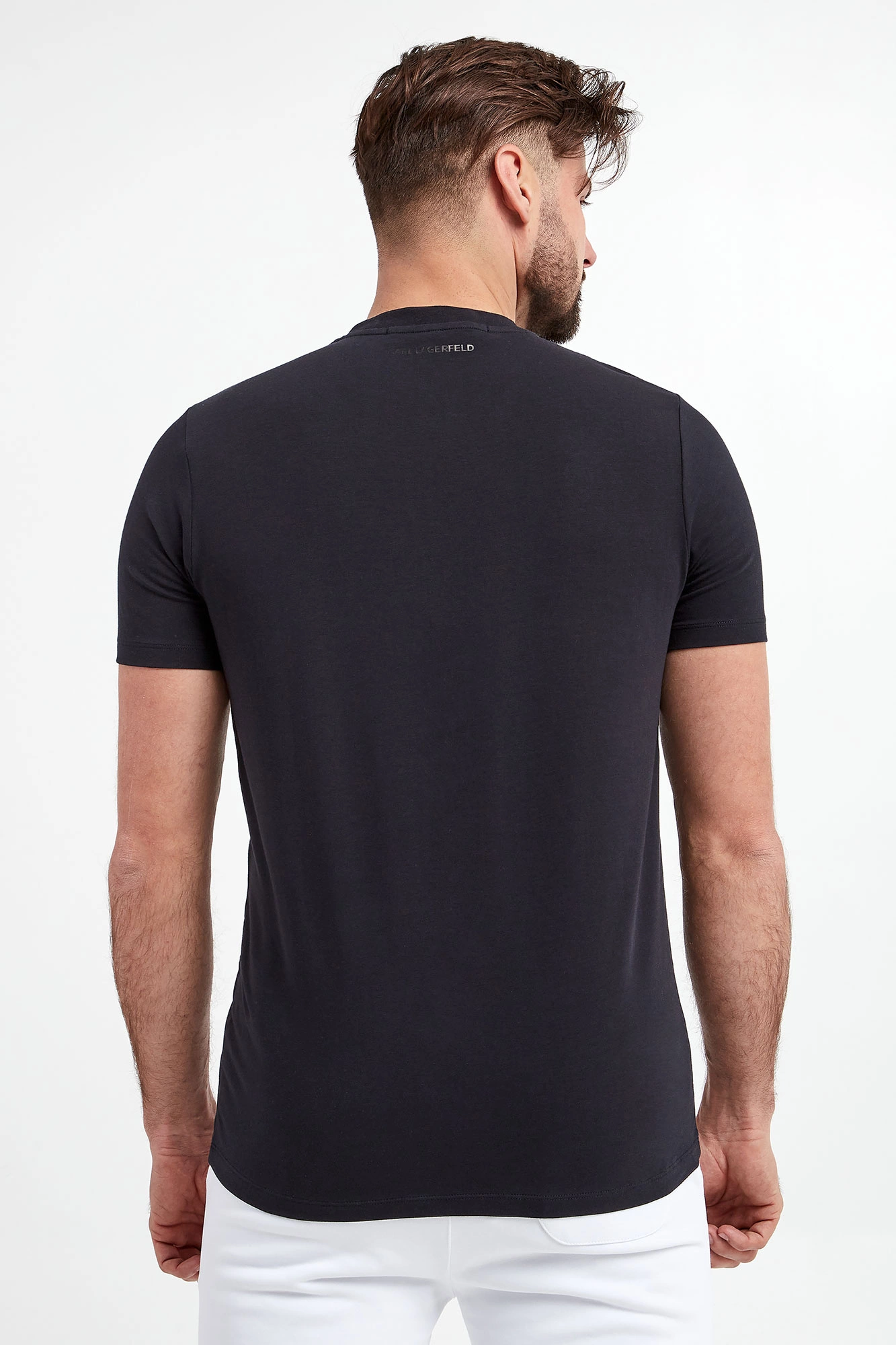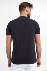 T-shirt marki Karl Lagerfeld w kolorze granatowym. Wykonany z elastycznej bawełny. Model pochodzi z linii "Karl Cares", która wspiera zrównoważoną modę. Dekolt typu o-neck wykończony ściągaczem. Na piersi haft z logo marki. Z tyłu na linii karku nadruk w postaci nazwy marki. Krótkie rękawy i dół wykończone przeszyciem. Fason typu slim.