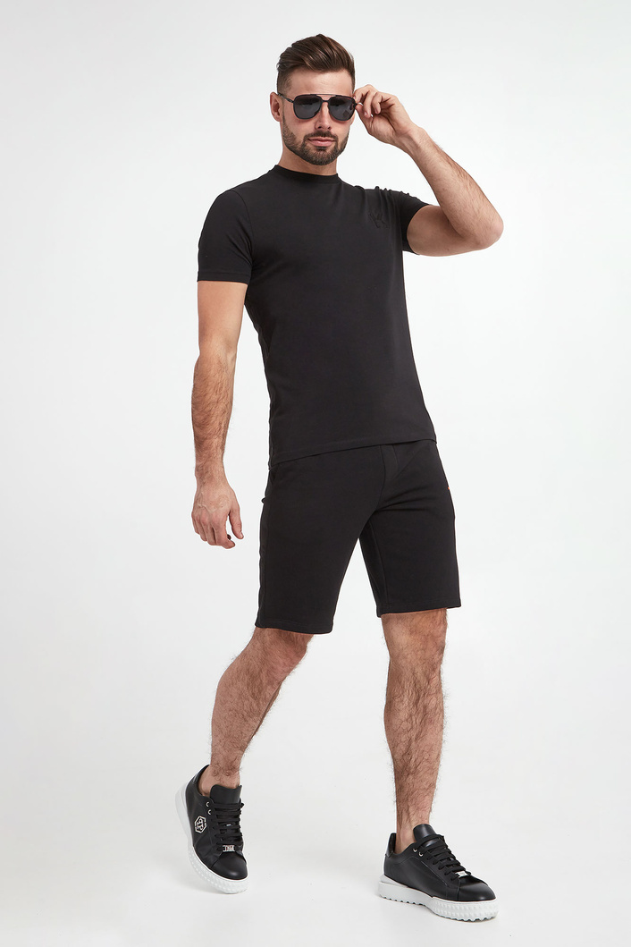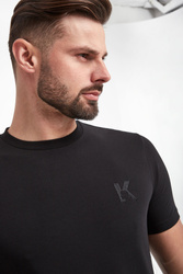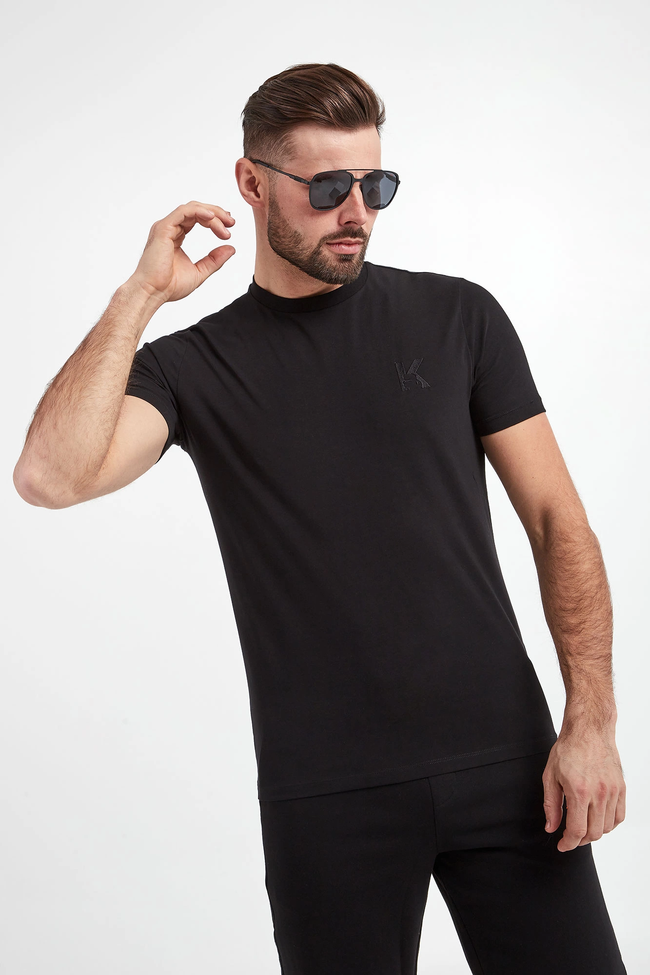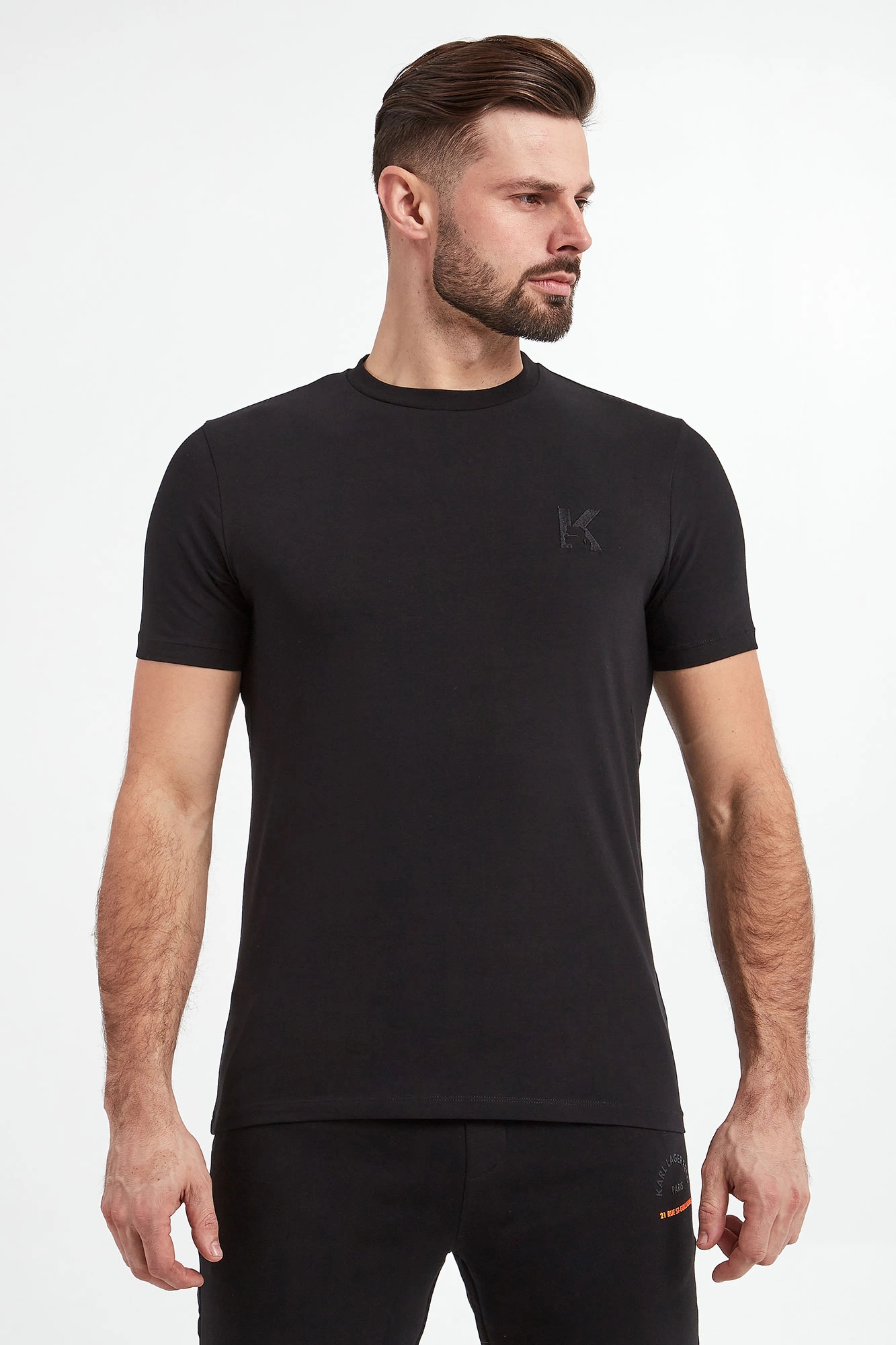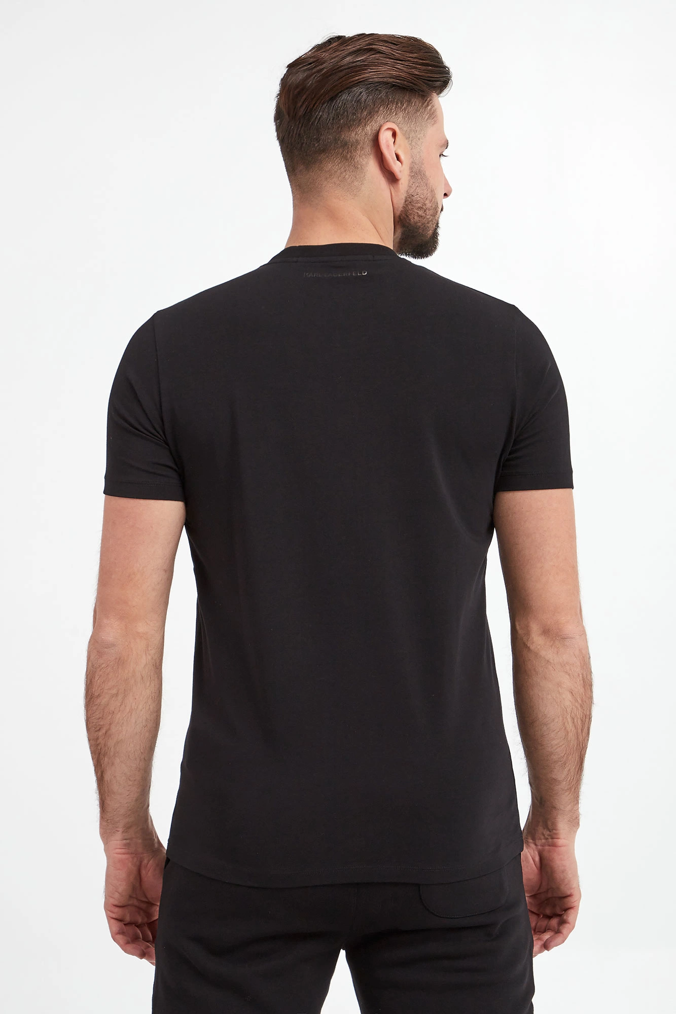T-shirt marki Karl Lagerfeld w czarnym kolorze. Wykonany z elastycznej bawełny. Model pochodzi z linii "Karl Cares", która wspiera zrównoważoną modę. Dekolt typu o-neck wykończony ściągaczem. Na piersi haft z logo marki. Z tyłu na linii karku nadruk w postaci nazwy marki. Krótkie rękawy i dół wykończone przeszyciem. Fason typu slim.